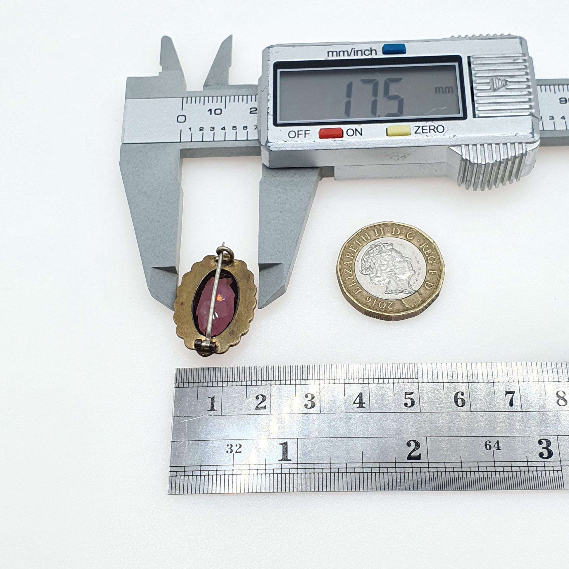 DESCRIPTION: A beautiful antique Victorian gold gilt brooch, adorned with an amethyst tone paste and a faux seed pearl border. The brooch weighs approx. 4.80g and the size dimensions are in the latter photos. The paste has some marks on the face and the gold gilt has worn due to age and use.