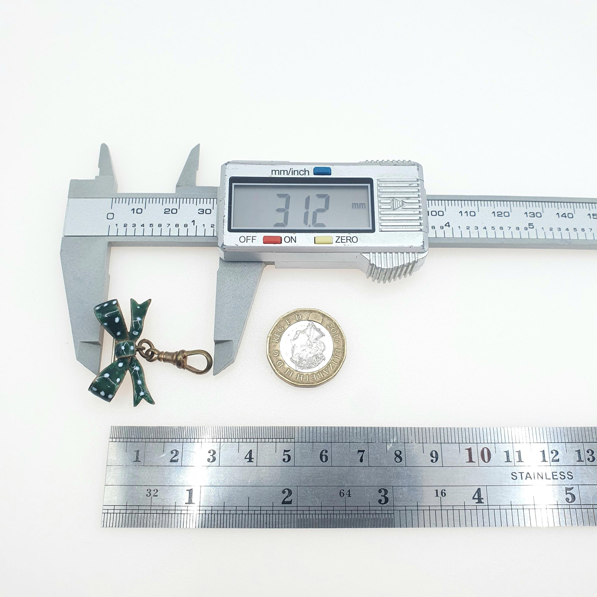 DESCRIPTION: A cute green and white polka dot, enamel, base metal bow brooch/nurse fob with a gold gilt dog clip attached. The brooch weighs approx. 4.98g and size/dimensions can be found in the latter photos. PLEASE NOTE: Some of the enamel is chipped and worn (see photos/video).