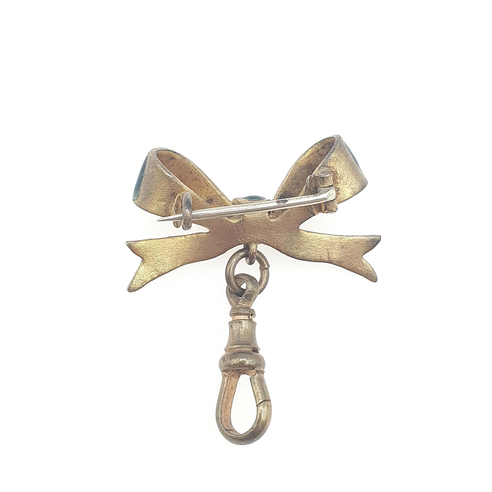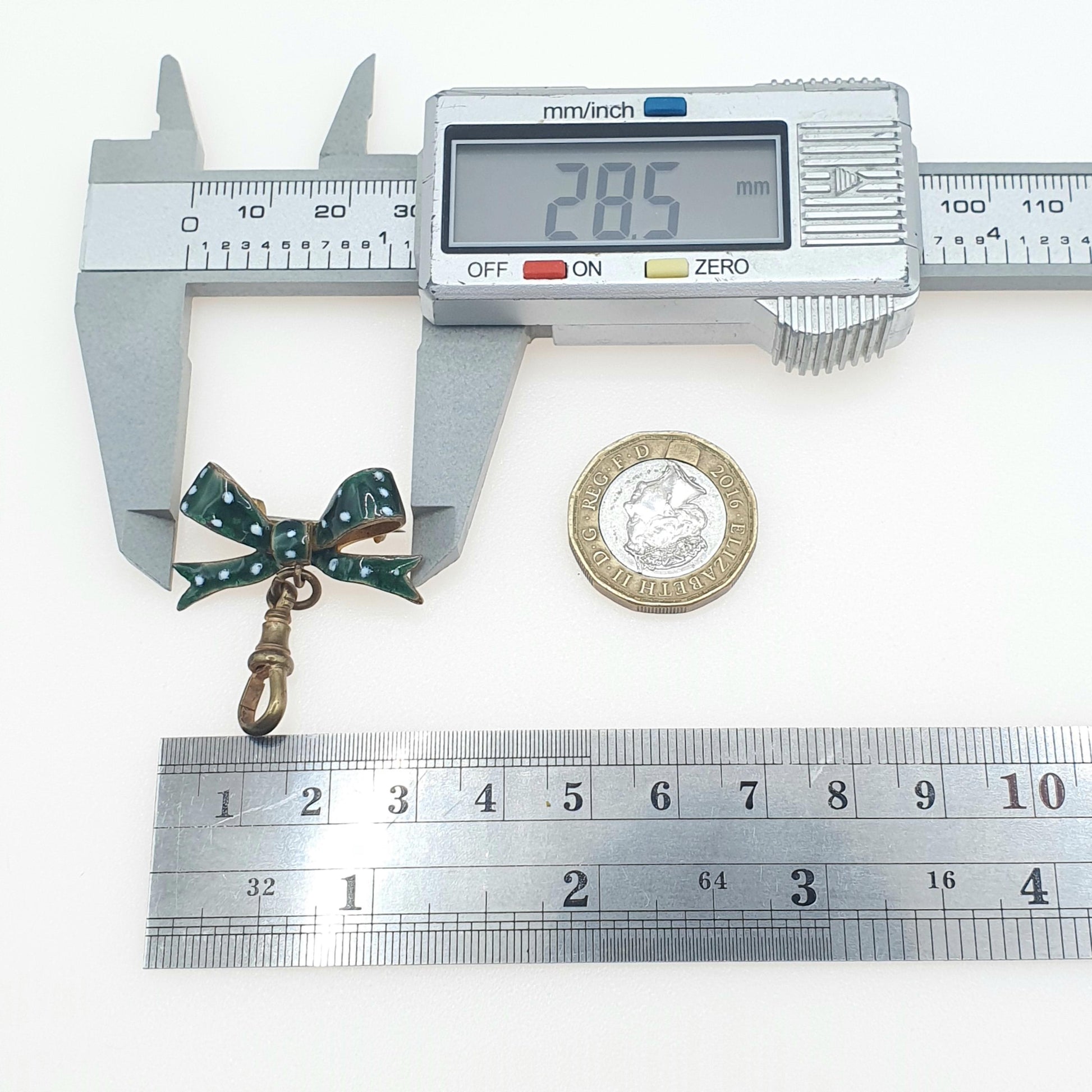 Antique Victorian Gold Gilt Enamel Bow Brooch with Dog Clip Green White Polka Dot Womens Ladies Jewelry Jewellery Vintage