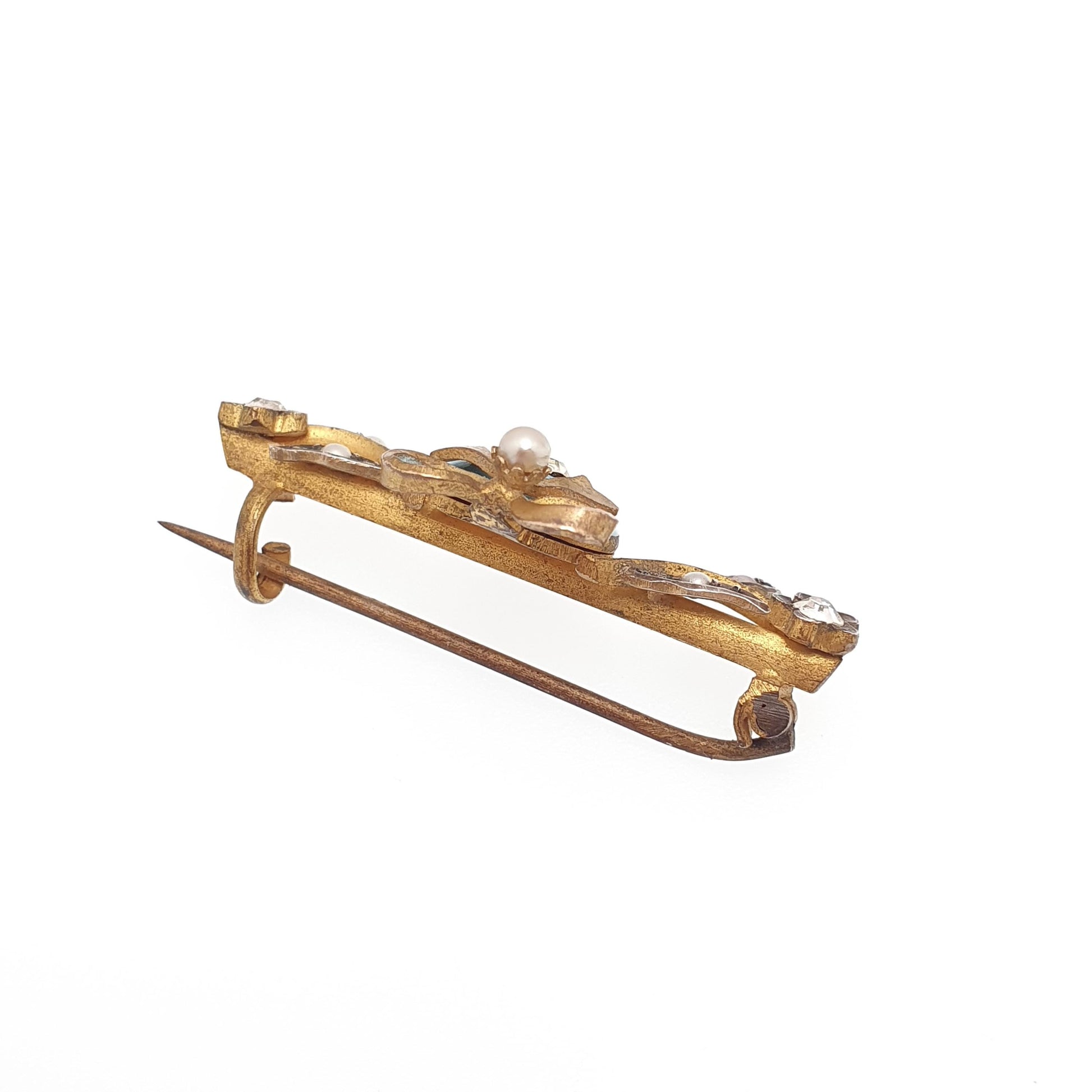 DESCRIPTION: A rare and gorgeous antique Victorian sweetheart bow brooch, adorned with sky blue enamel, diamond tone pastes and faux pearls. The item is made from gold gilt base metal. It weighs approx. 4.34g and the size dimensions are in the later photos. As to be expected with age and use, the enamel has some marks on it and the gold gilt finish has worn in areas.