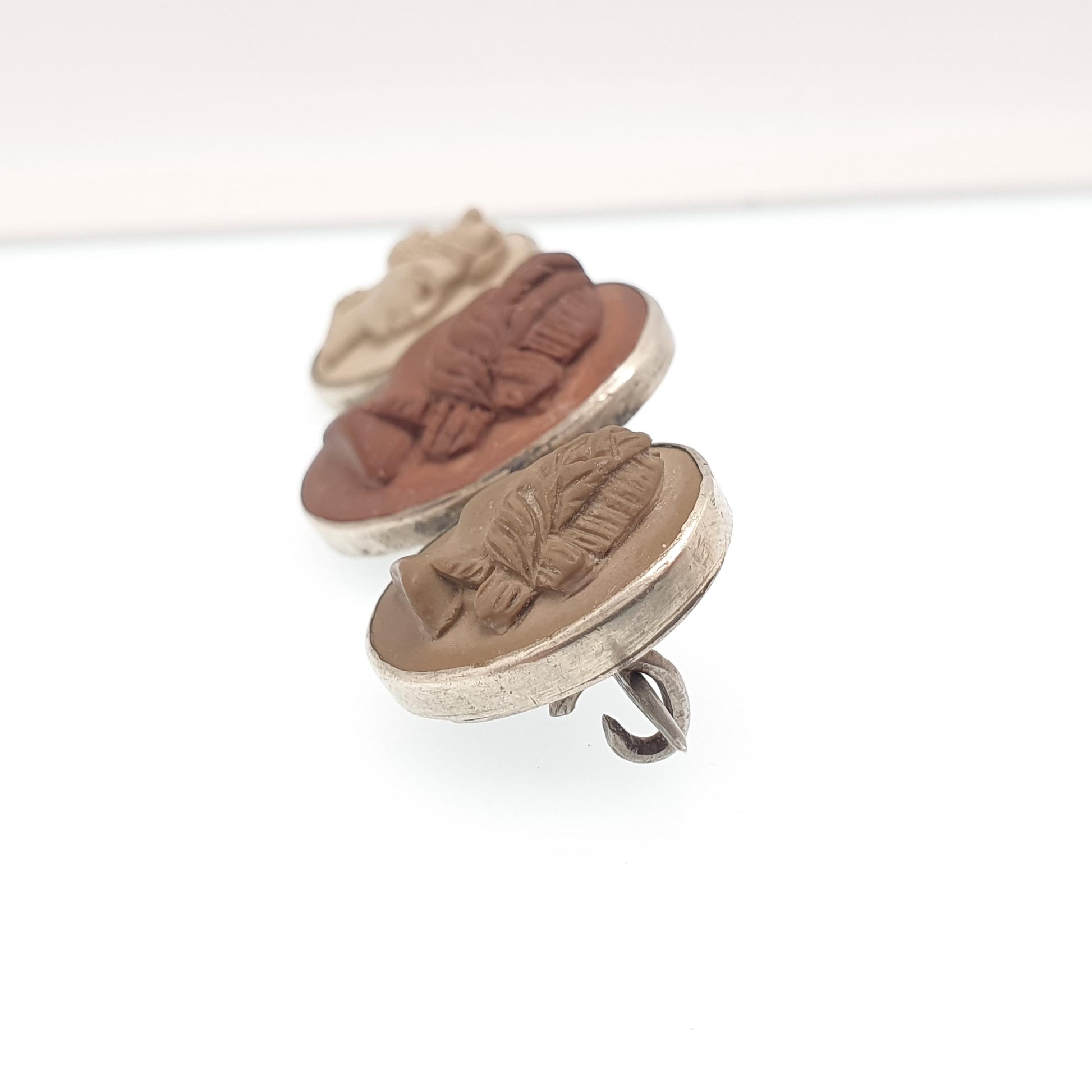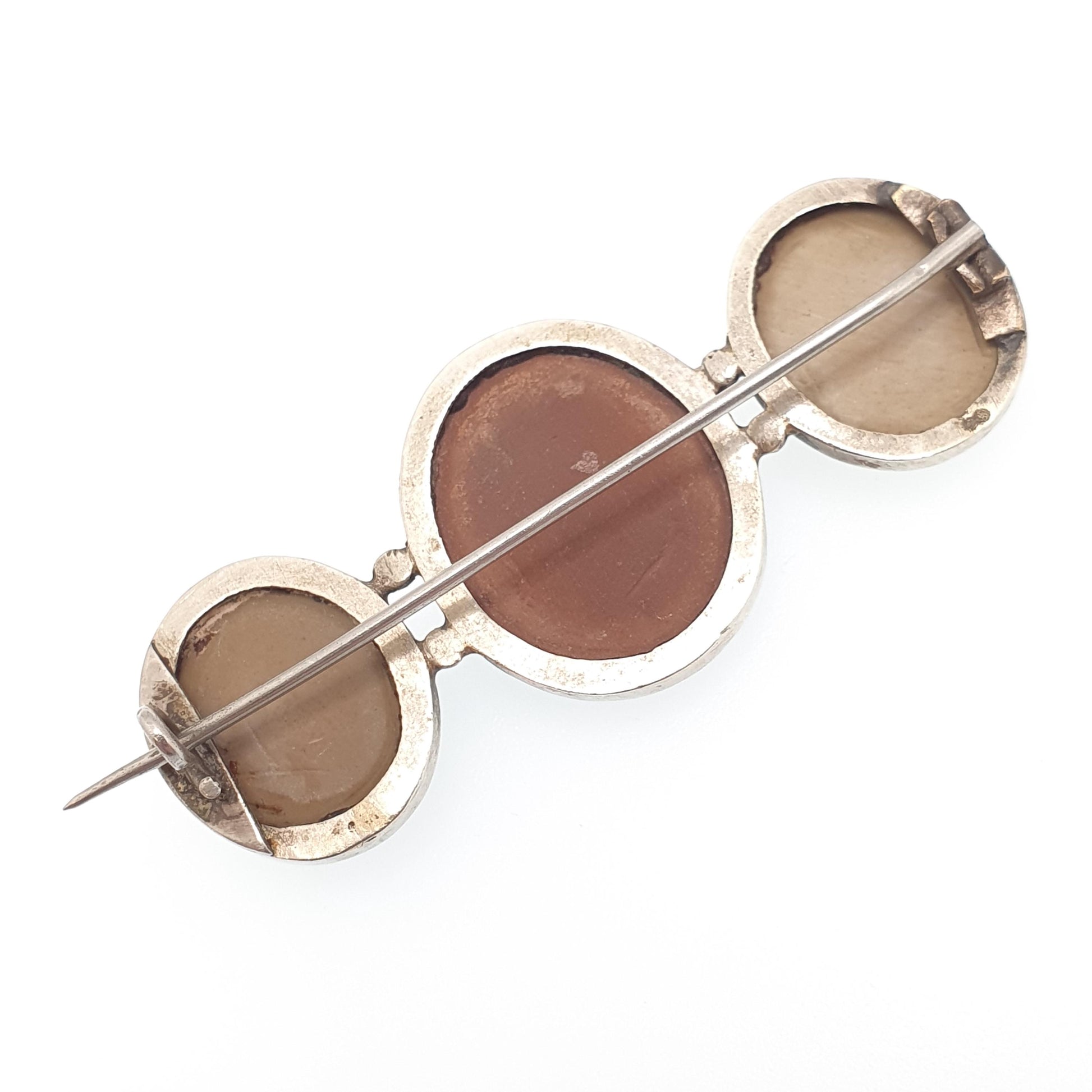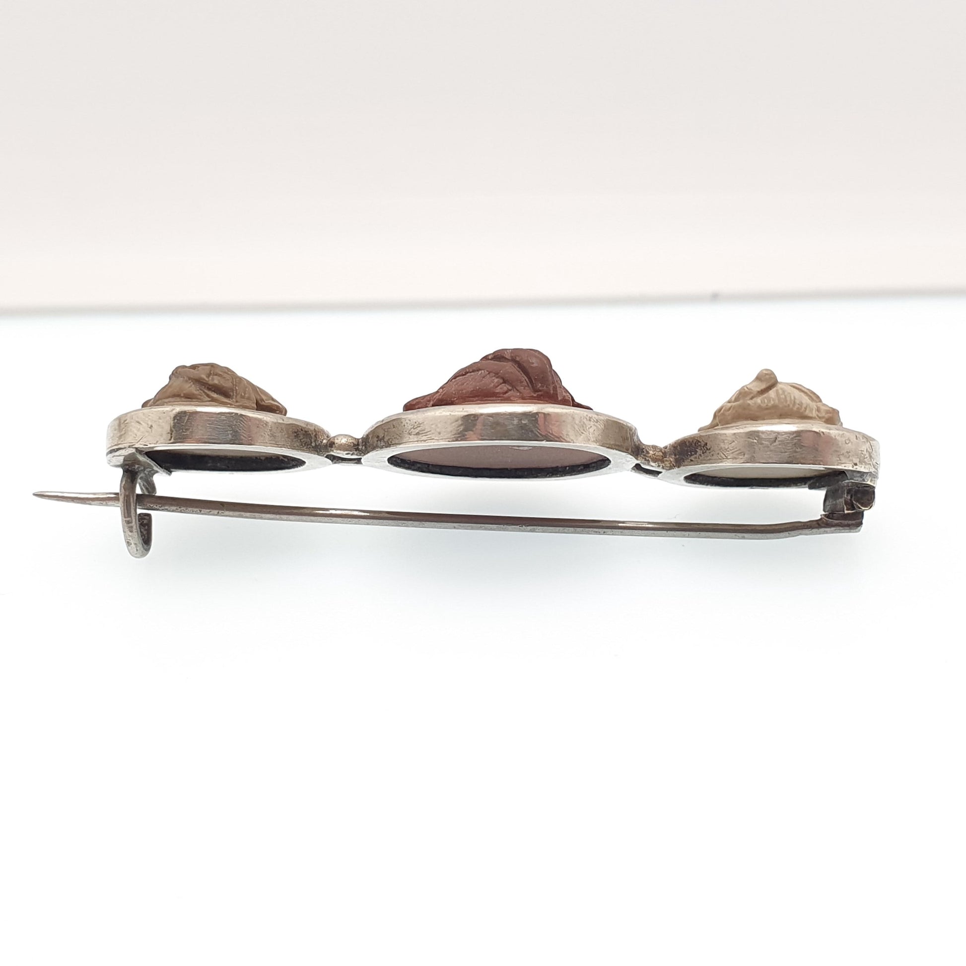 Antique Victorian Lava Cameo Brooch Triple High Relief Detailed Hand Carved Silver Tone Base Metal Vintage Jewelry Jewellery