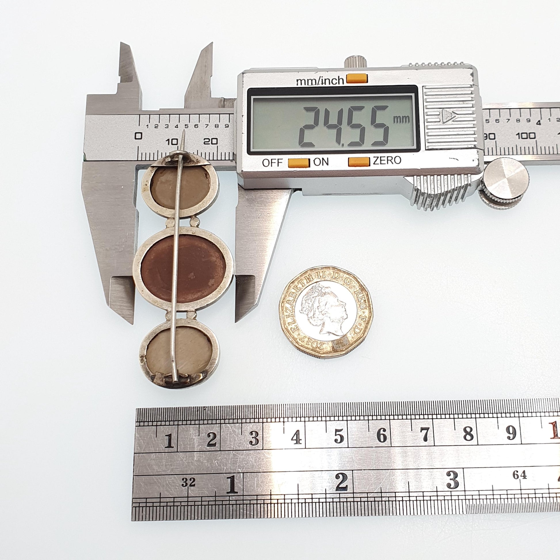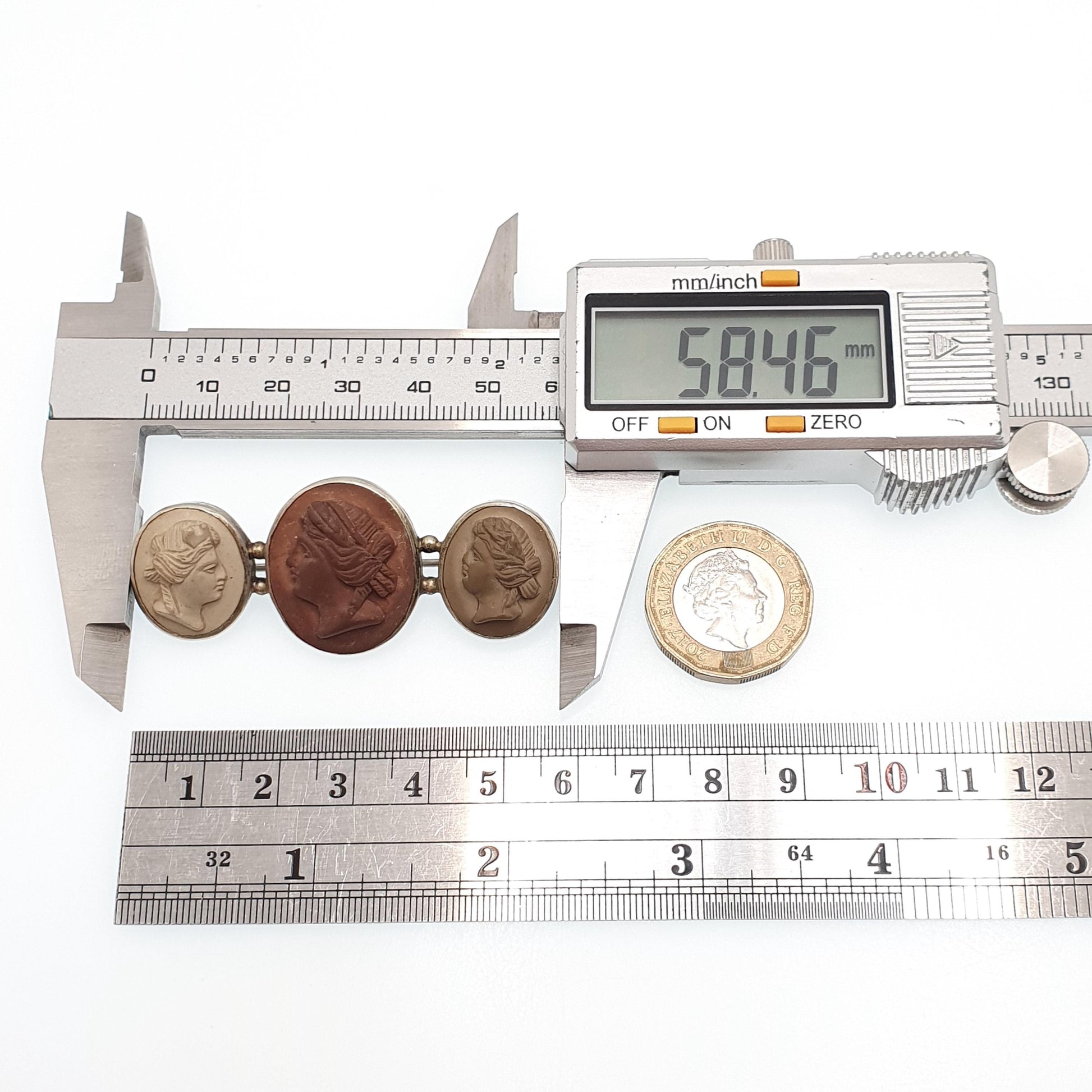 DESCRIPTION: A brilliant antique Victorian lava cameo brooch, made from a silver tone base metal and mounted with 3 hand carved cameos. It weighs approx. 10.72g and the size dimensions are in the latter photos.
