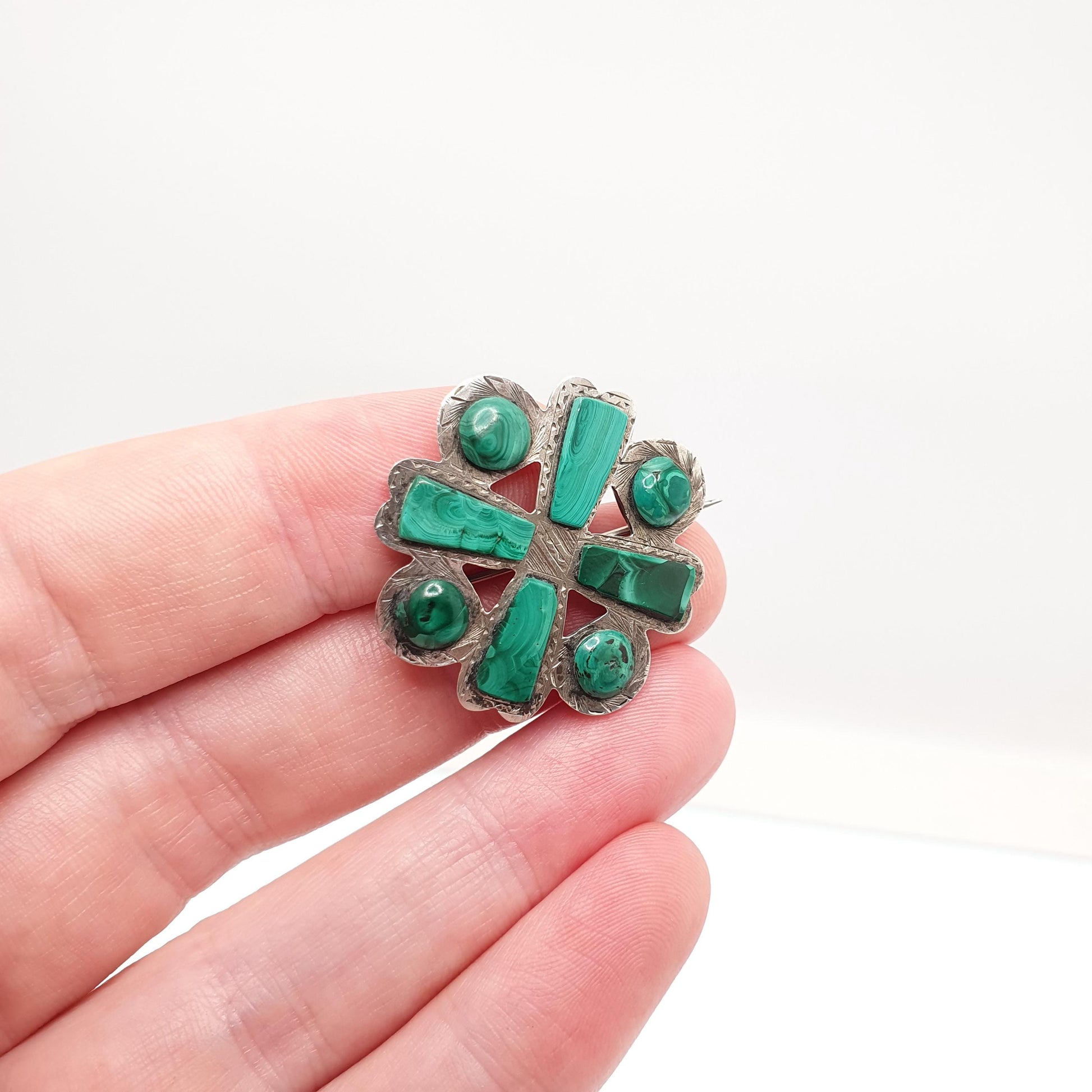 Antique Victorian Malachite Solid Silver Brooch Scottish Cross Cruciform Green Gemstone Vintage Womens Jewelry Jewellery