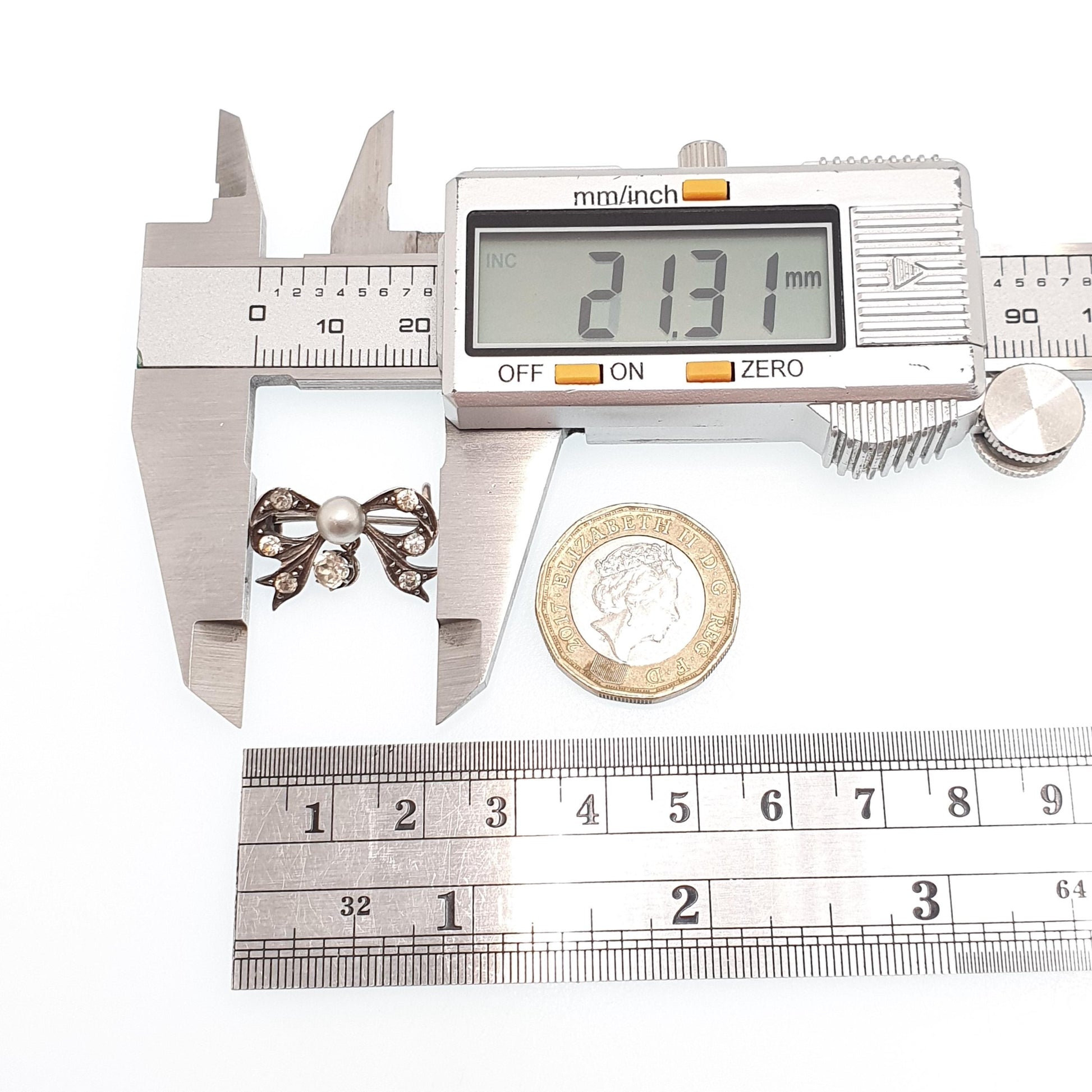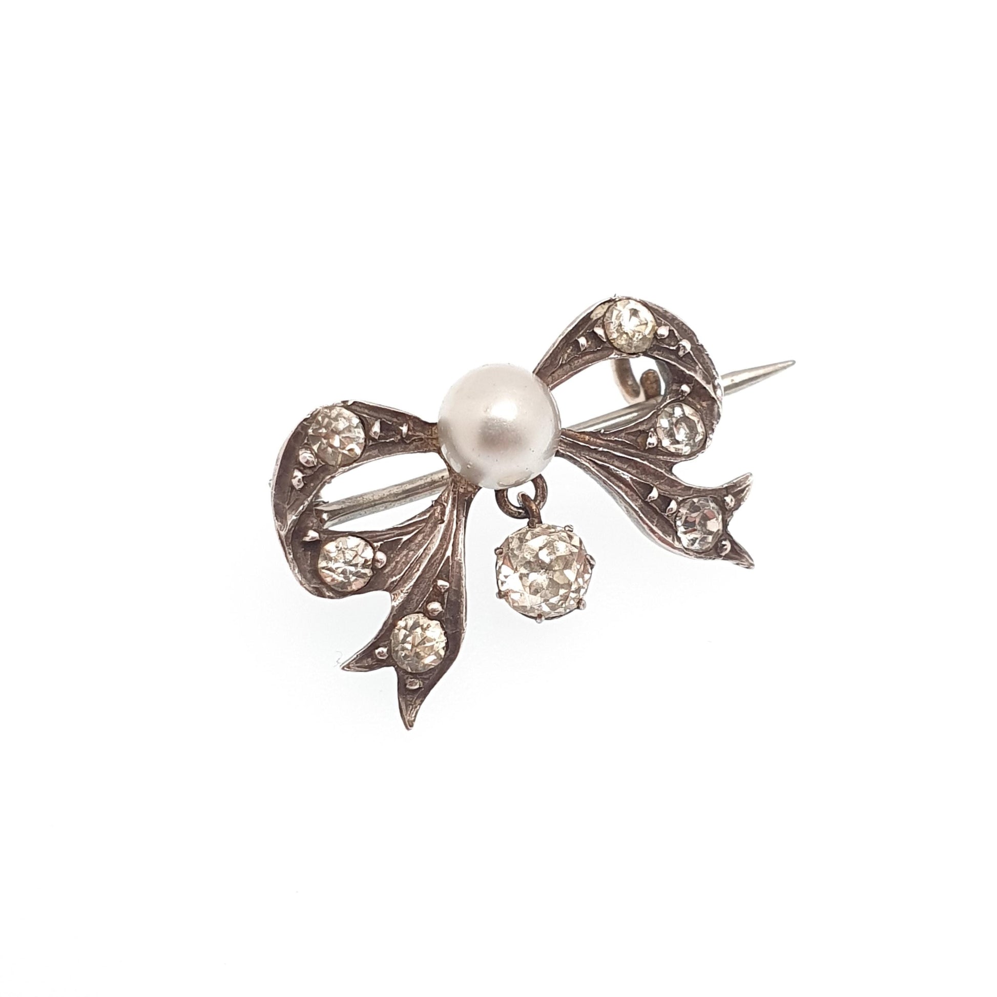 DESCRIPTION: An absolutely adorable antique Victorian solid silver bow brooch, adorned with diamond pastes and a simulated pearl. It weighs 2.98g and the size dimensions are in the later photos. It has foreign silver hallmarks on the rear.