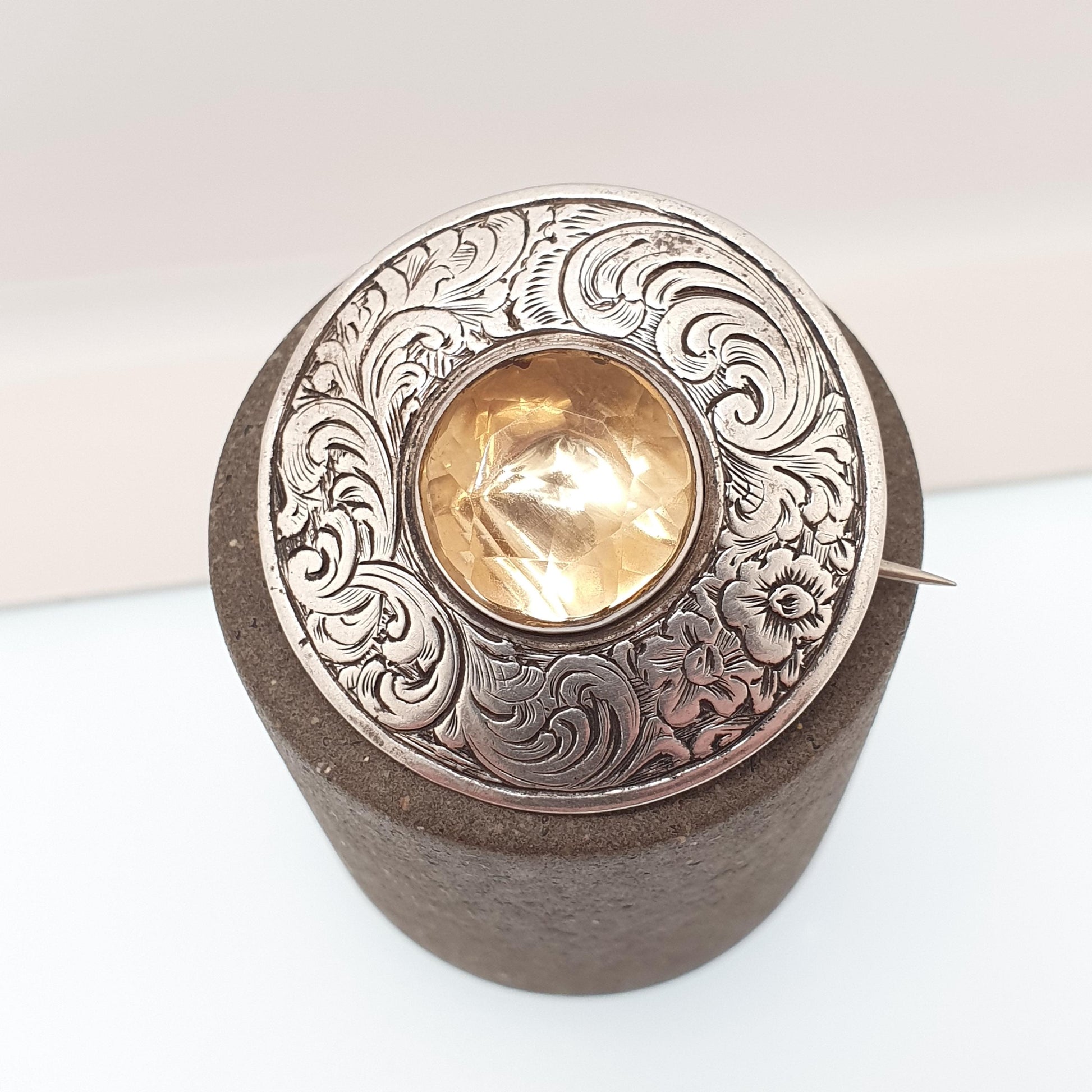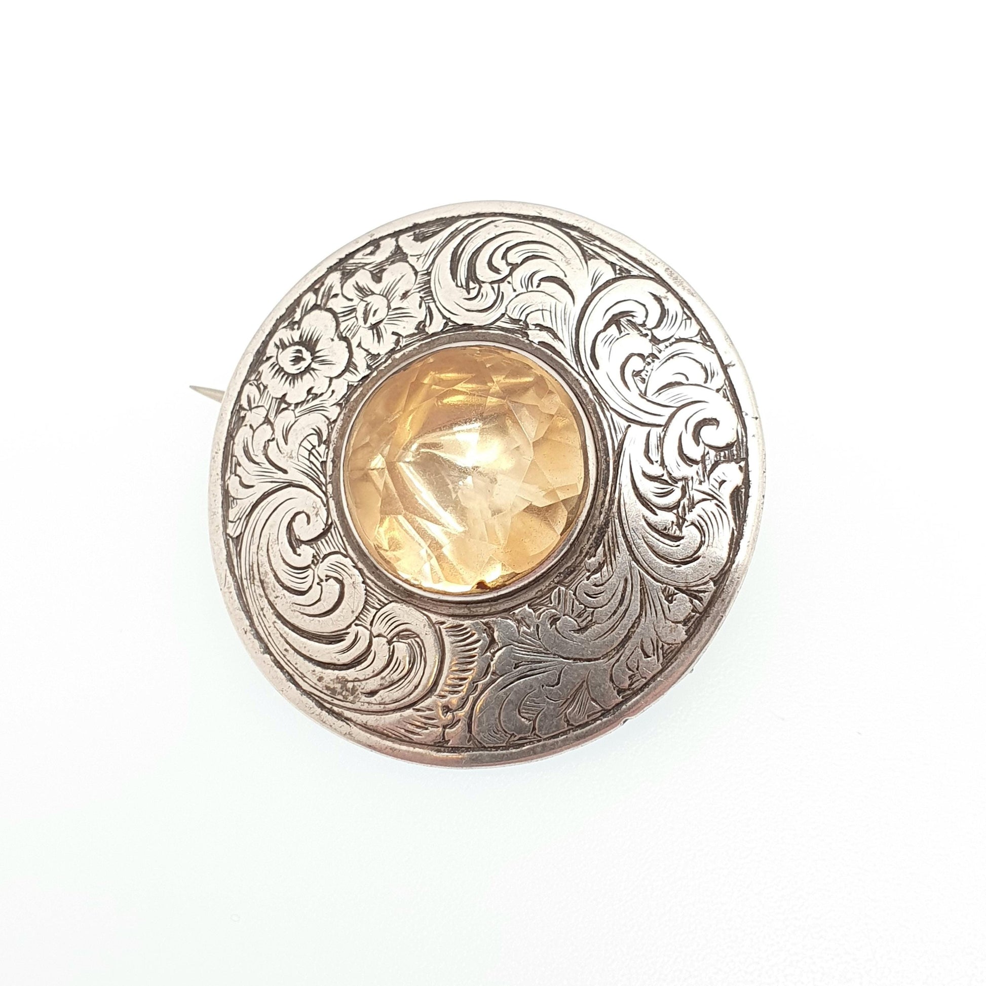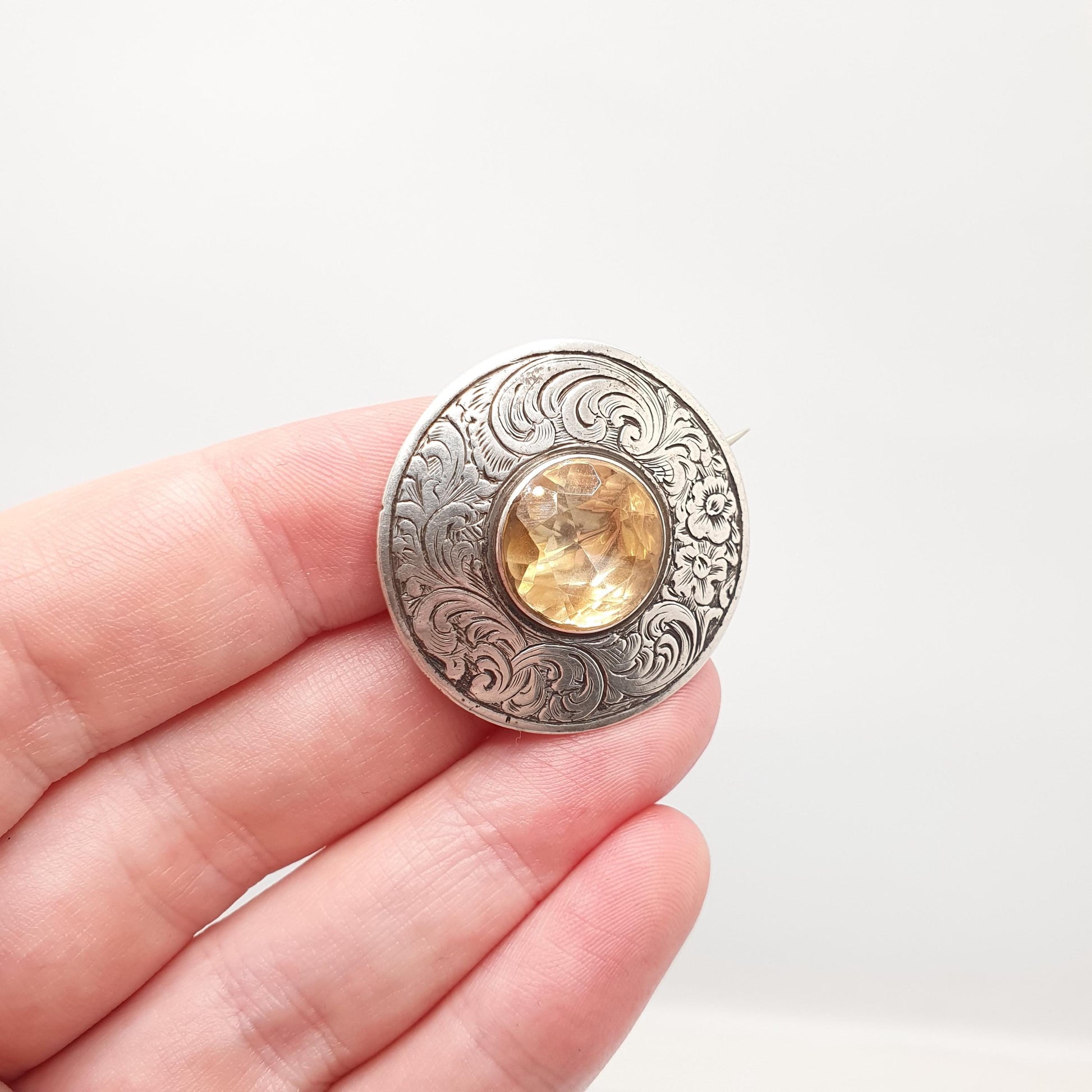 Antique Victorian Solid Silver Citrine Brooch Genuine Gemstone Etruscan Leaf Border Oval Cut Quartz Pin Vintage Womens Jewelry Jewellery