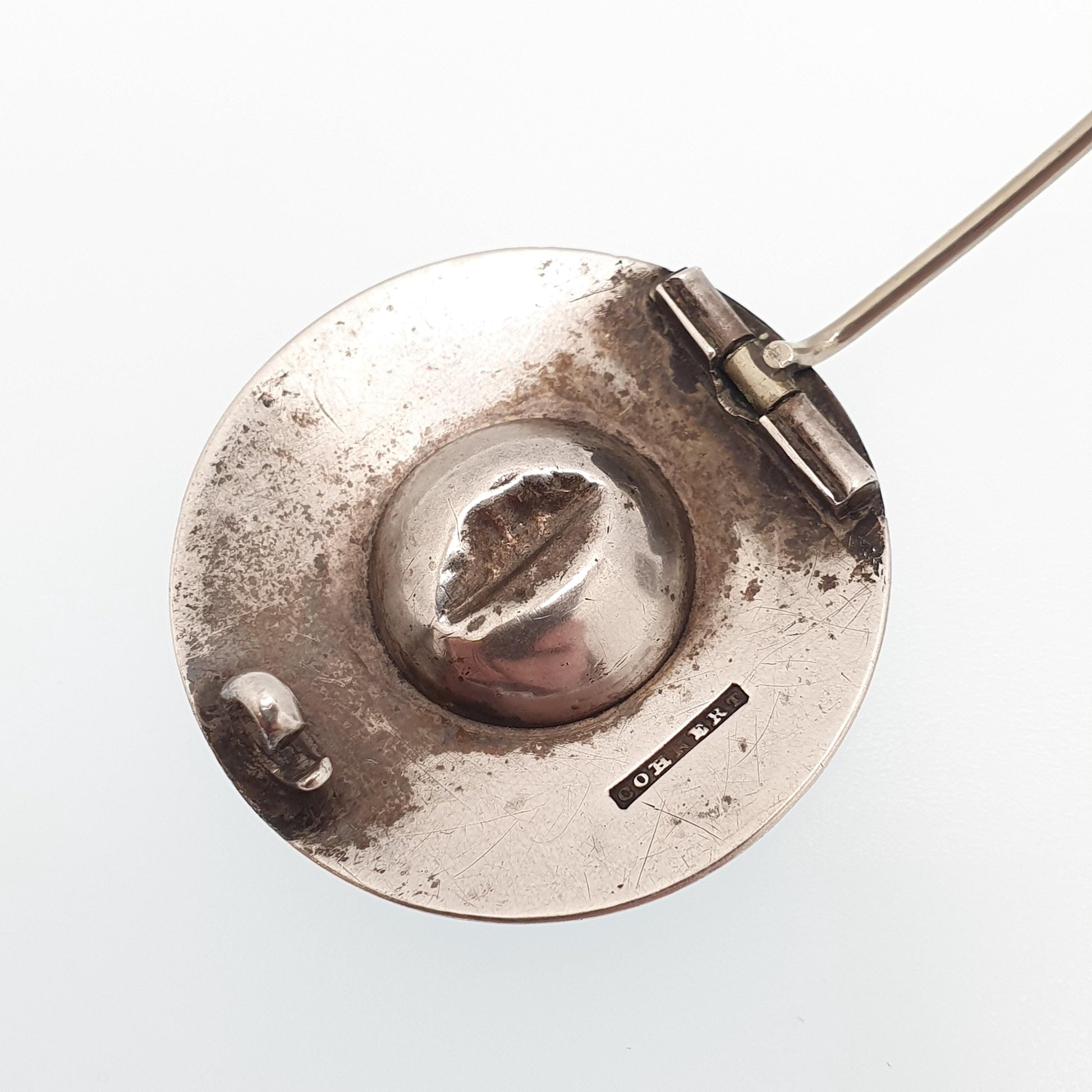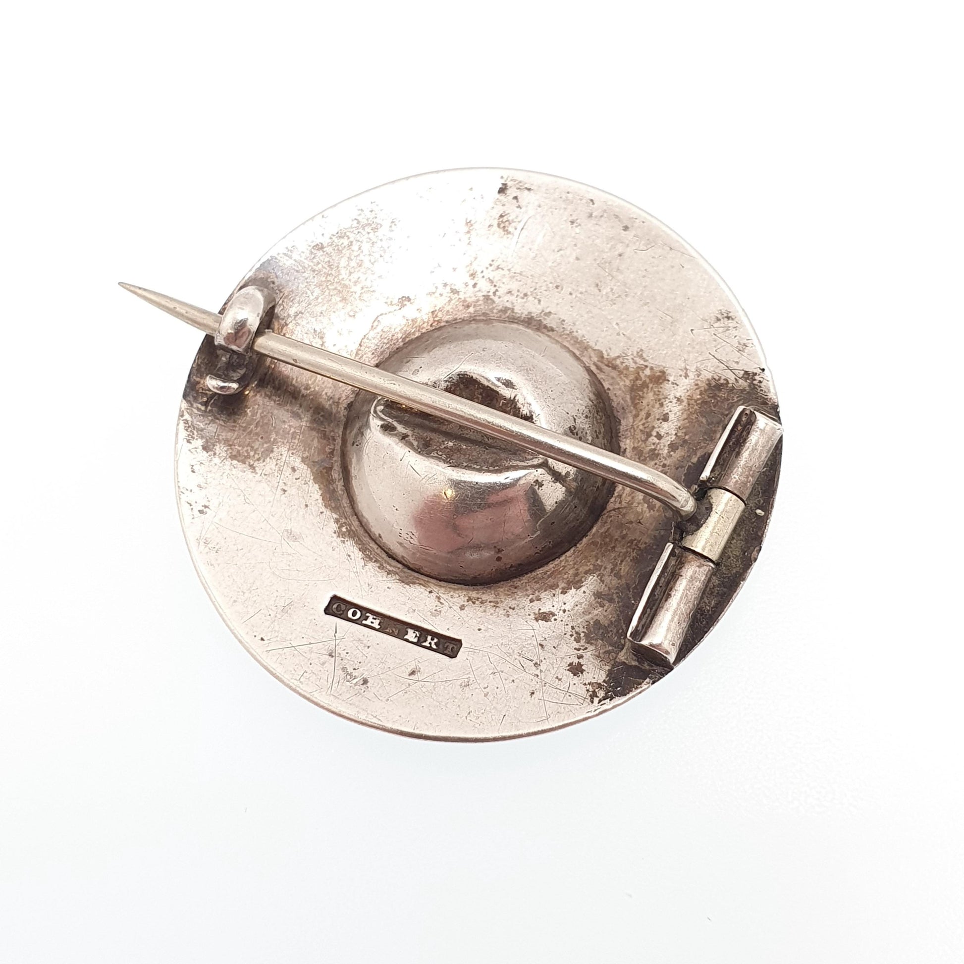 DESCRIPTION: A beautiful antique Georgian solid silver brooch, adorned with a natural foiled citrine gemstone (100% tested). The item weighs approx. 7.20g and the size dimensions are in the later photos. As to be expected with the items age, it isn't stamped/hallmarked, it tests for high grade silver (800+). It's stamped with what I think is a makers mark. The foiled behind the citrine has been lost it areas, giving the edge of the stone some black spots, they're not chips to the stone (see picture 8). The rear has a dent in gemstone housing.
