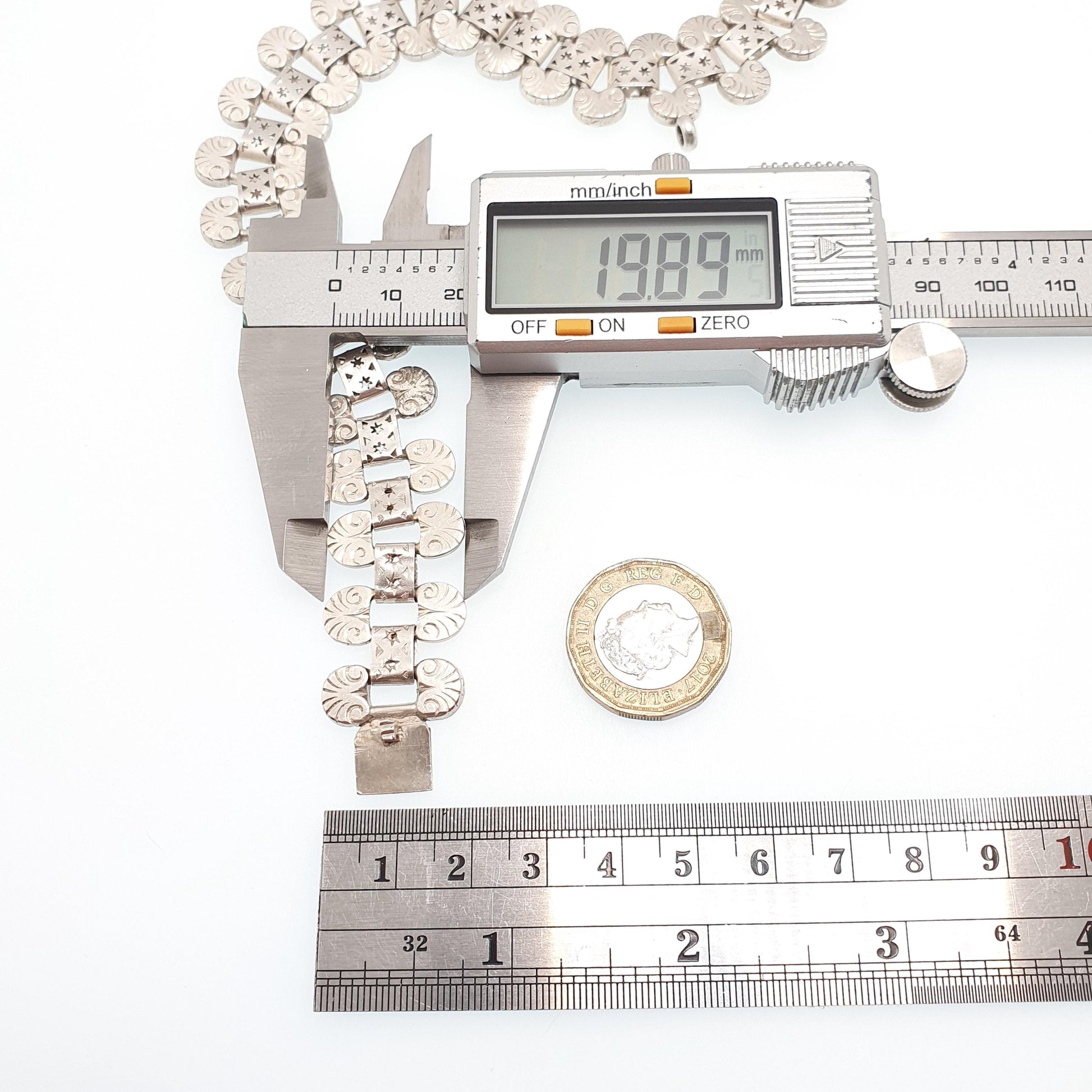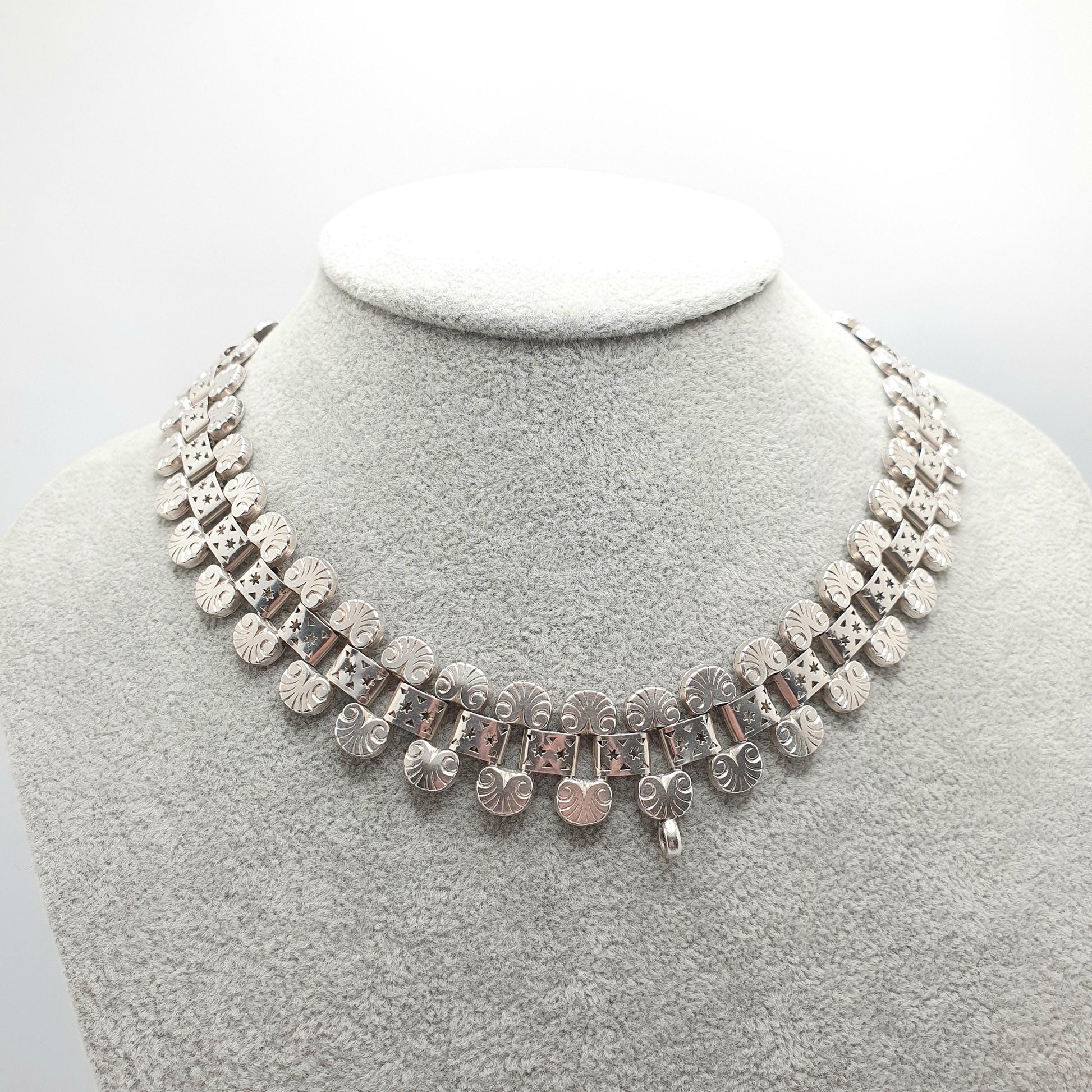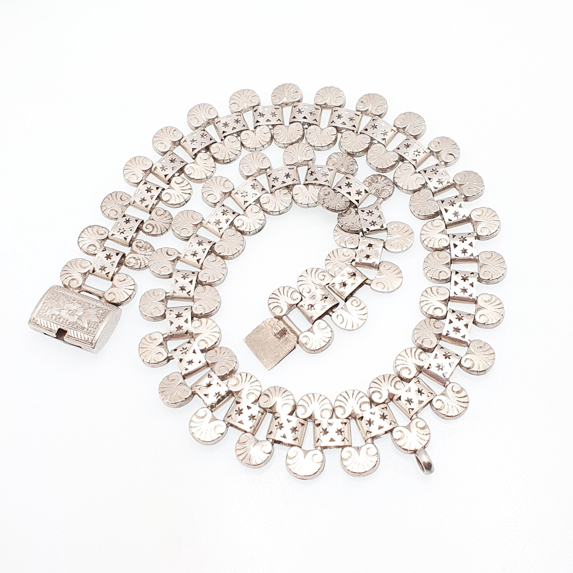 DESCRIPTION: A superb and high quality antique Victorian solid silver collar necklace, with its original clasp and central locket/pendant bail. The necklace is a fine example of its type, crafted to an exquisite standard. It has has good solid weight to it, weighing a total of 54.76g. It measures approx. 42cm or 16.5" in unfastened. As to be expected with the items age it isn't stamped/hallmarked, it tests for high grade silver (800+). PLEASE NOTE: The majority of this necklace is solid silver, it looks like it has had some extra scalloped links cast and attached at some point in it's life. 3 of these links are made from solid silver and 4 of them are silver plated. Most people probably wouldn't be aware that these links have been added as it's been done to a good standard. The replacement links are slightly thinner in depth than the originals, see pictures 10 & 11.