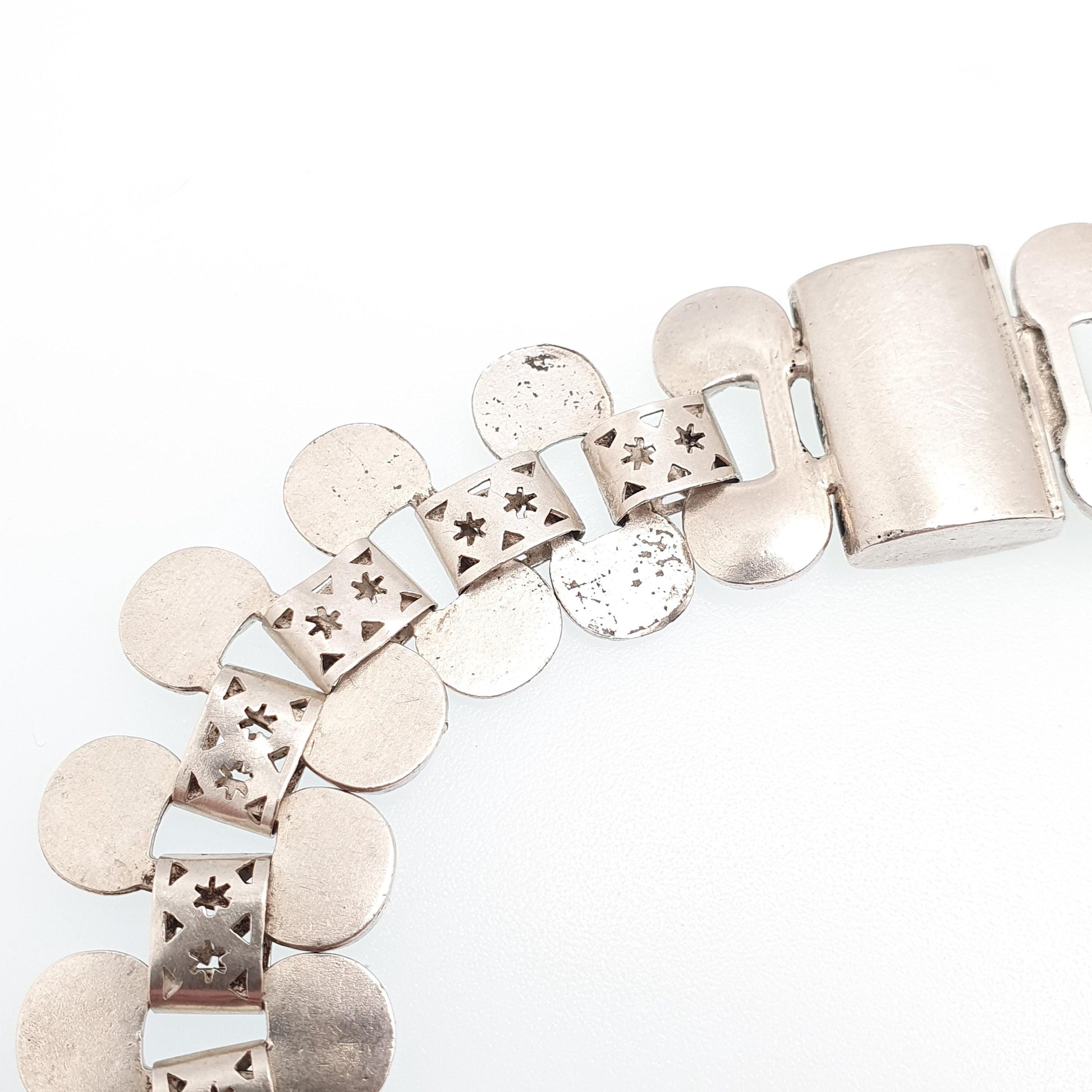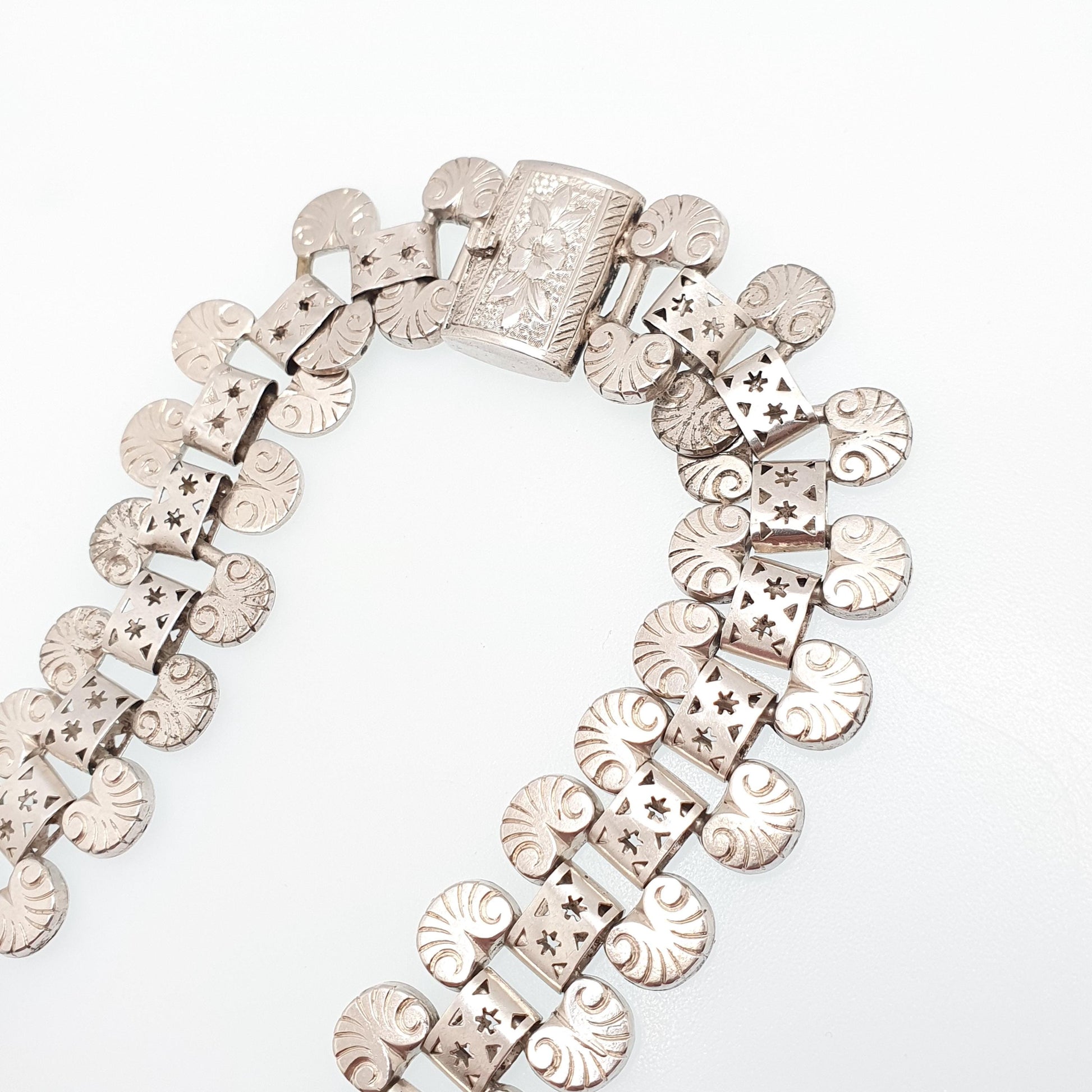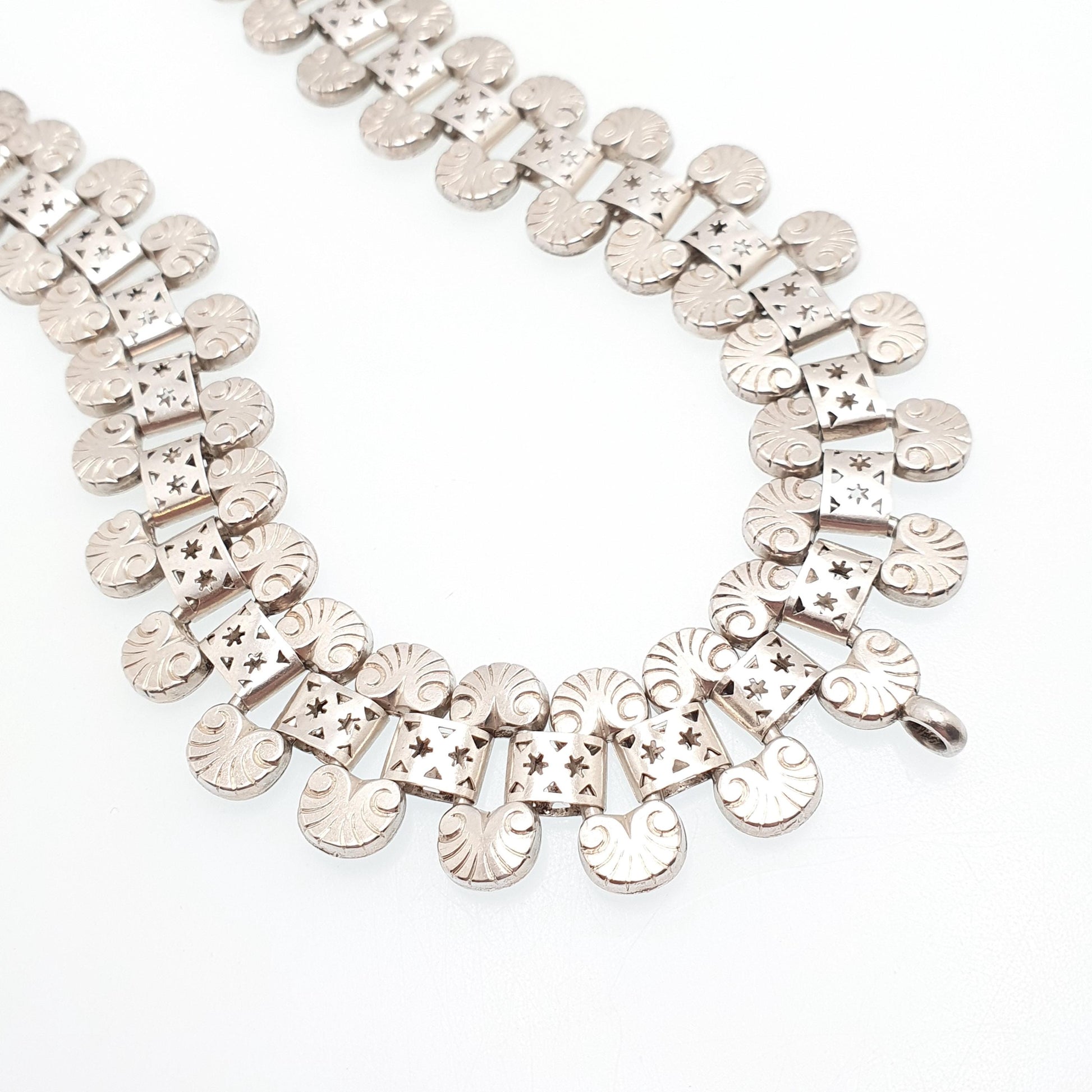 DESCRIPTION: A superb and high quality antique Victorian solid silver collar necklace, with its original clasp and central locket/pendant bail. The necklace is a fine example of its type, crafted to an exquisite standard. It has has good solid weight to it, weighing a total of 54.76g. It measures approx. 42cm or 16.5" in unfastened. As to be expected with the items age it isn't stamped/hallmarked, it tests for high grade silver (800+). PLEASE NOTE: The majority of this necklace is solid silver, it looks like it has had some extra scalloped links cast and attached at some point in it's life. 3 of these links are made from solid silver and 4 of them are silver plated. Most people probably wouldn't be aware that these links have been added as it's been done to a good standard. The replacement links are slightly thinner in depth than the originals, see pictures 10 & 11.