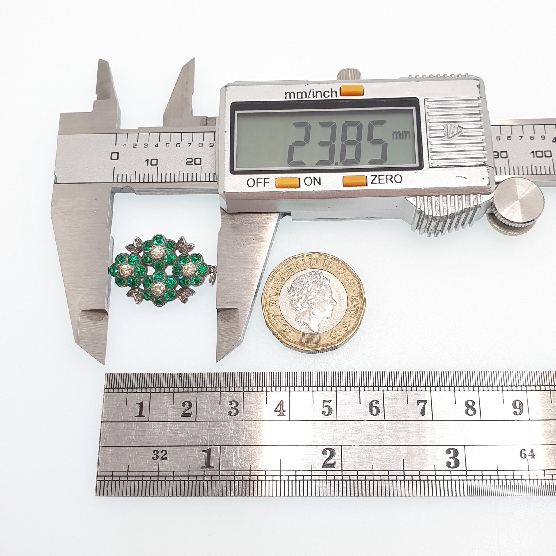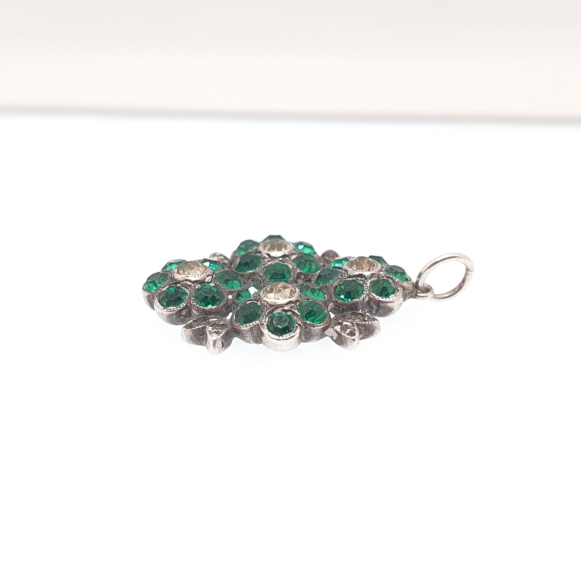 DESCRIPTION: A gorgeous antique Victorian solid silver flower pendant, adorned with diamond tone and emerald tone pastes. The item weighs approx. 4.52g and the size dimensions are in the later photos. The item isn't stamped/hallmarked, it tests for high grade silver (800+). As to be expected with age some of the pastes have darkened, in general though the pendant still has an eye-catching sparkle.