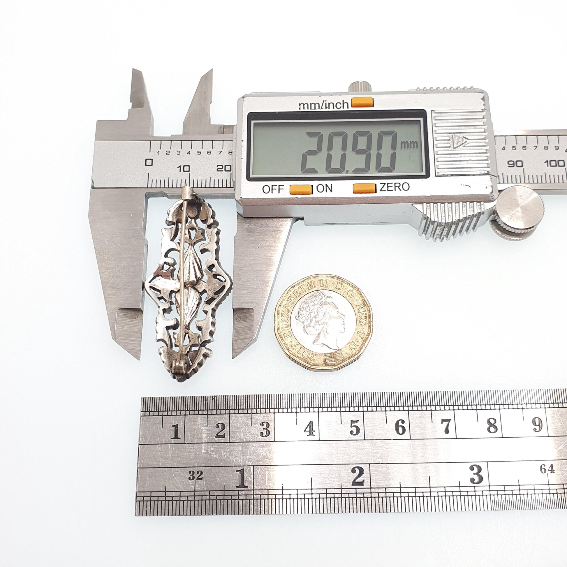 DESCRIPTION: A good quality antique solid silver diamond paste brooch, in an art nouveau style. The item weighs approx. 8.94g and the size dimensions are in the later photos. The item is stamped "93" for 930 silver. As to be expected with age and use, some of the pastes have darkened/yellowed, see pictures/video.