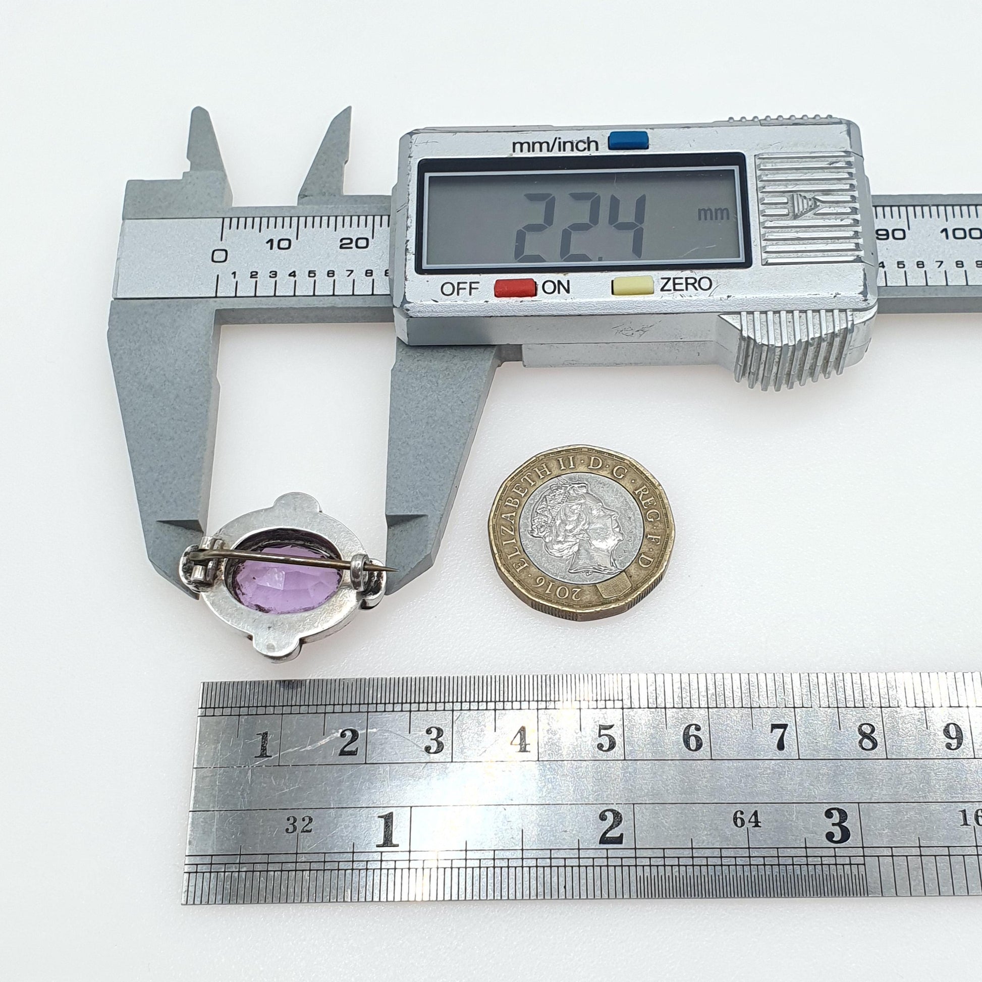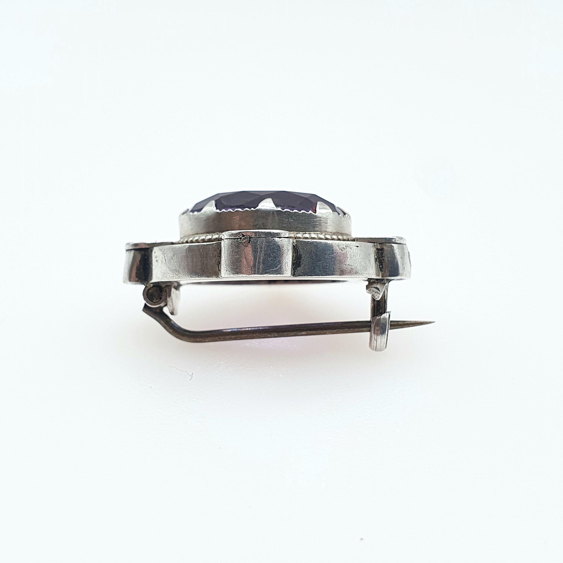 DESCRIPTION: A beautiful antique Victorian solid silver brooch, adorned with a oval cut natural amethyst gemstone. It weighs approx. 4.84g and the size dimensions are in the later photos. As to be expected with the items age, it isn't stamped/hallmarked, tests for high grade silver (800+).