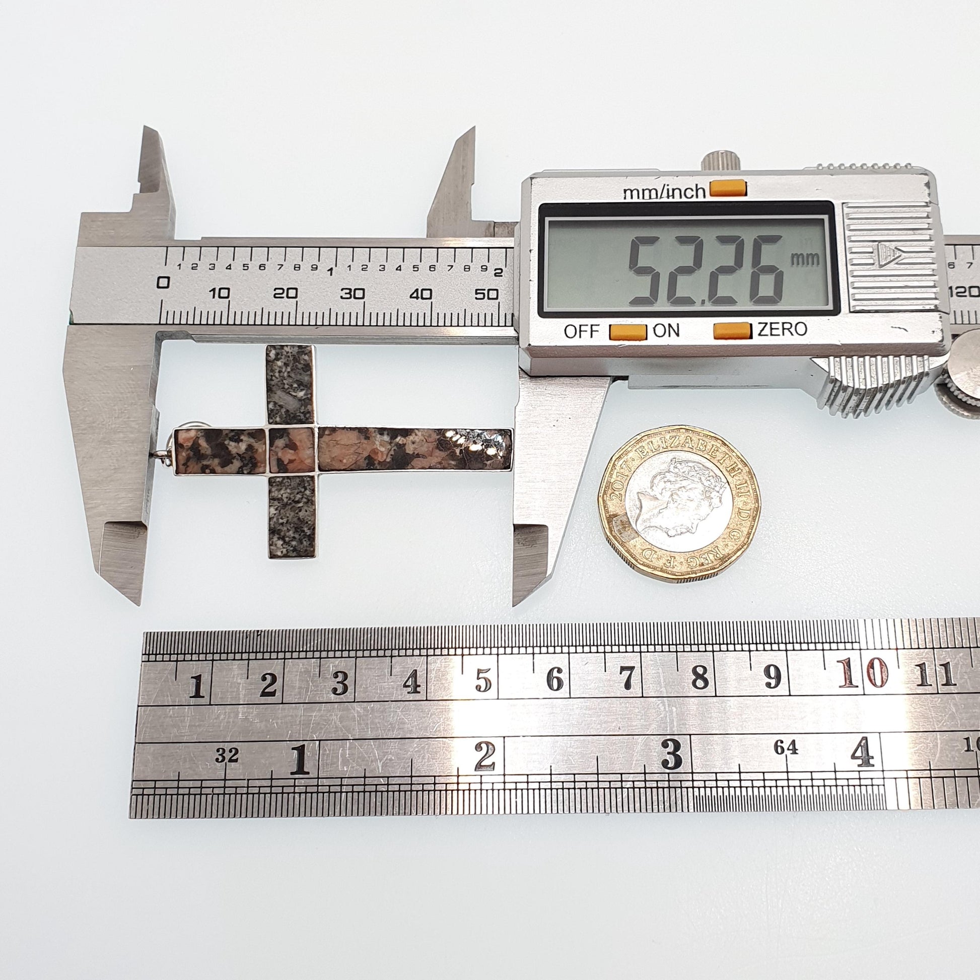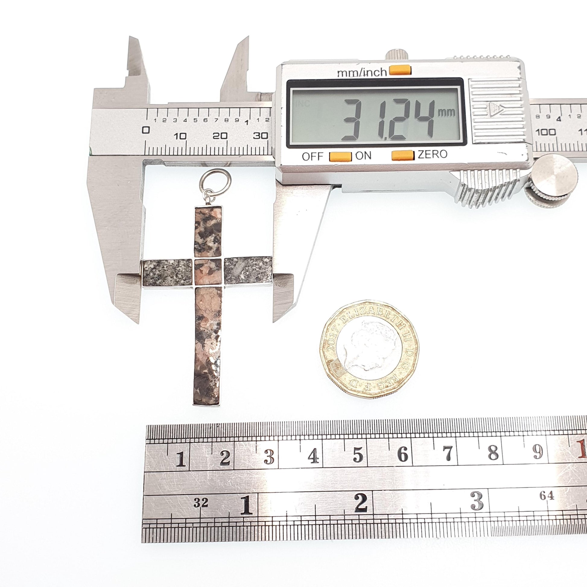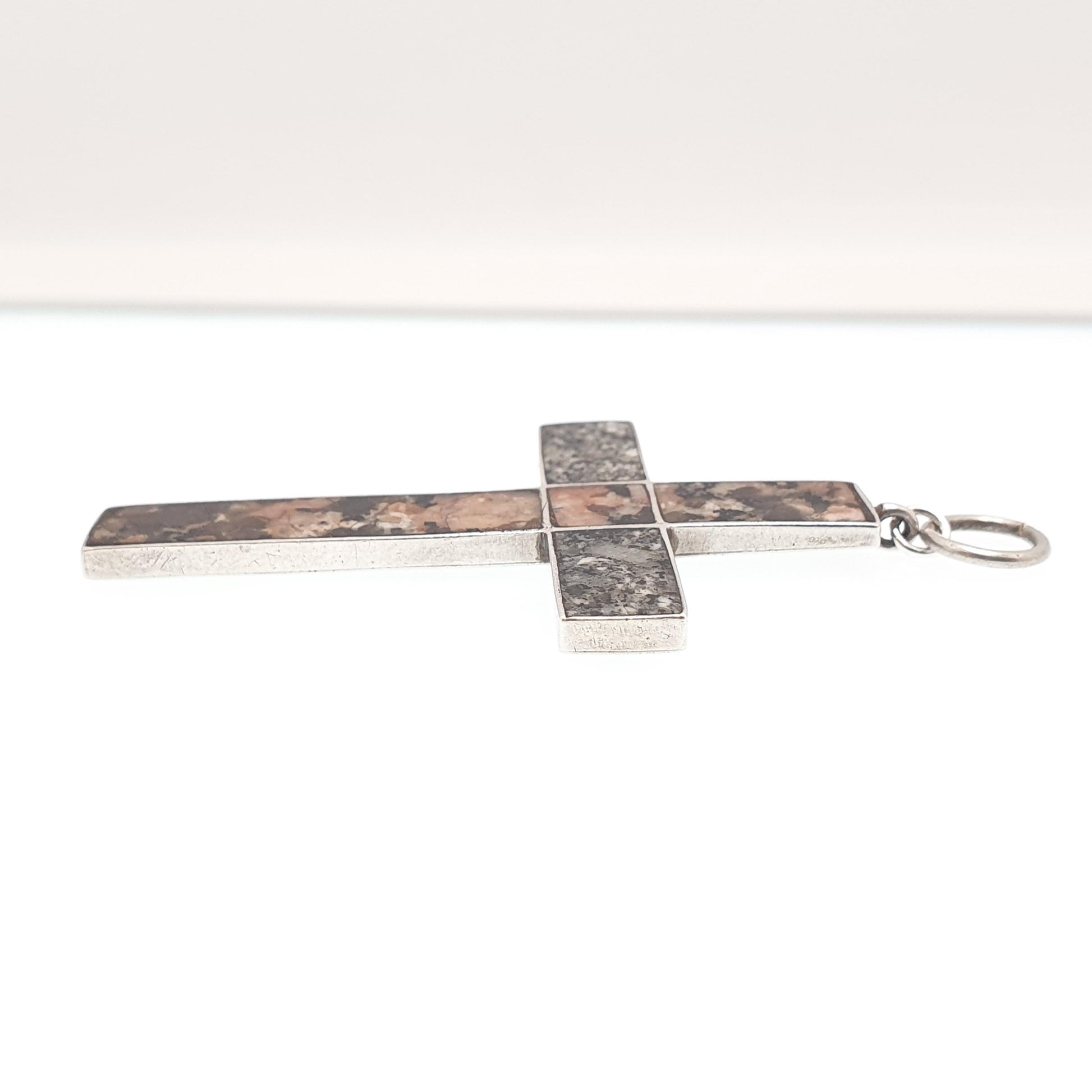 DESCRIPTION: A fantastic antique Victorian Scottish solid silver large crucifix necklace pendant, adorned with pink and grey Aberdeenshire granite. The pendant isn't stamped/hallmarked which is typical of this type of antique jewellery, it tests for sterling silver. It weighs approx. 5.25g and the size dimensions are in the later photos. The granite has some minor edge chips and niggles, as to be expected with age and use.