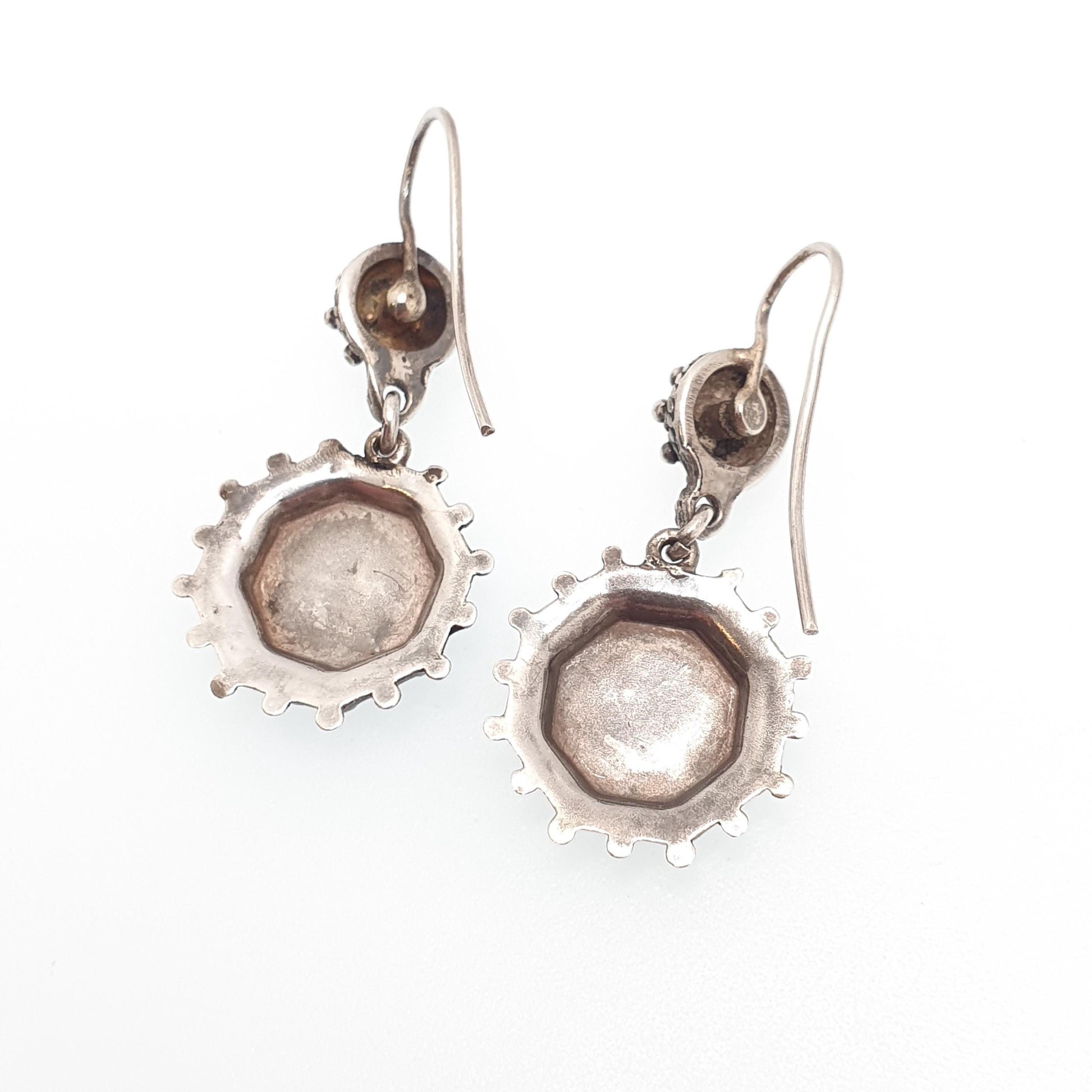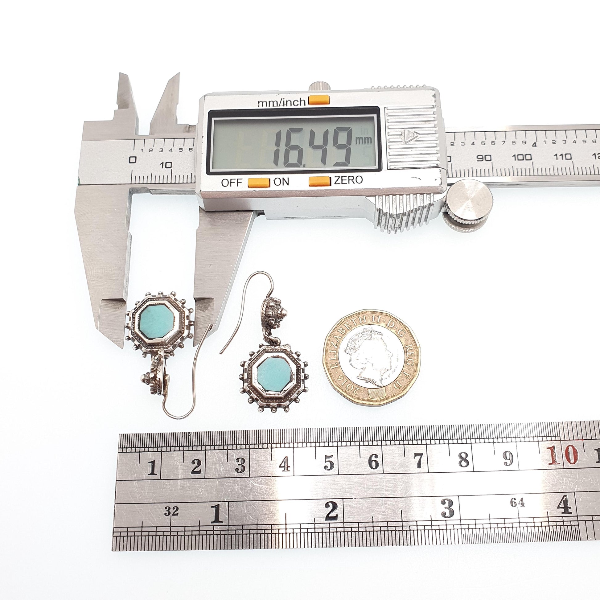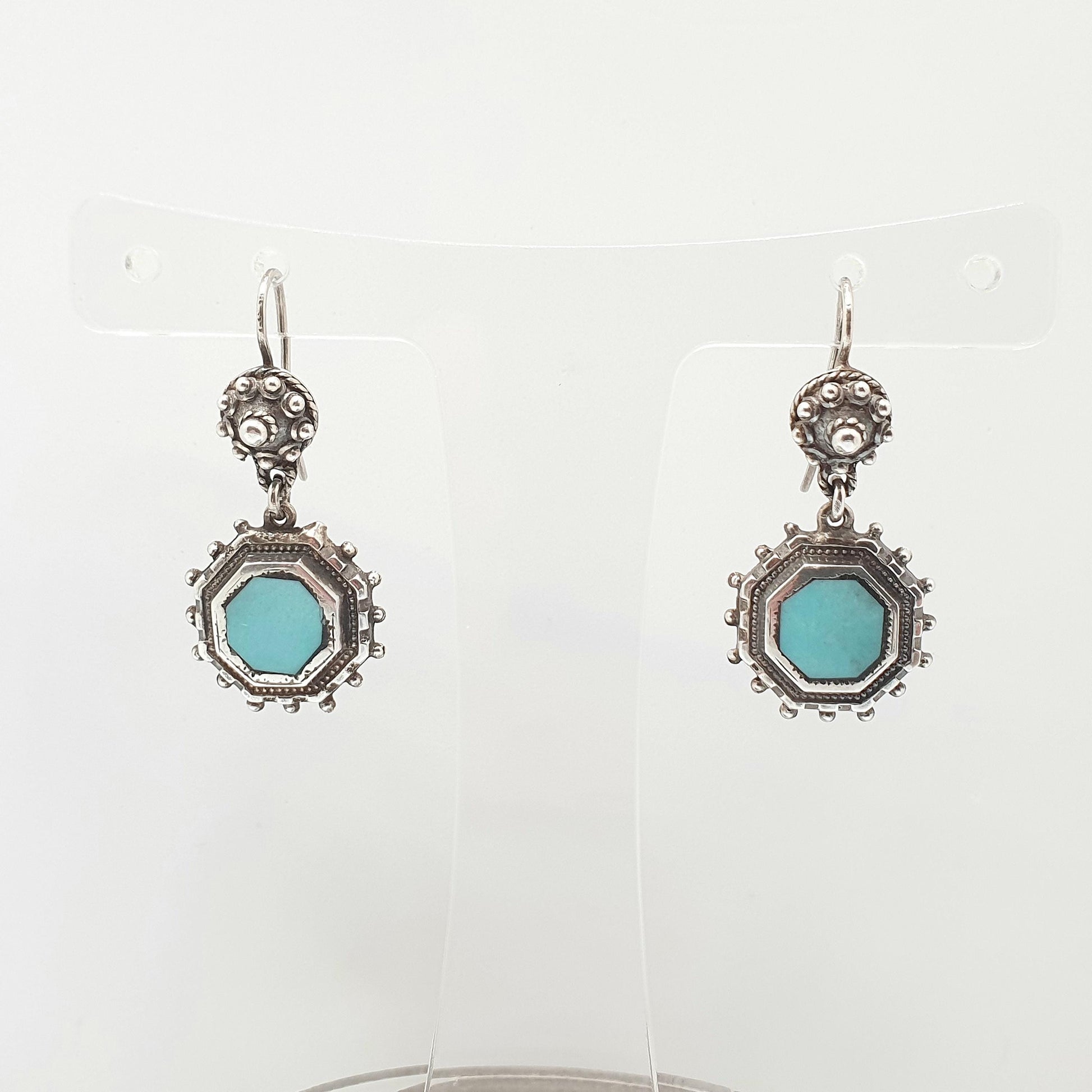 DESCRIPTION: An unusual pair of antique Victorian solid silver Etruscan style earrings, in laid with a turquoise coloured glass. As to be expected with the items age, the silver isn't stamped/hallmarked, they test for high grade silver (800+). They weigh a total of approx. 4.73g and the size dimensions are in the later photos.