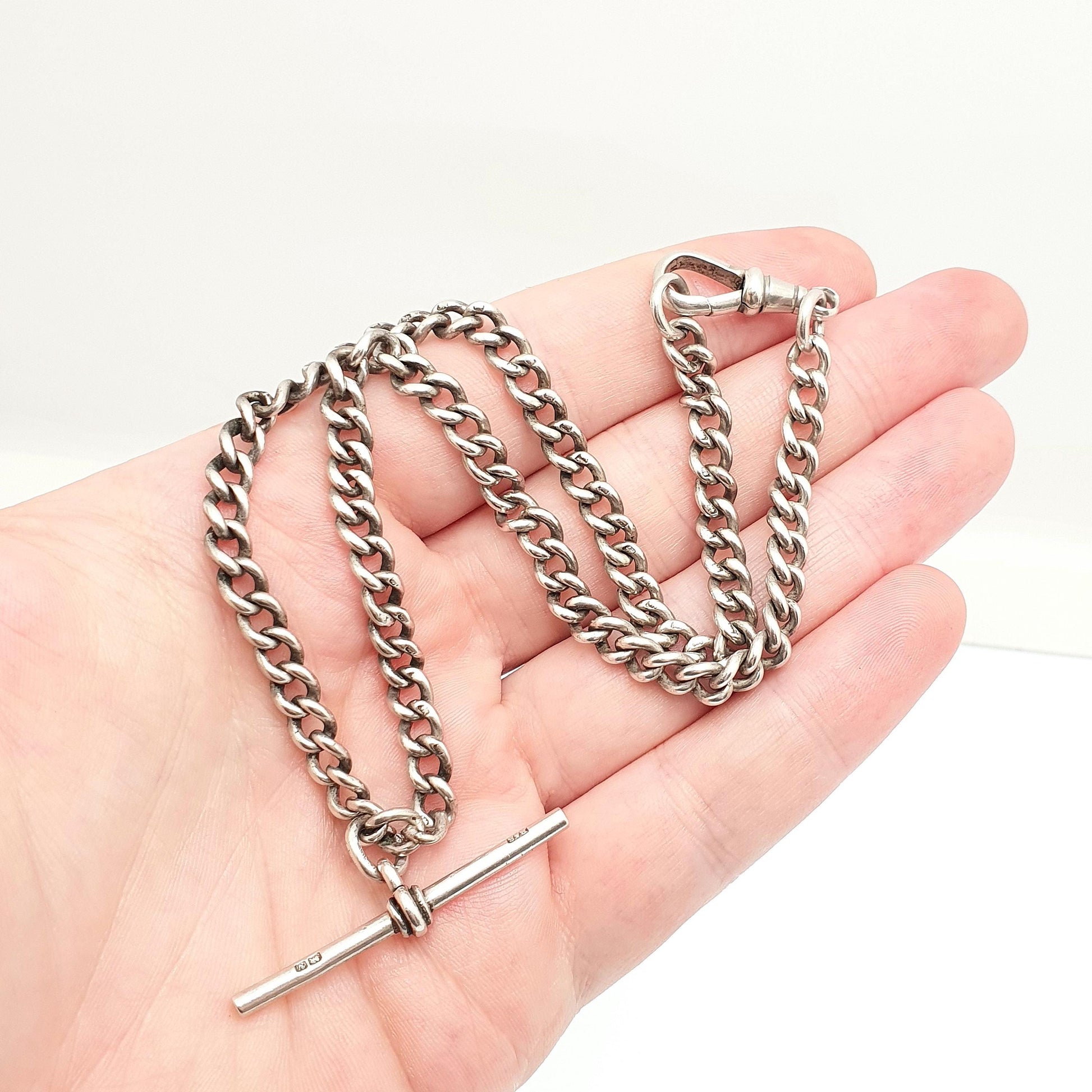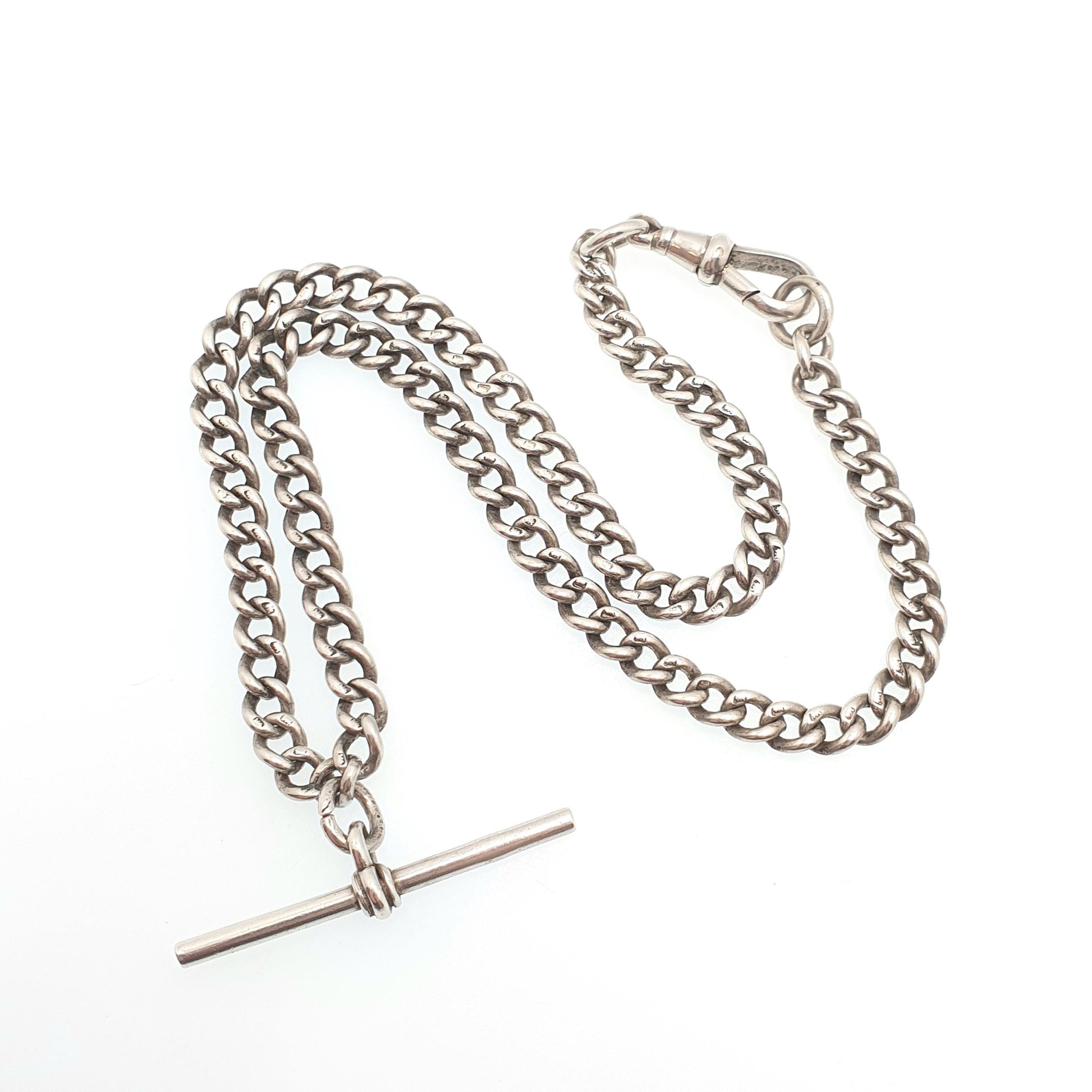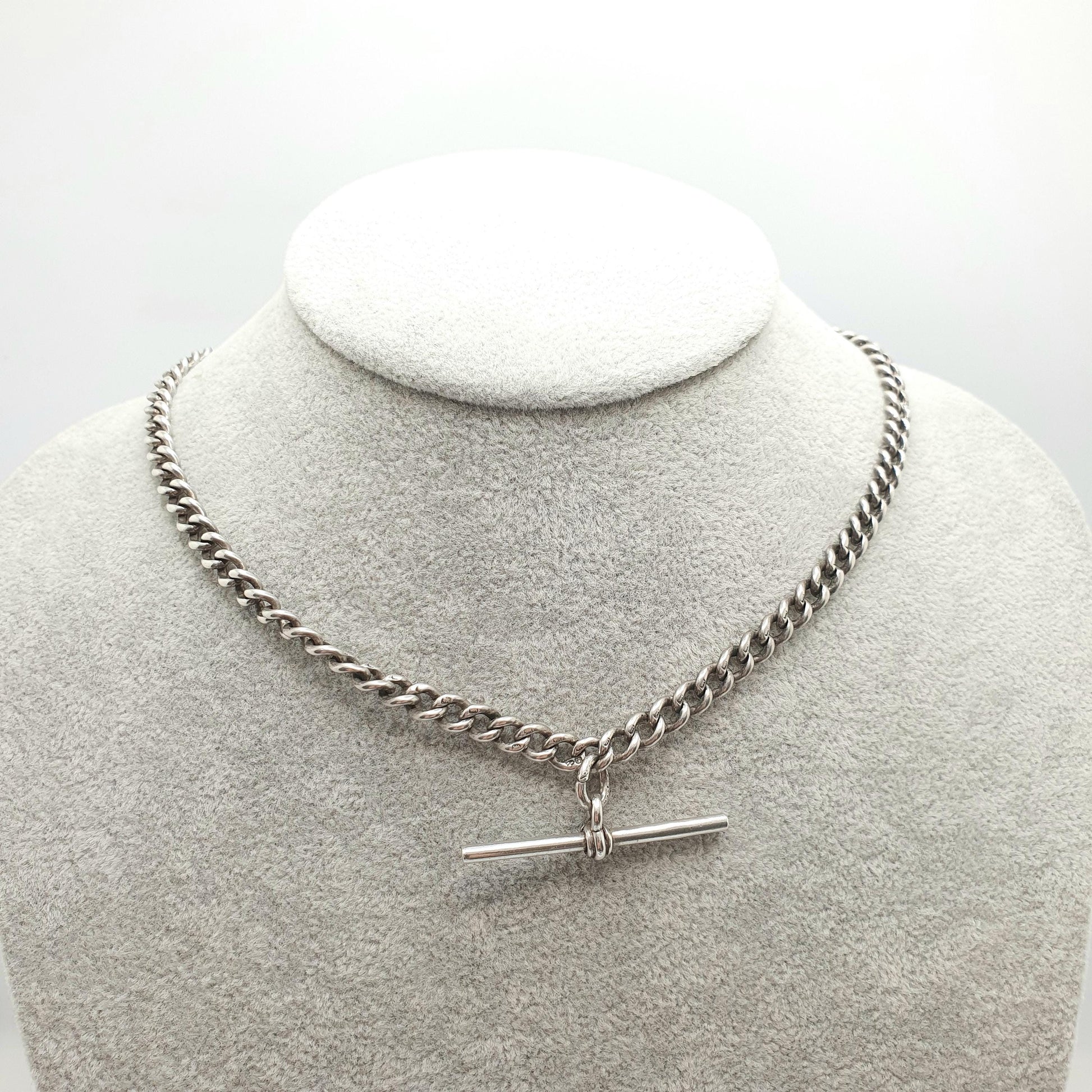 DESCRIPTION: A superb antique sterling silver albert chain necklace, with curb links, dog clip and T bar. The curb links are hallmarked with the British sterling silver lion passant, which shows age and quality. The T bar is fully hallmarked for sterling silver, dating to 1924. The chain measures approx. 40cm or 15.7" in unfastened length, weighs approx. 31.80g and the curb links are approx. 5.6mm. As to be expected with the items age, some of the links have worn and have marks on them.