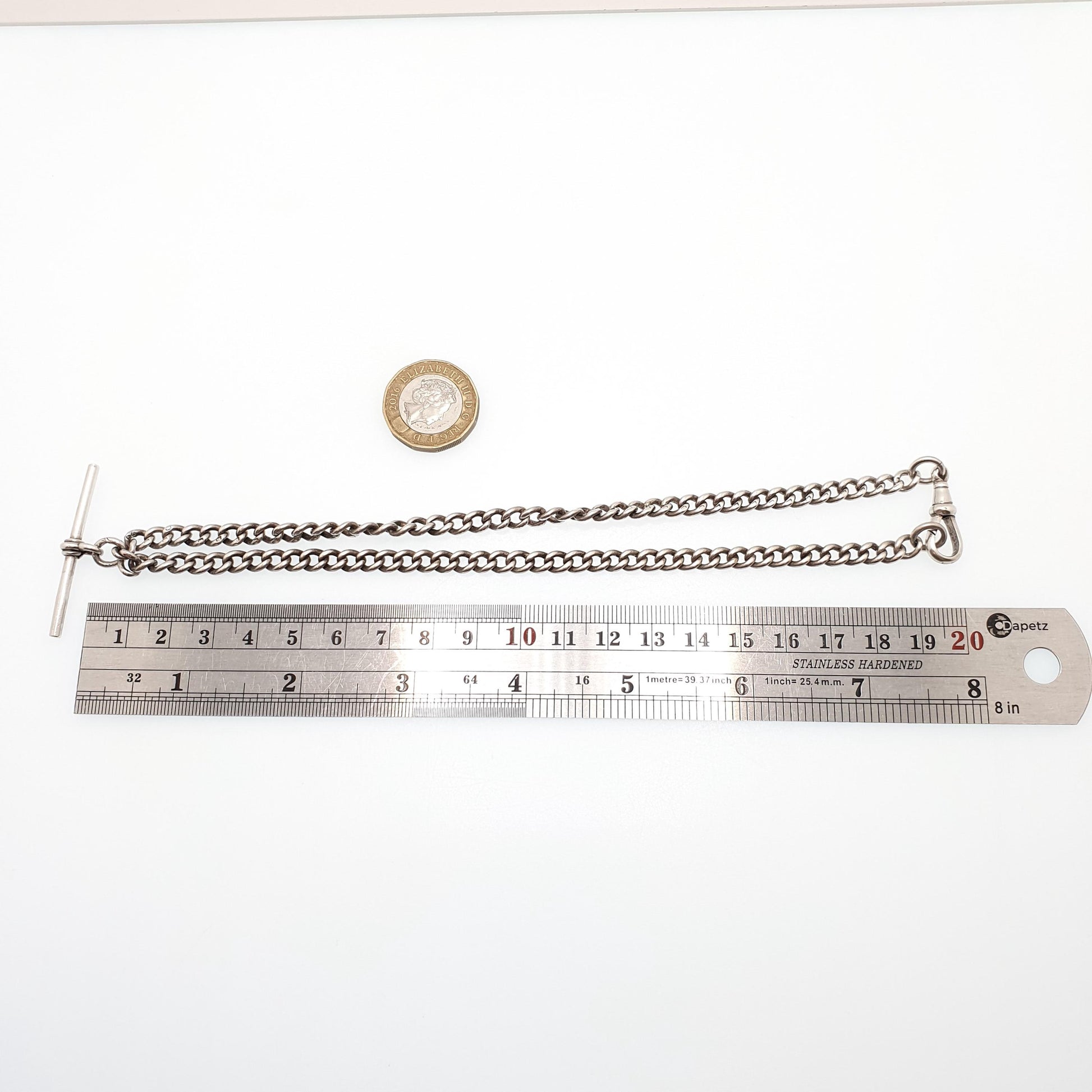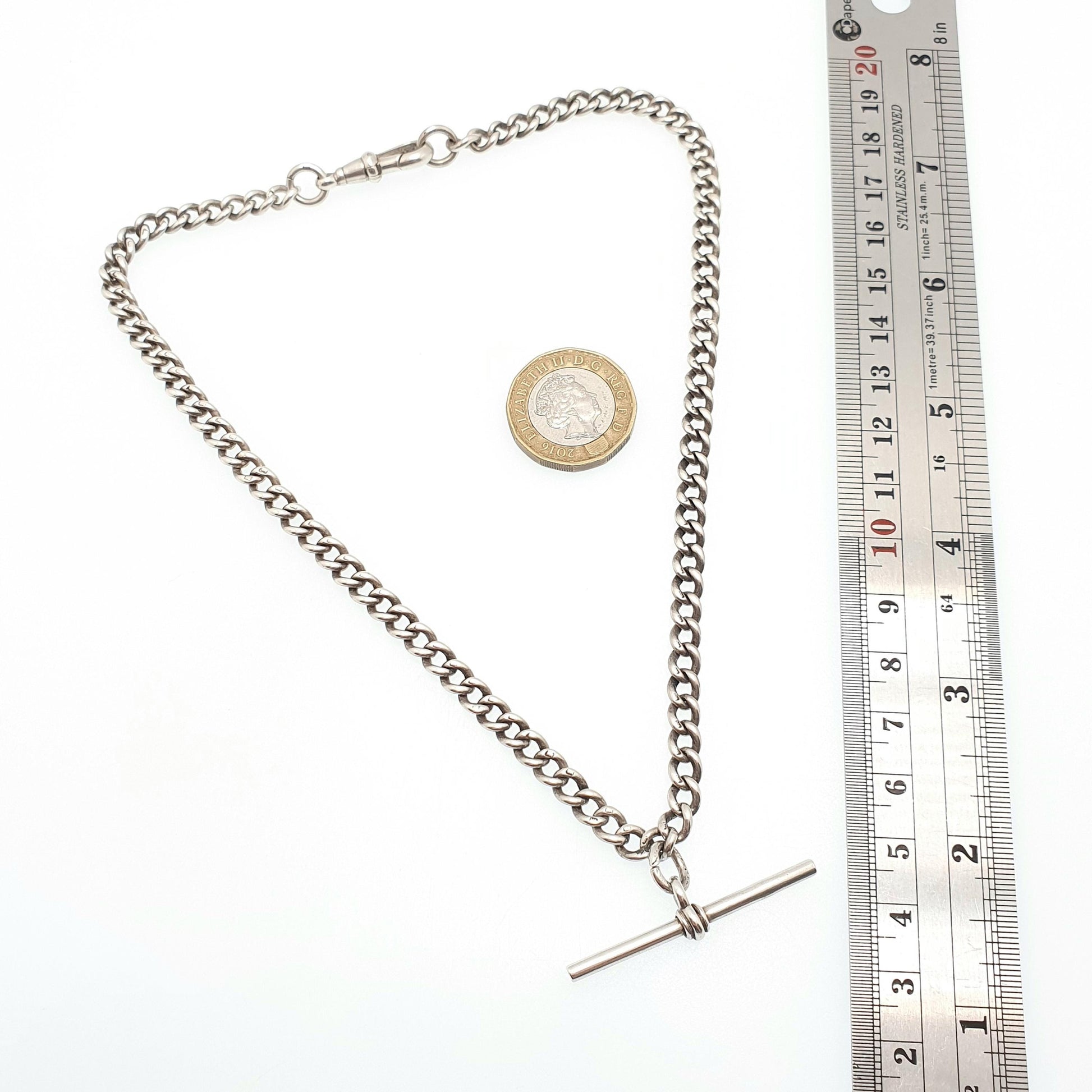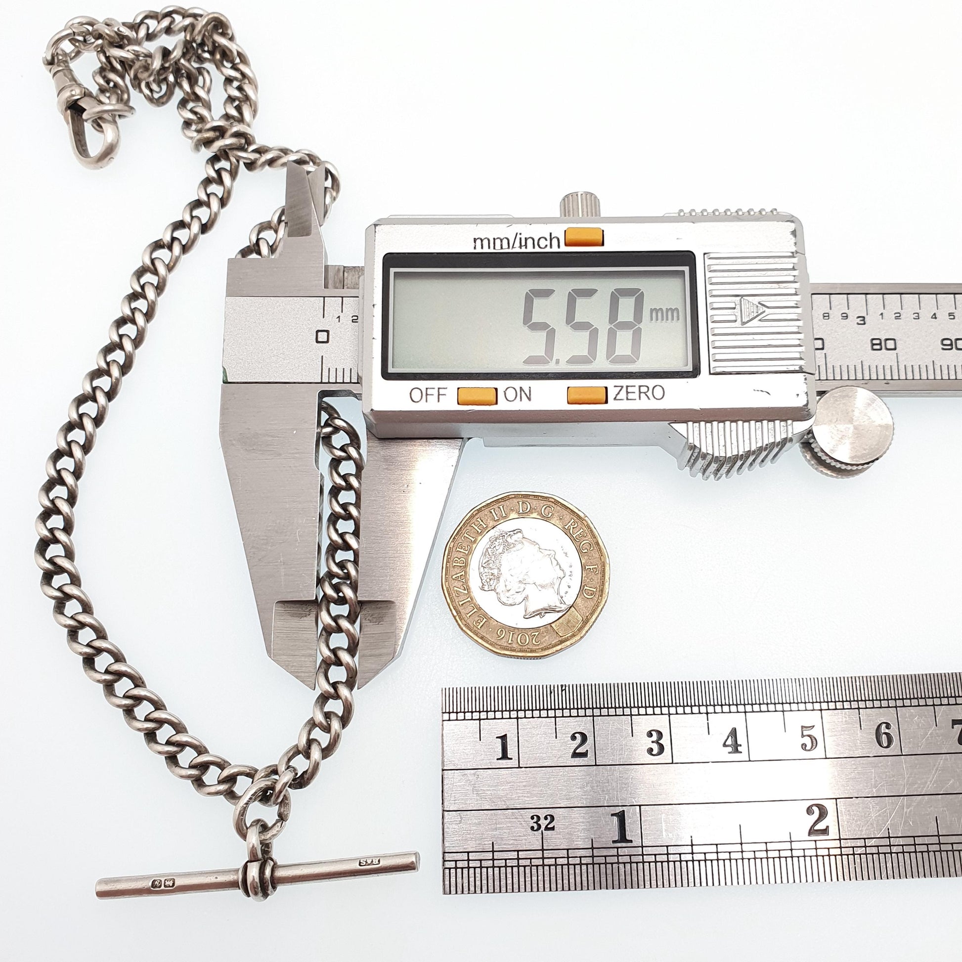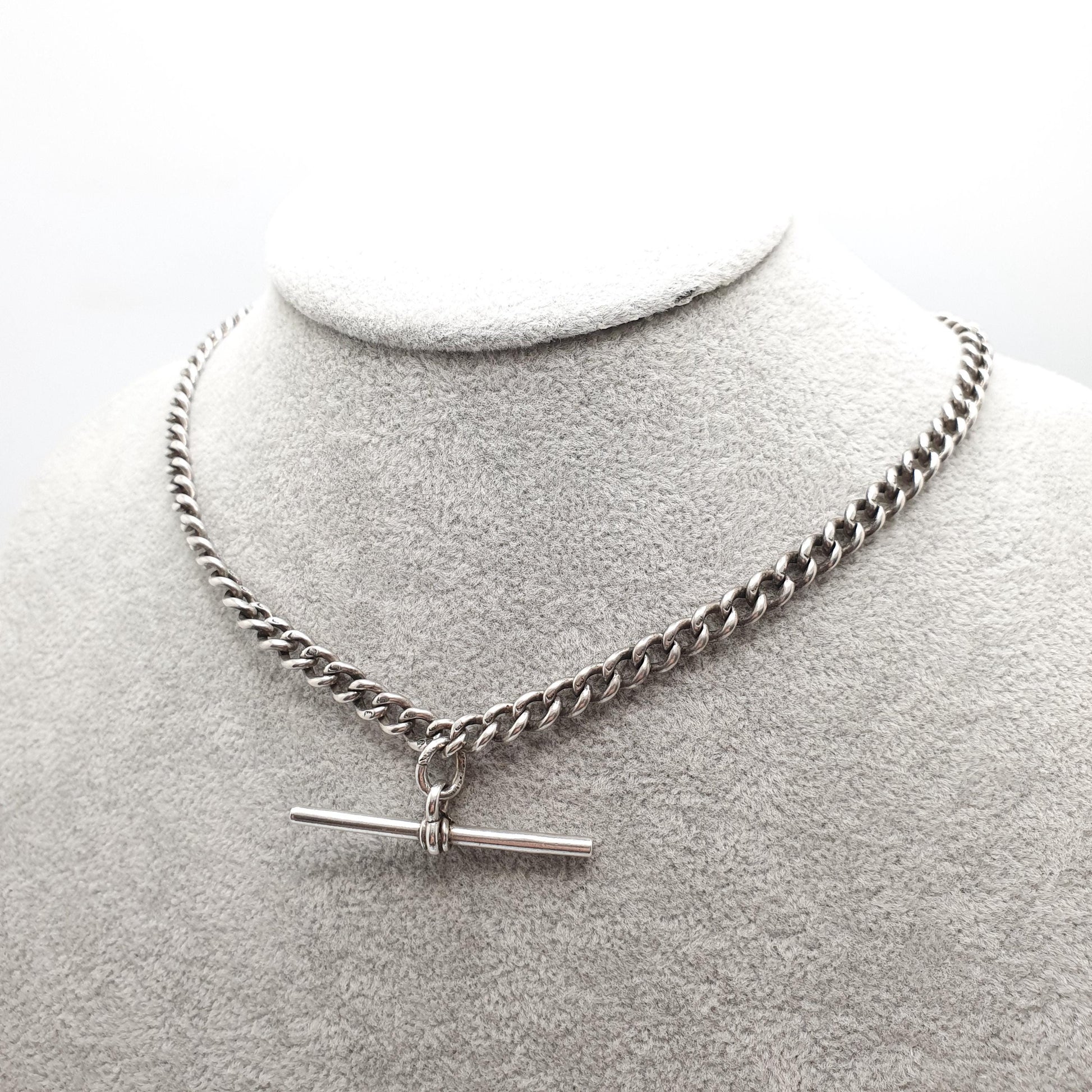 DESCRIPTION: A superb antique sterling silver albert chain necklace, with curb links, dog clip and T bar. The curb links are hallmarked with the British sterling silver lion passant, which shows age and quality. The T bar is fully hallmarked for sterling silver, dating to 1924. The chain measures approx. 40cm or 15.7" in unfastened length, weighs approx. 31.80g and the curb links are approx. 5.6mm. As to be expected with the items age, some of the links have worn and have marks on them.