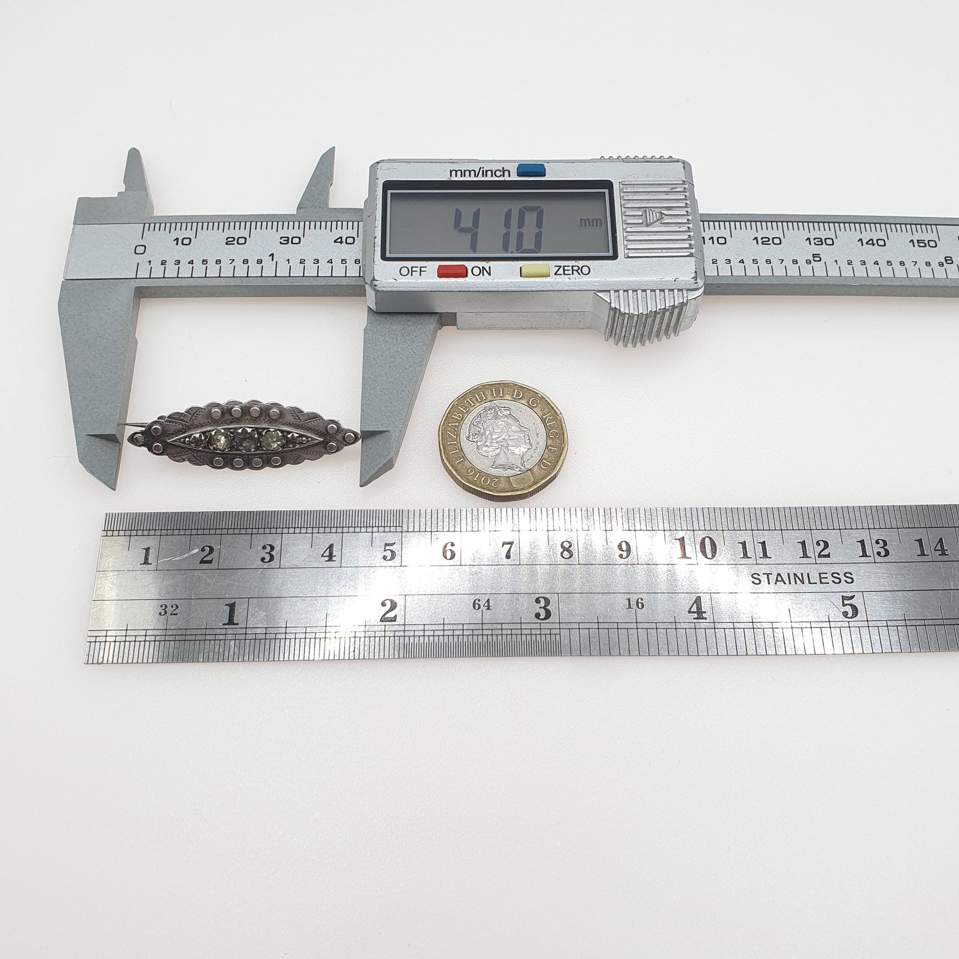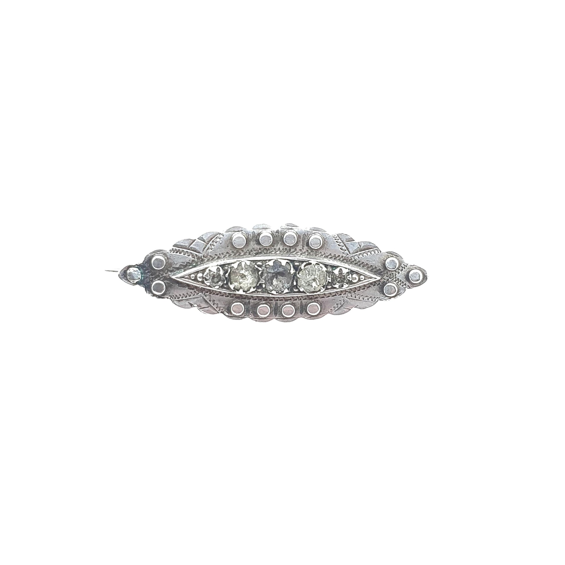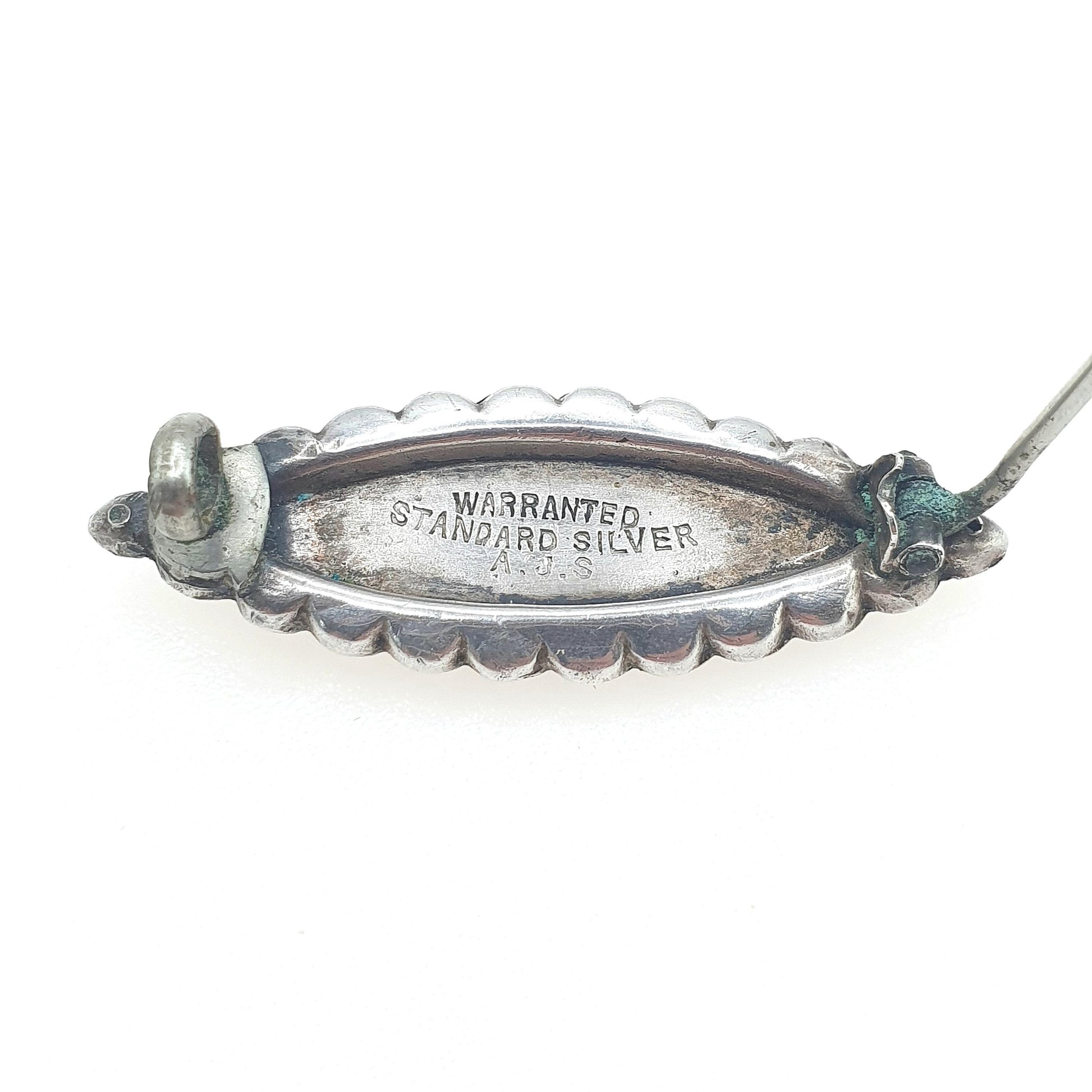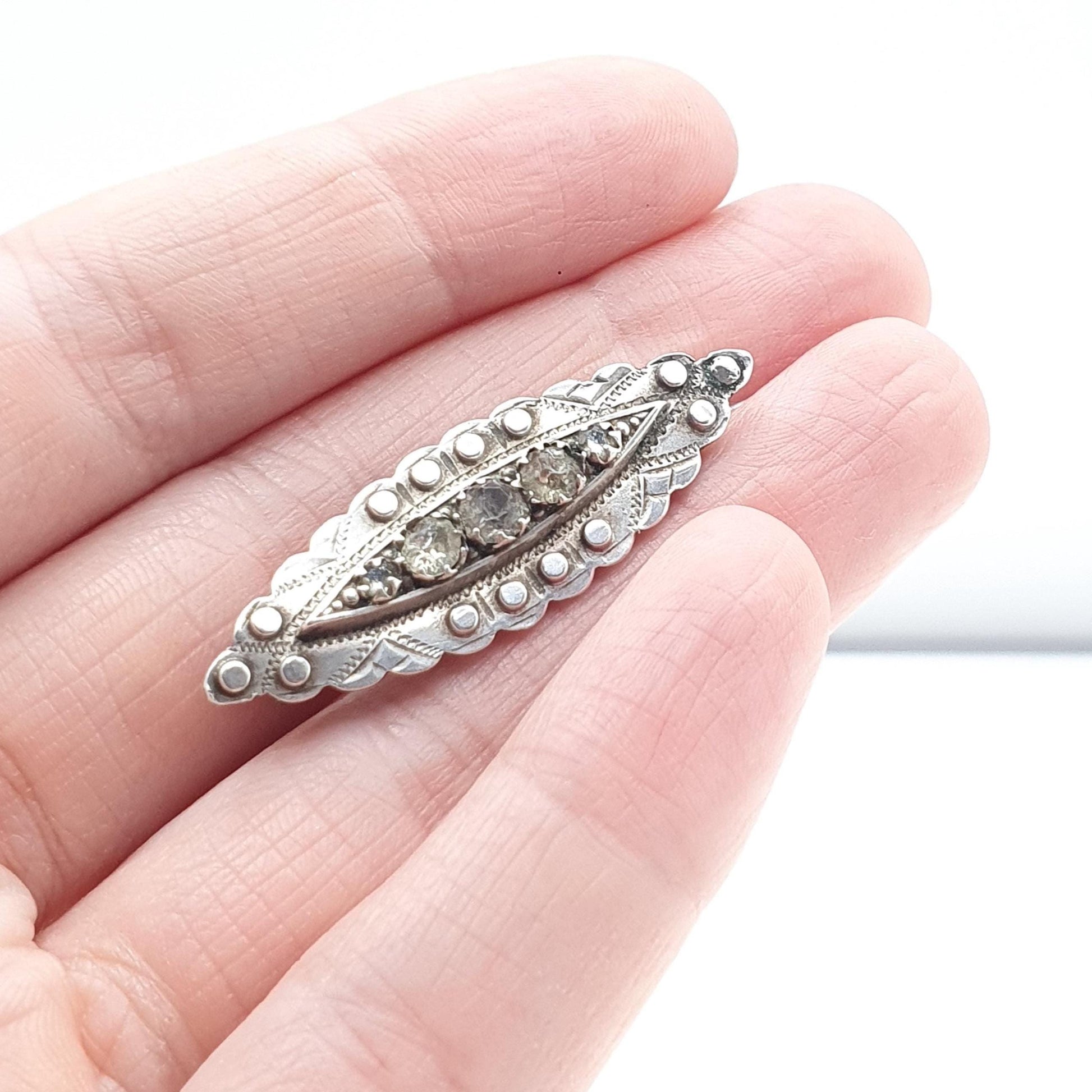 DESCRIPTION: A beautiful antique, sterling silver, ellipse shaped brooch adorned with diamond pastes. This item weighs 2.95g and is stamped 'STANDARD SILVER'. The size dimensions are in the latter photos. PLEASE NOTE: Some of the pastes are chipped and have darkened with age (see pictures/video).