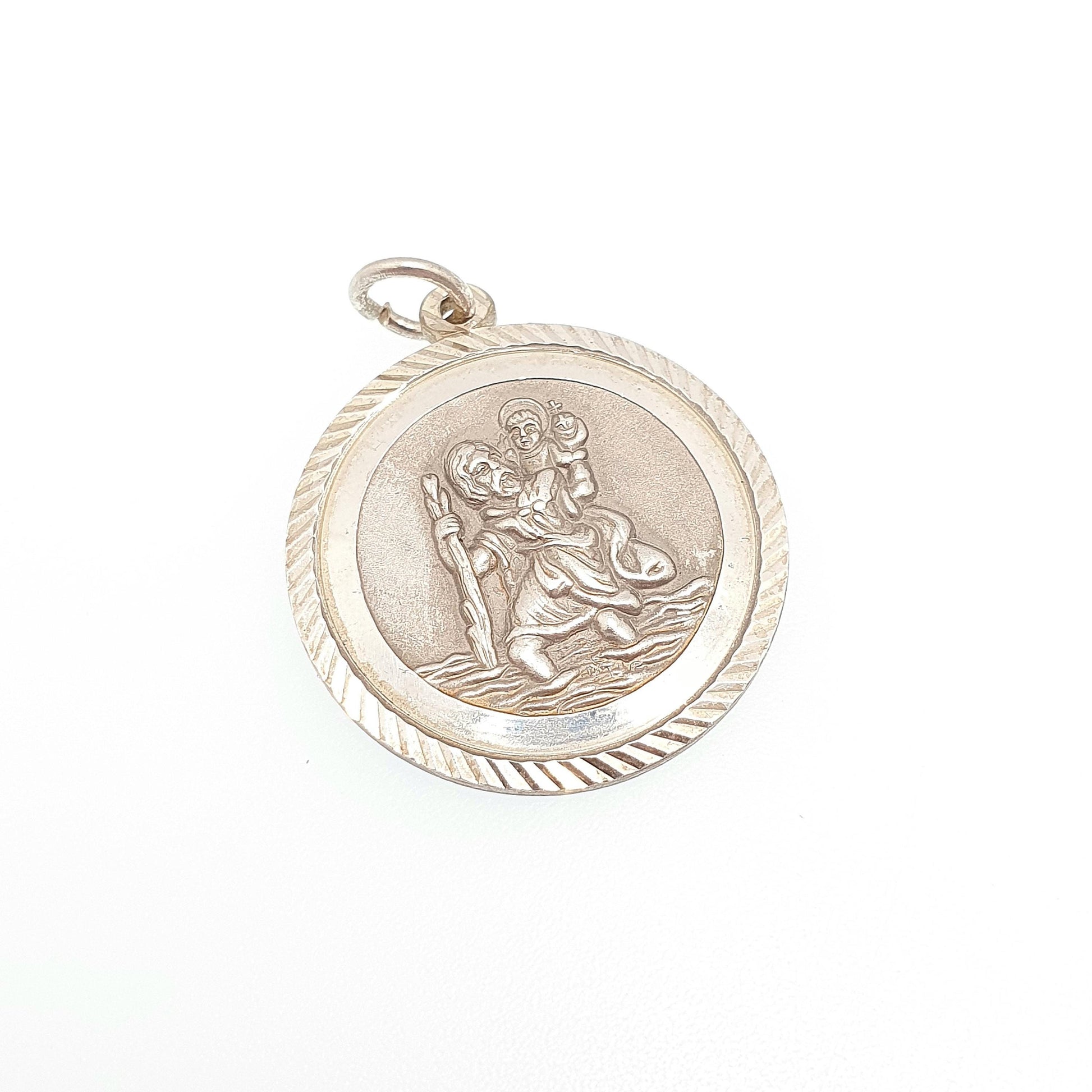 DESCRIPTION: A genuine Georg Jensen vintage sterling silver St Christopher pendant necklace. The item has been crisply moulded with intricate detail. The pendant is stamped "SILVER", along with Georg Jensen's makers mark. It weighs 6.34g and the size dimensions are in the later photos. As to be expected with the item age, it has some marks in areas.