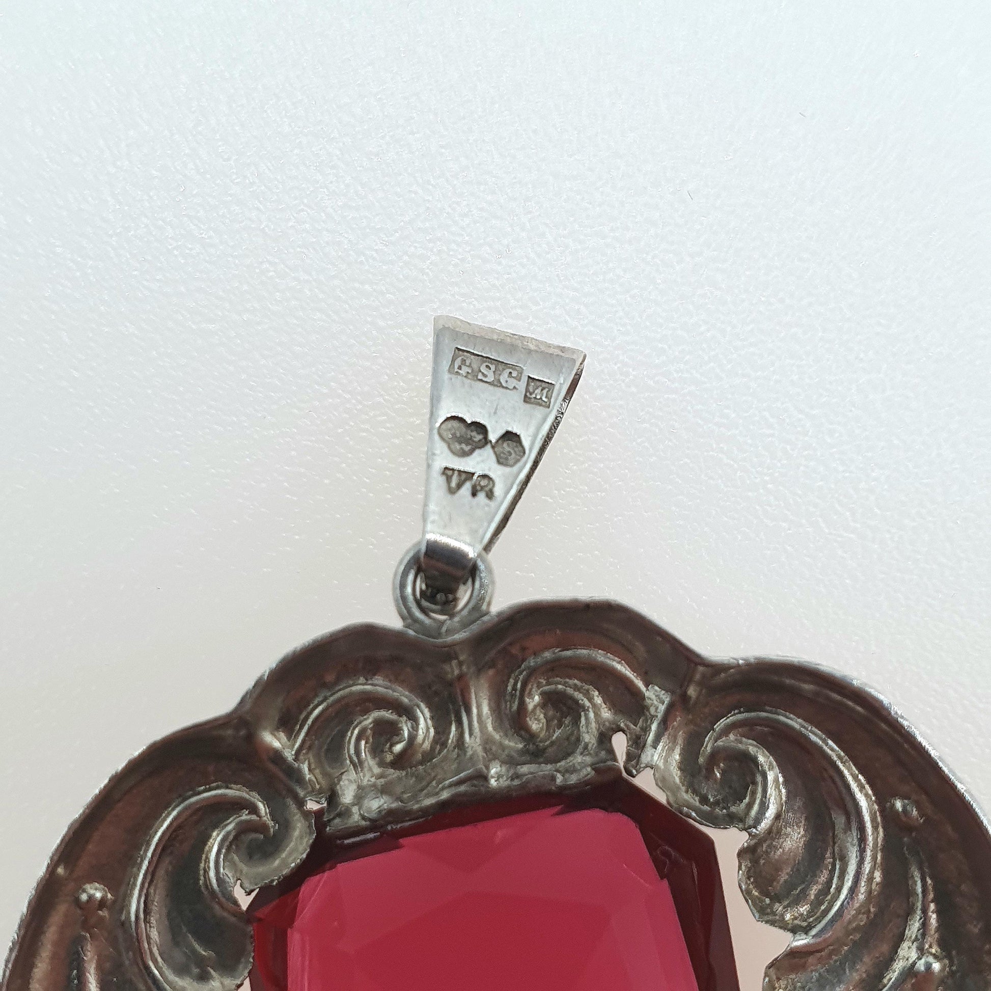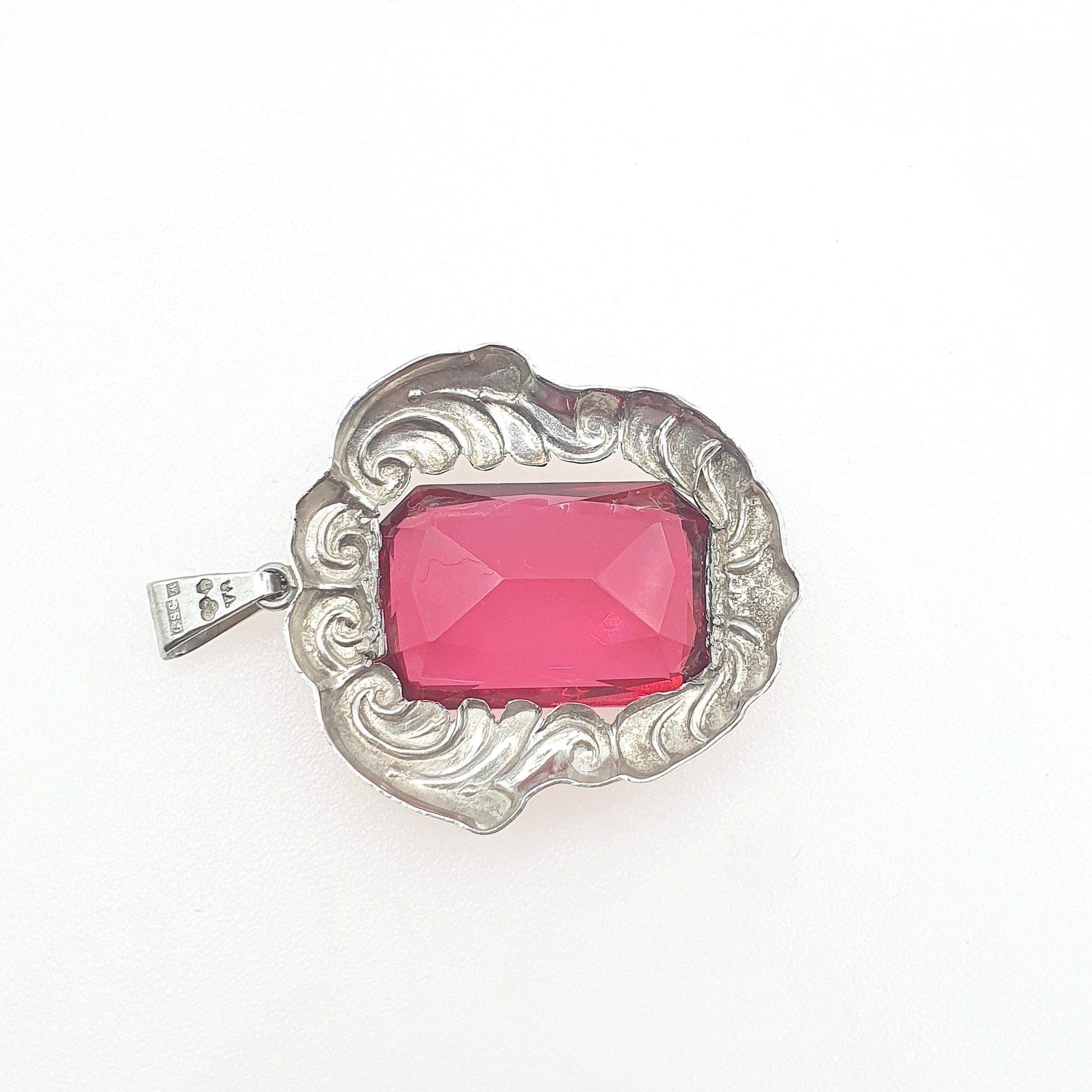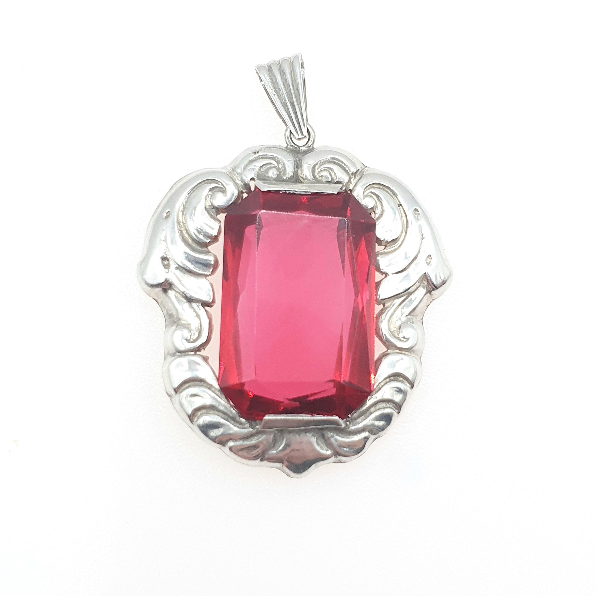 Old Vintage Solid Silver Ruby Paste Pendant Swedish Hallmark Art Nouveau Style Large Big Red Glass Jewelry Jewellery
