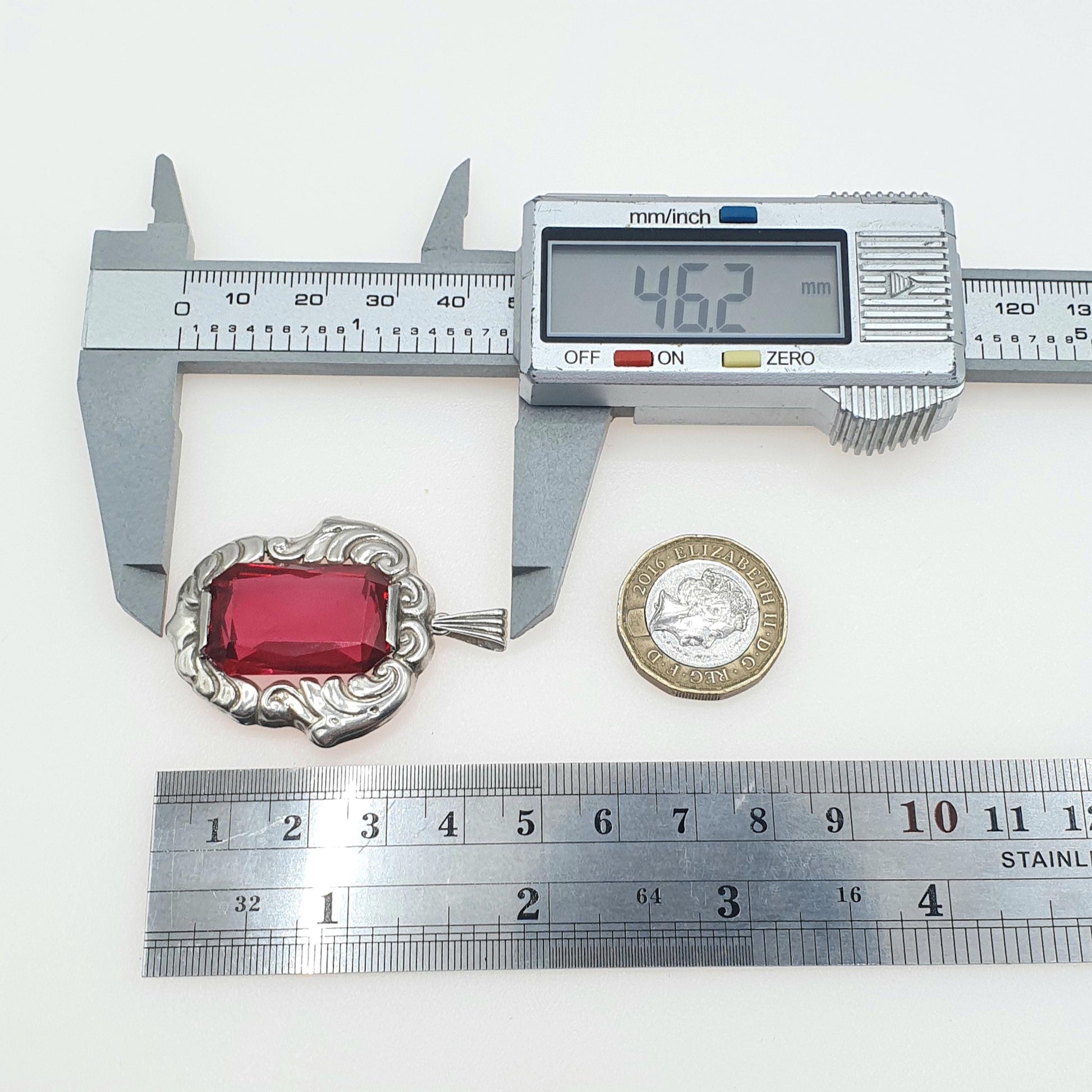 DESCRIPTION: A beautiful vintage Swedish solid silver pendant, adorned with a large ruby tone paste. The brooch is stamped "V8 1947", a Swedish hallmark for silver. It weighs approx. 9.45g and the size dimensions are in the later photos. As to be expected with age and use, the ruby tone paste has some surface marks on it.