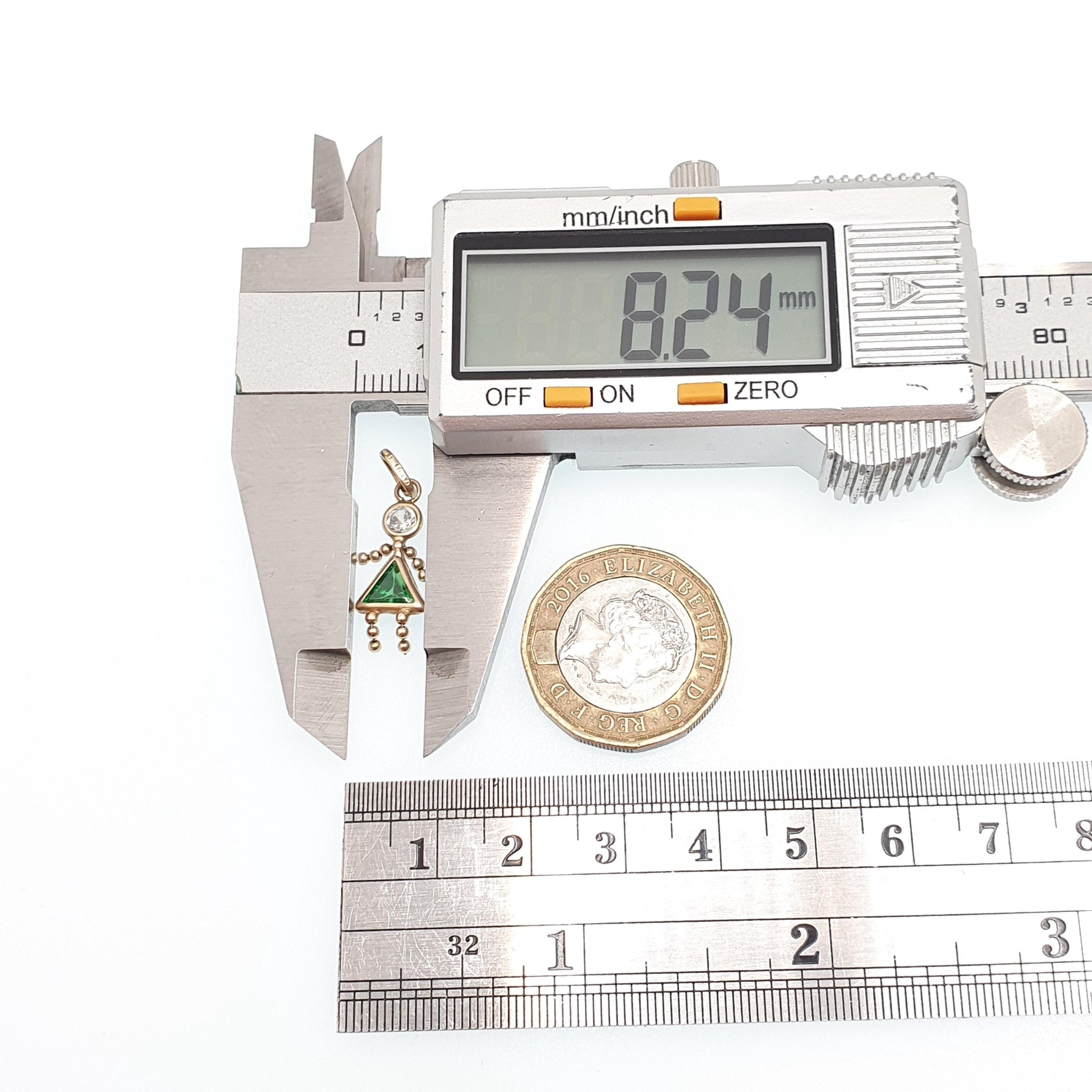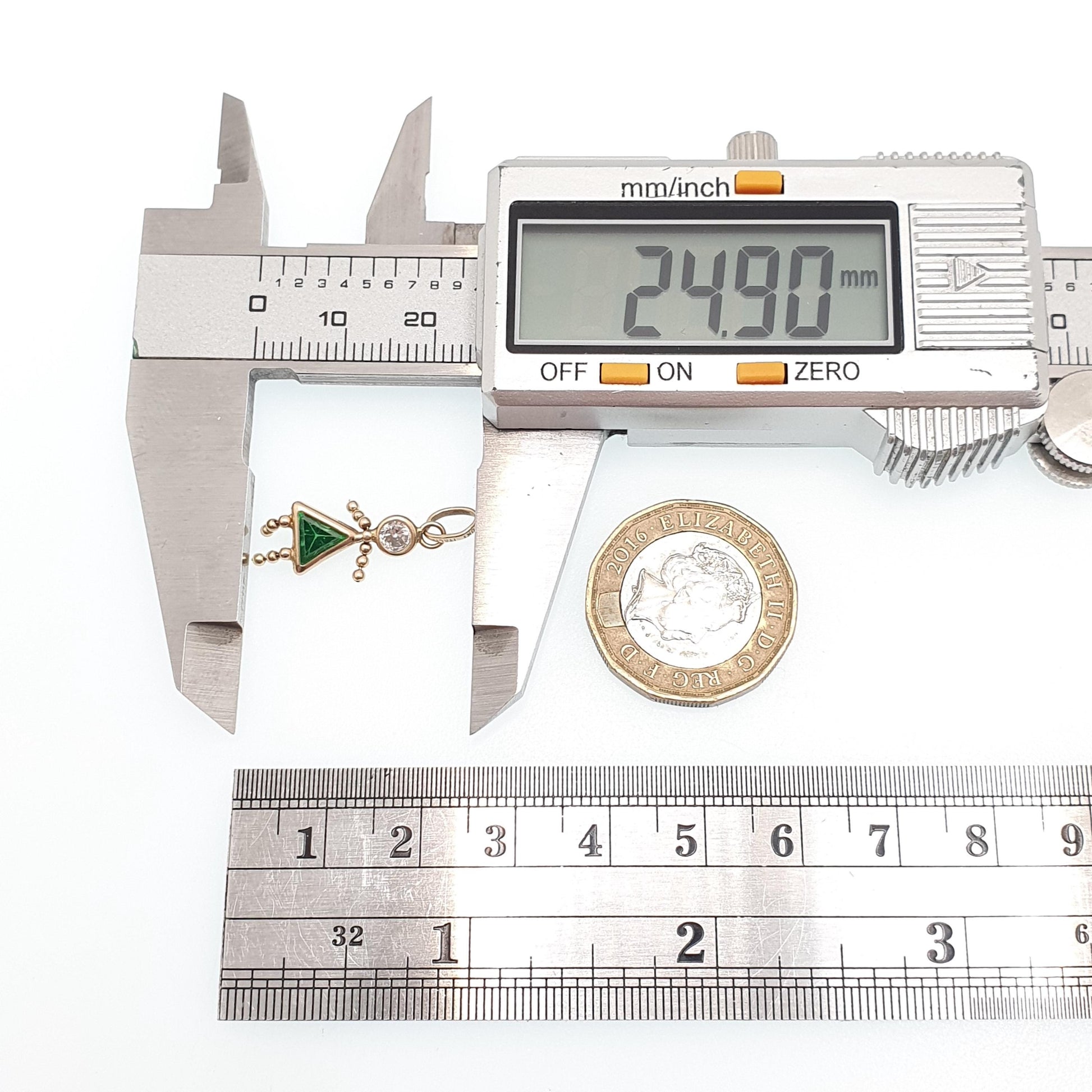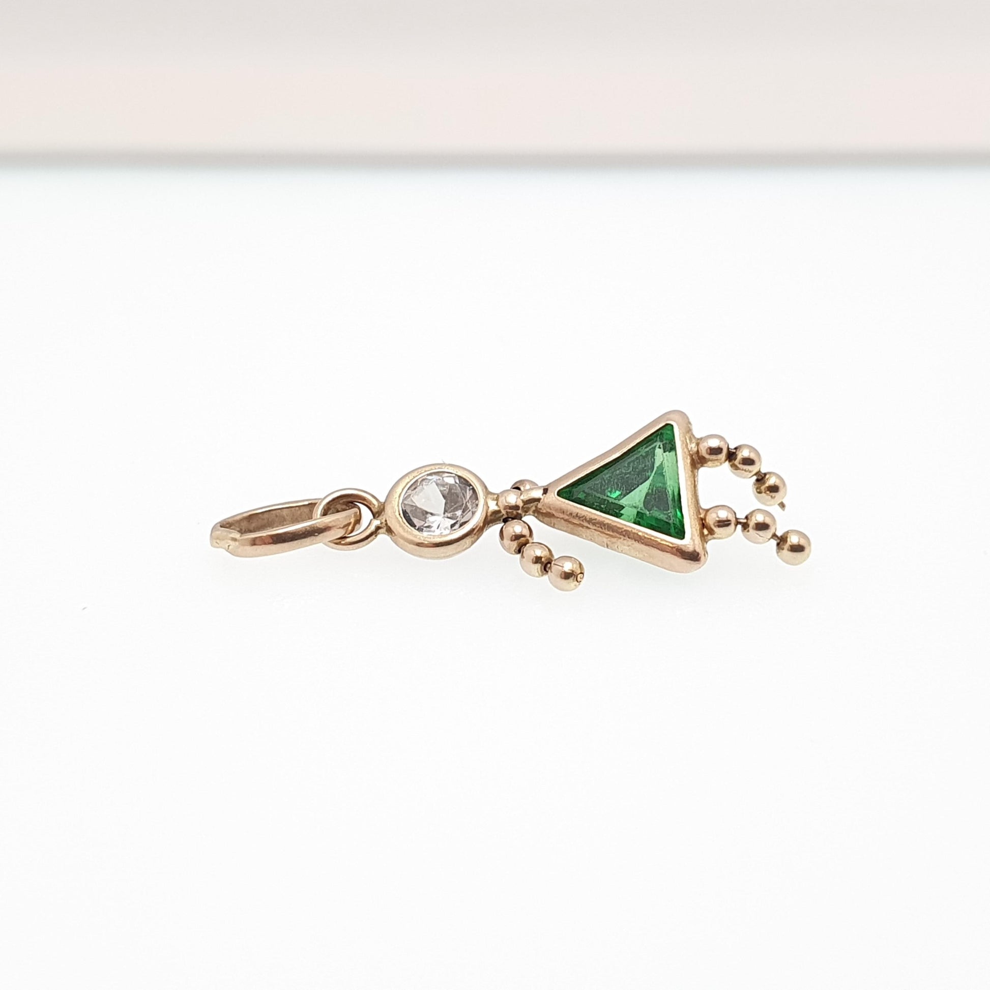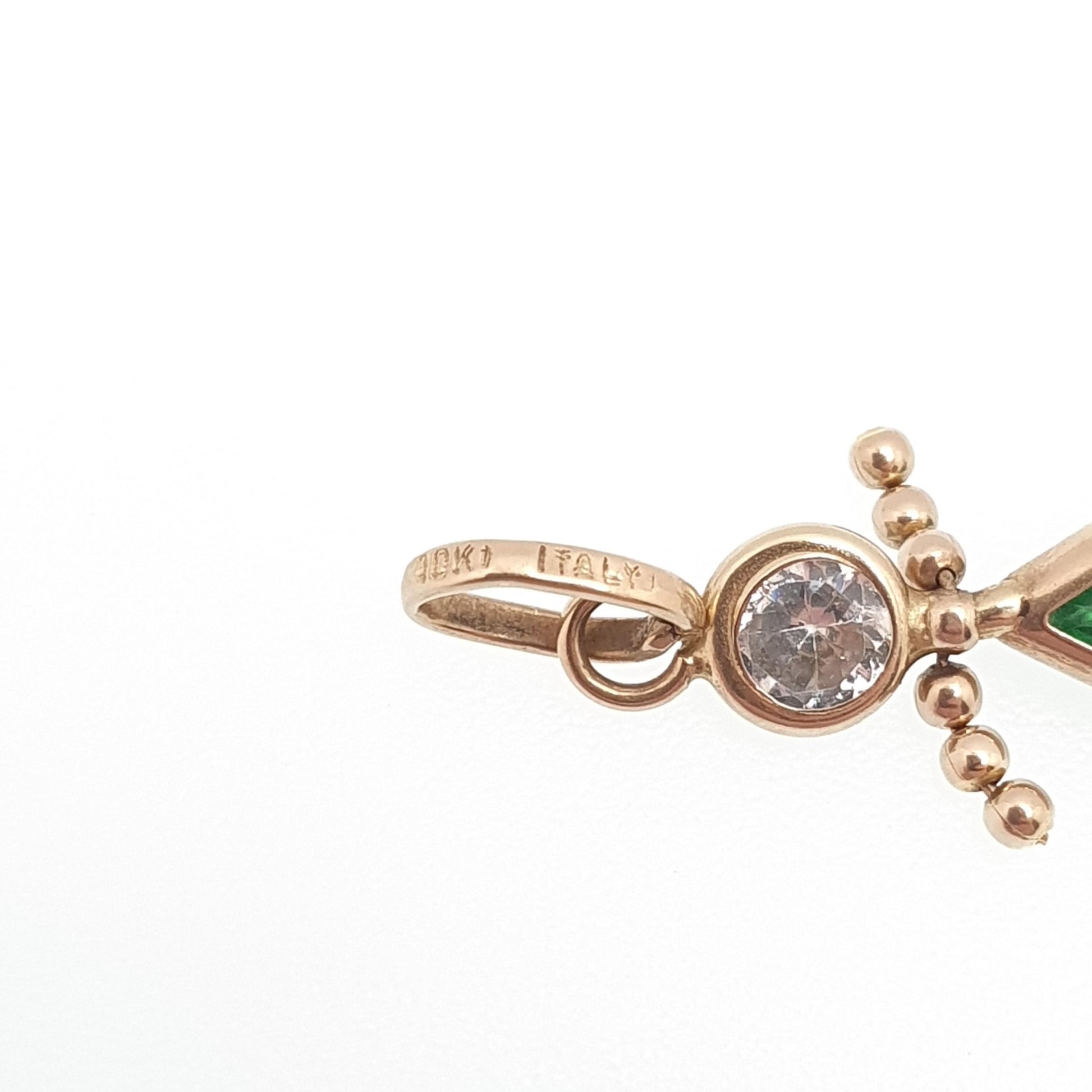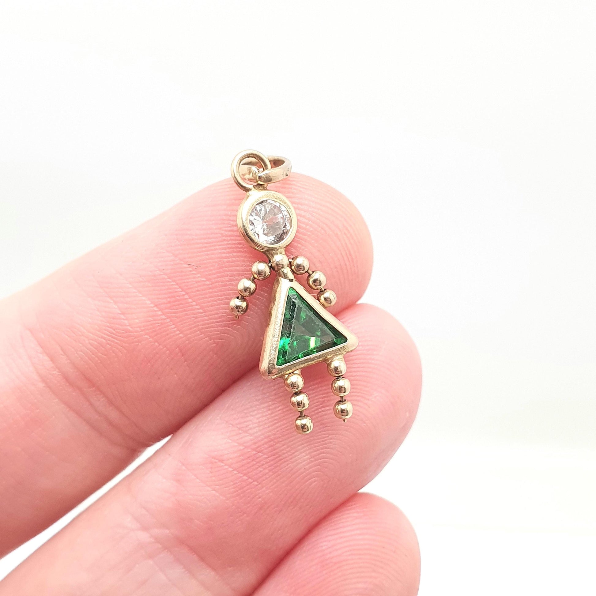 DESCRIPTION: A sweet vintage solid 10k gold girl doll pendant/charm, adorned with a emerald tone and diamond tone pastes (glass). The item is stamped "417" for 10k gold and weighs approx. 0.88g. The size dimensions are in the later photos. The emerald tone paste has some minor rubbing on the face.