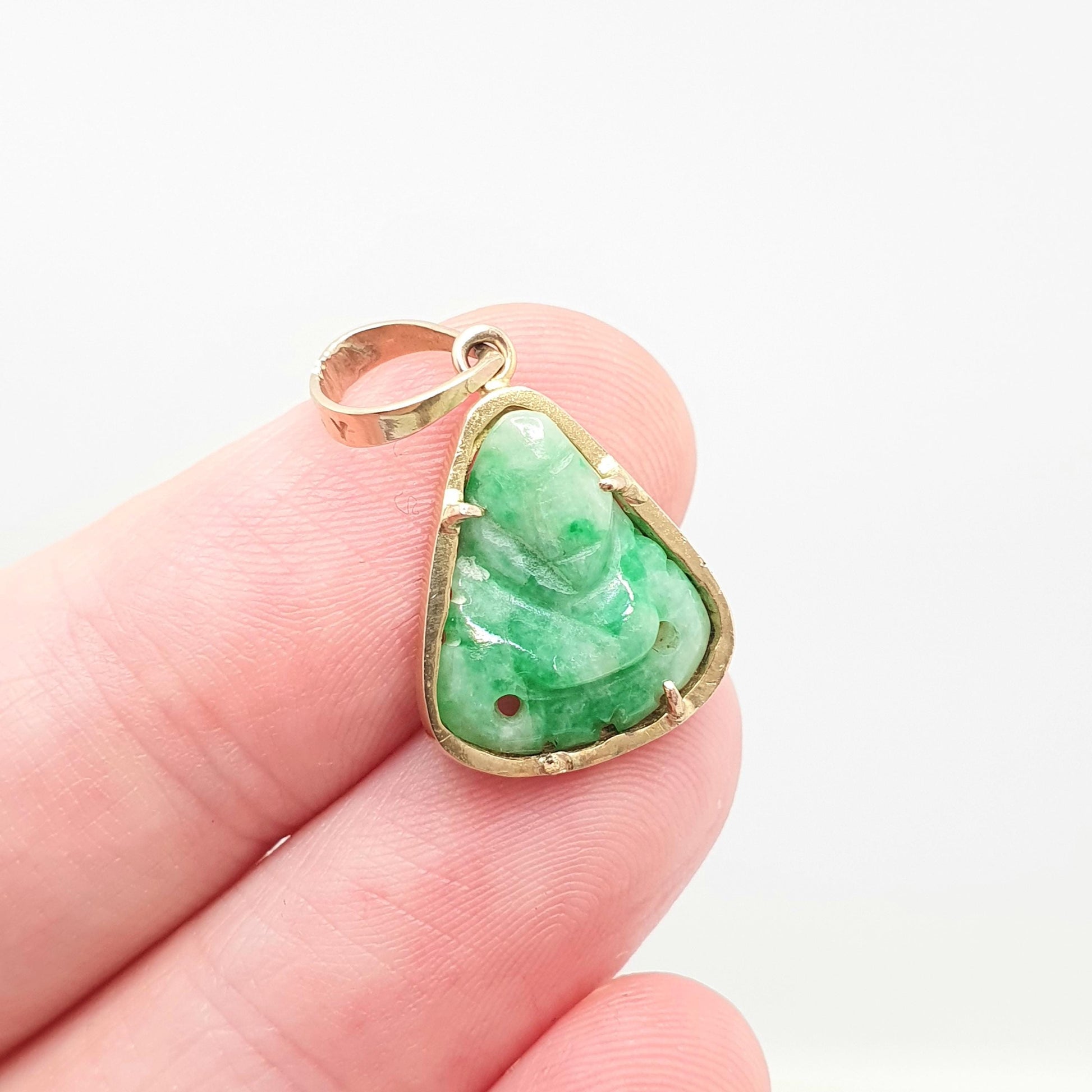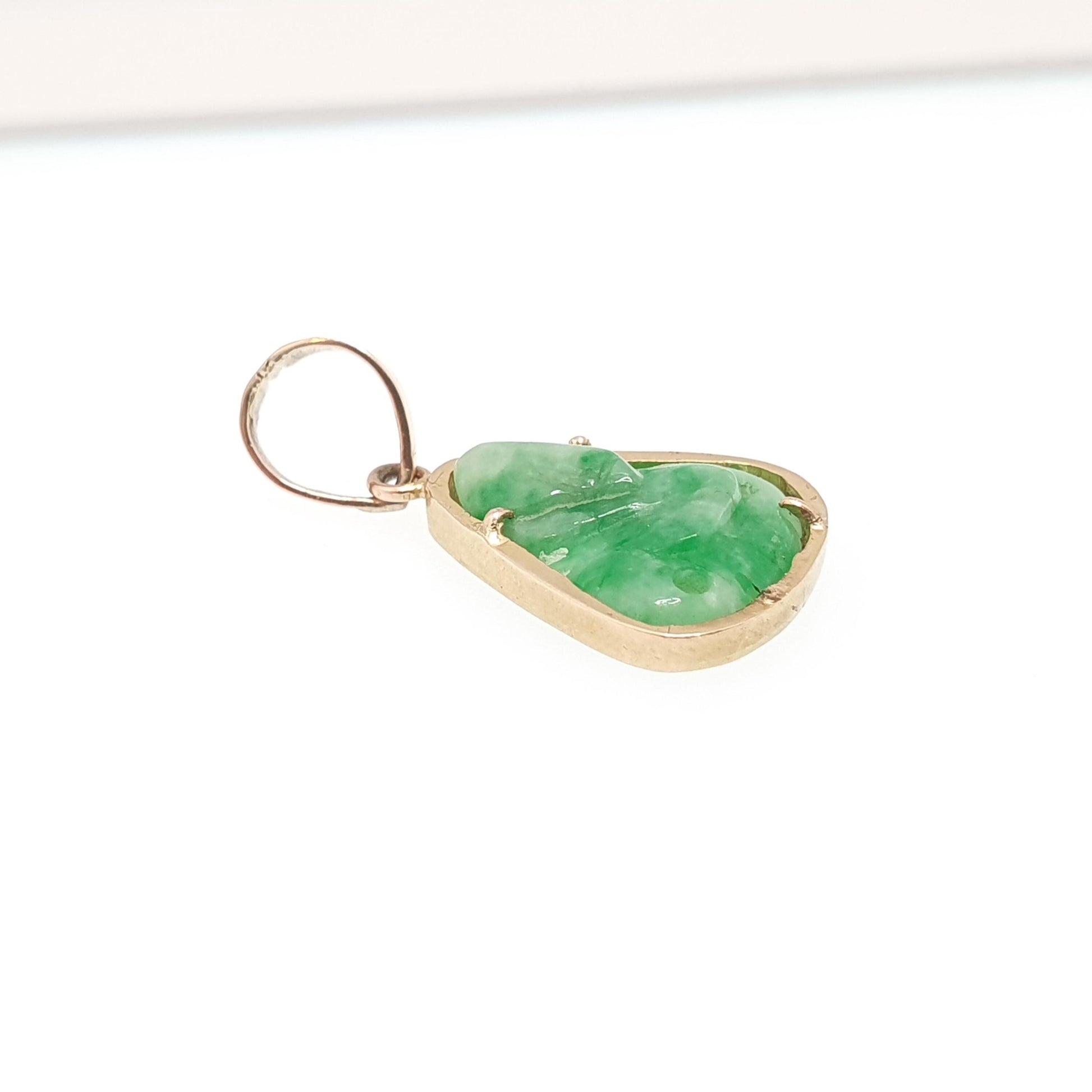 DESCRIPTION: A gorgeous vintage solid 14k gold carved jade pendant. The item weighs approx. 2.07g and the size dimensions are in the later photos. It's stamped "585 14K" for 14k gold.