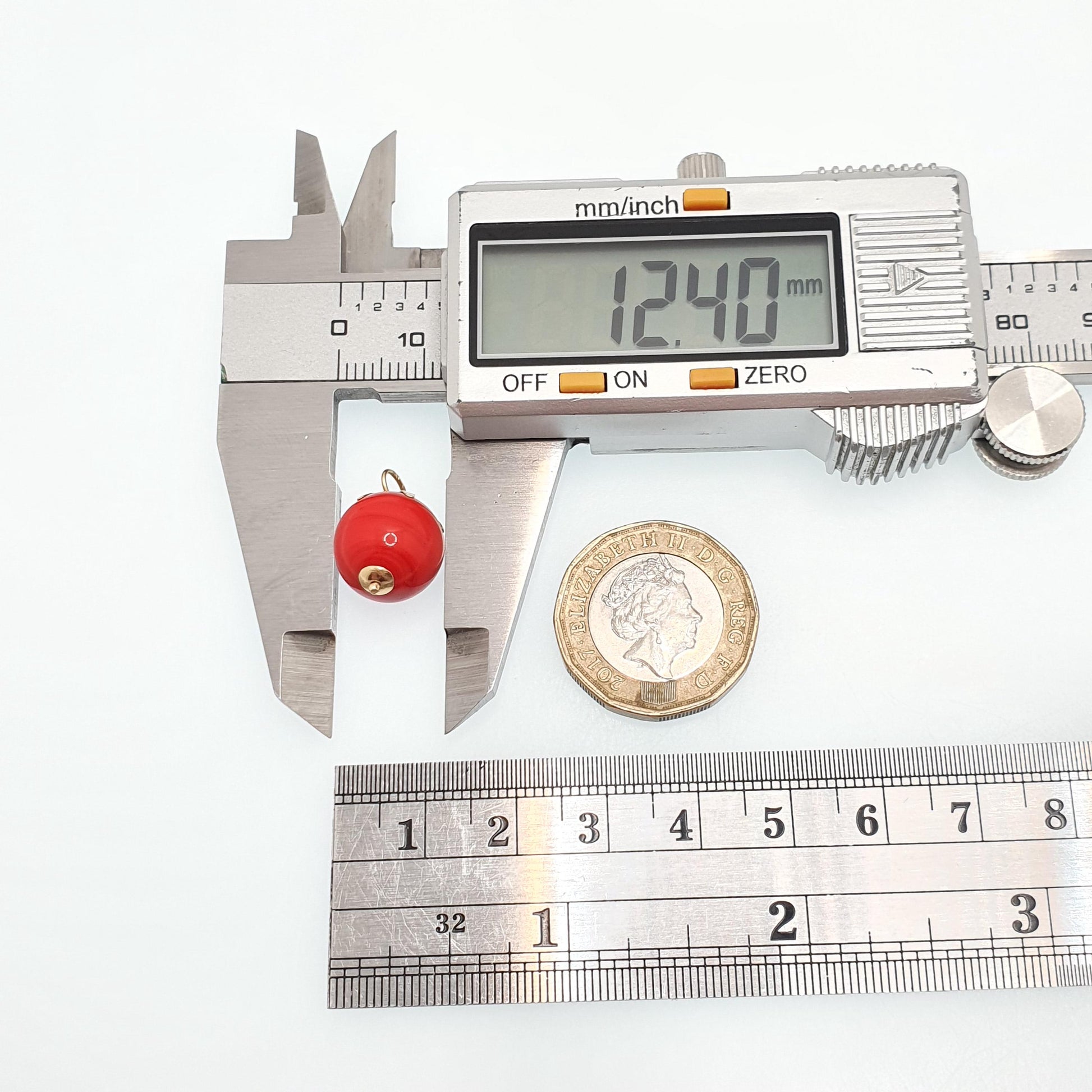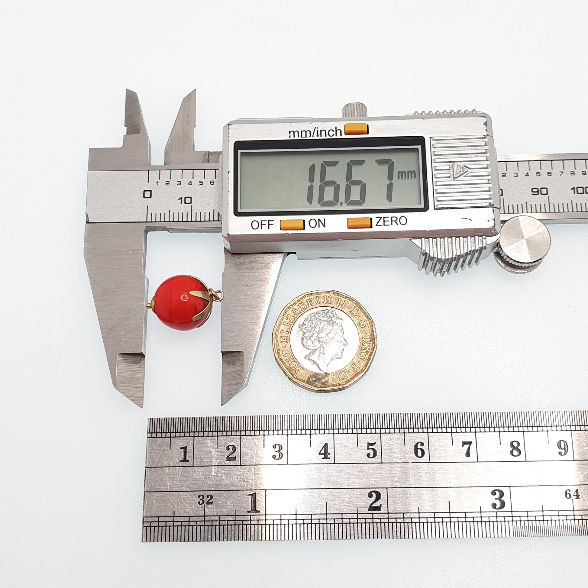 DESCRIPTION: A sweet vintage solid 18ct gold tomato pendant, made from Venetian Murano glass. All the gold is solid 18ct gold and the red section is glass. It weighs approx. 2.88g and the size dimensions are in the later photos. It's stamped with foreign gold marks which are difficult to make out, it tests for solid 18ct gold.