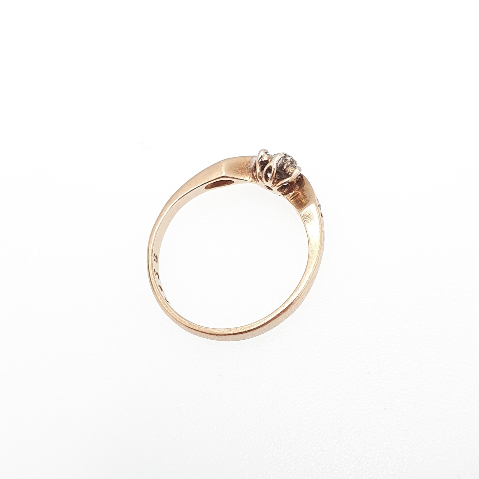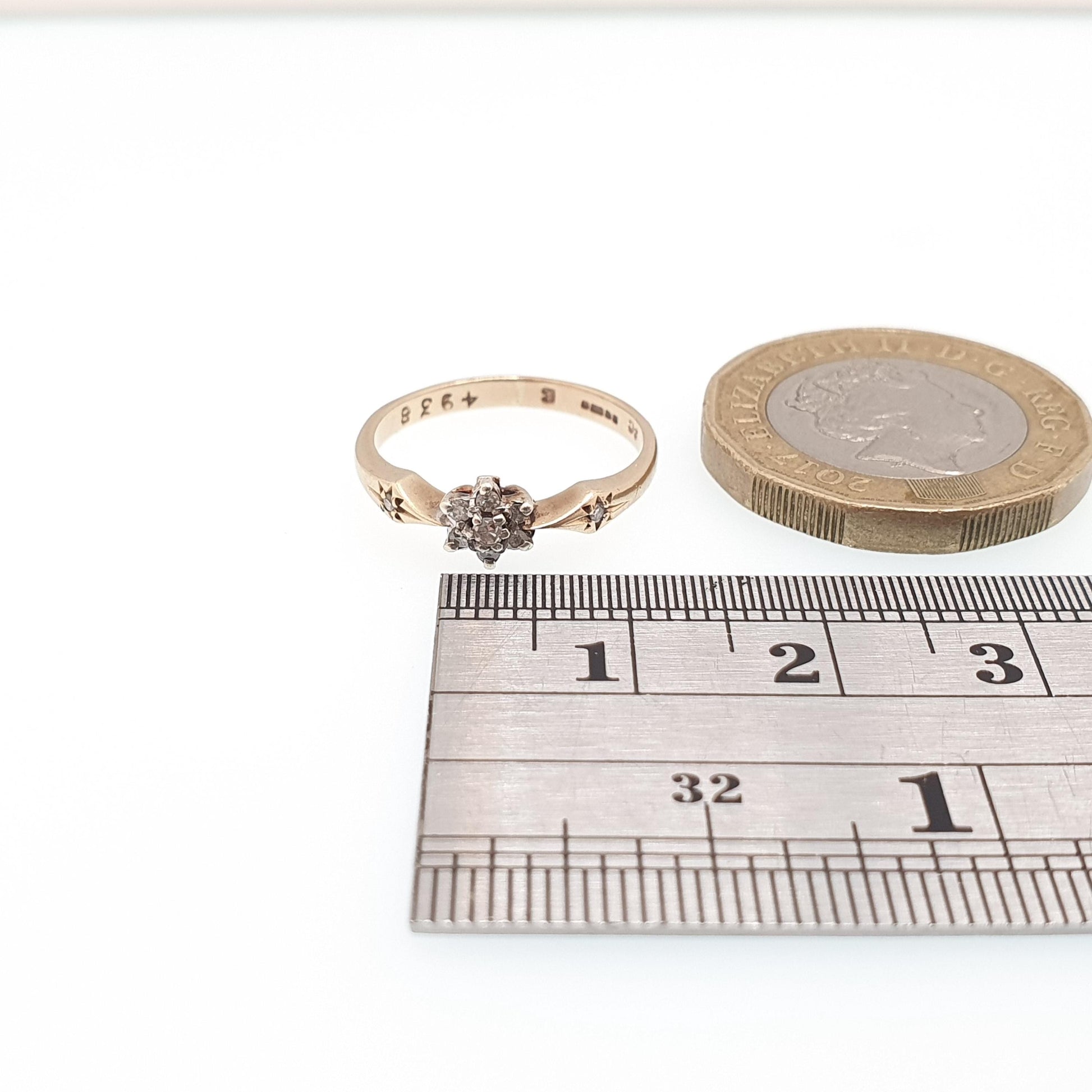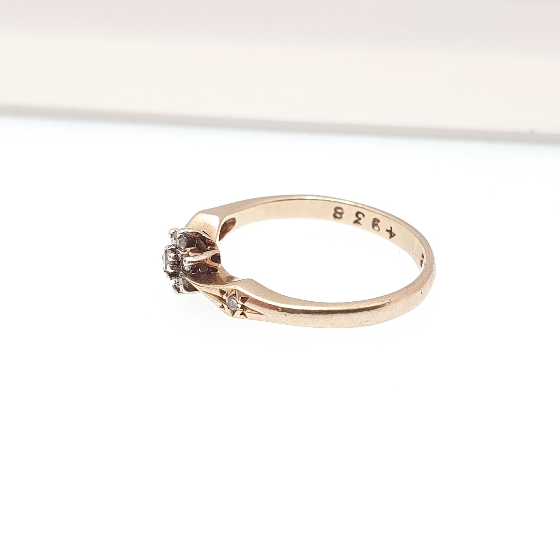 DESCRIPTION: A beautiful vintage solid 9ct gold ring, adorned with numerous natural diamonds. The ring is hallmarked for 9ct gold, dating to 1983. It weighs approx. 1.46g and sizes at approx. UK J.5 or US 5.