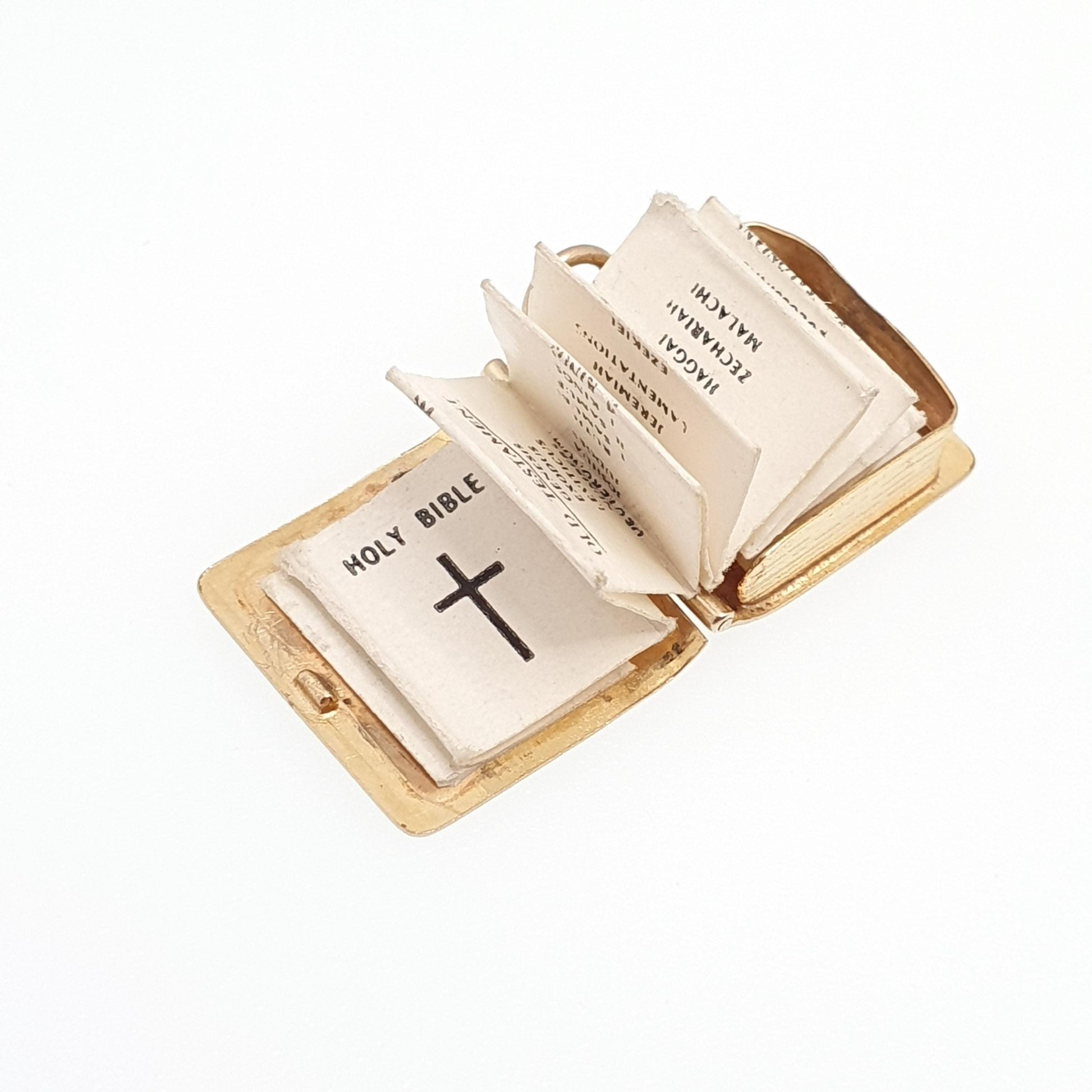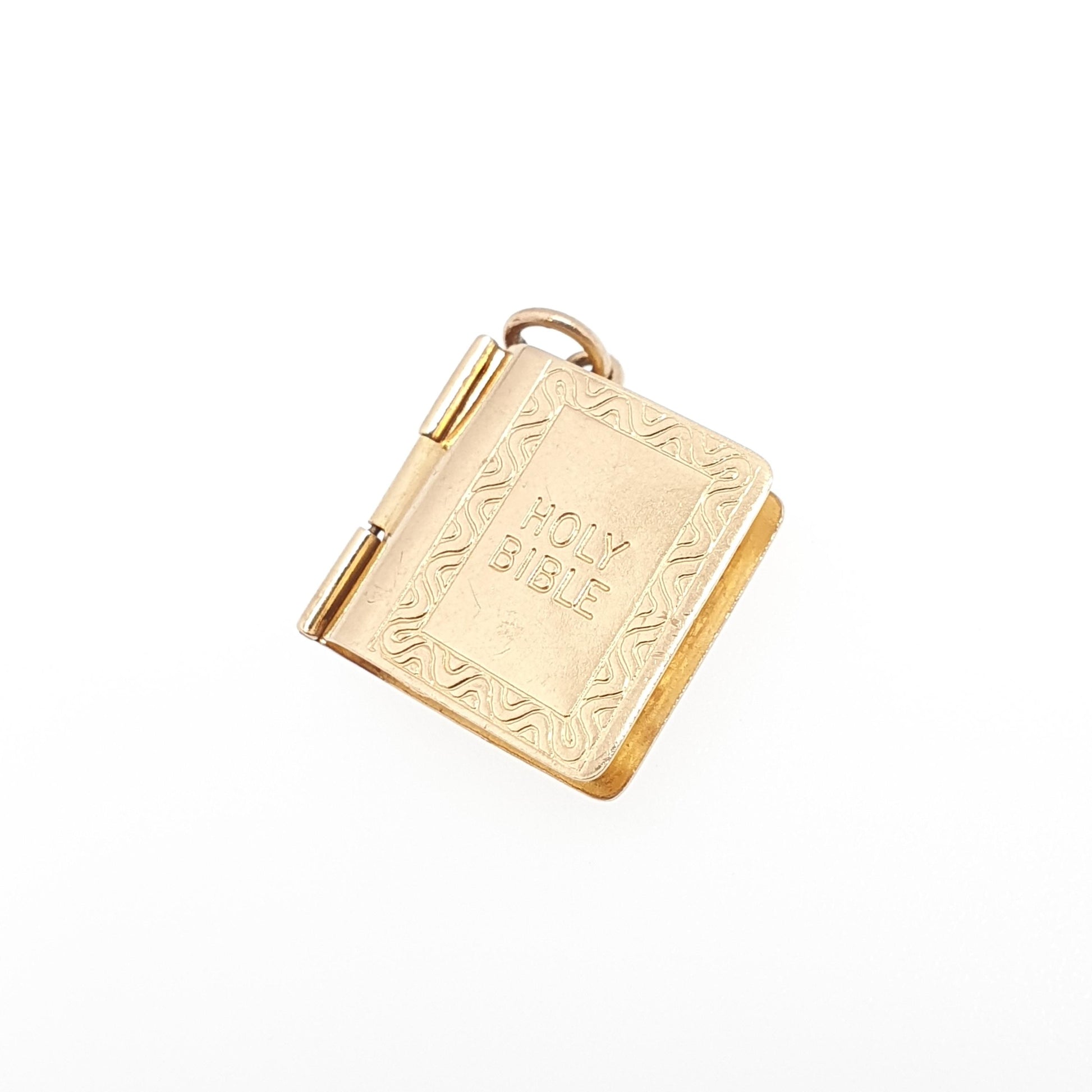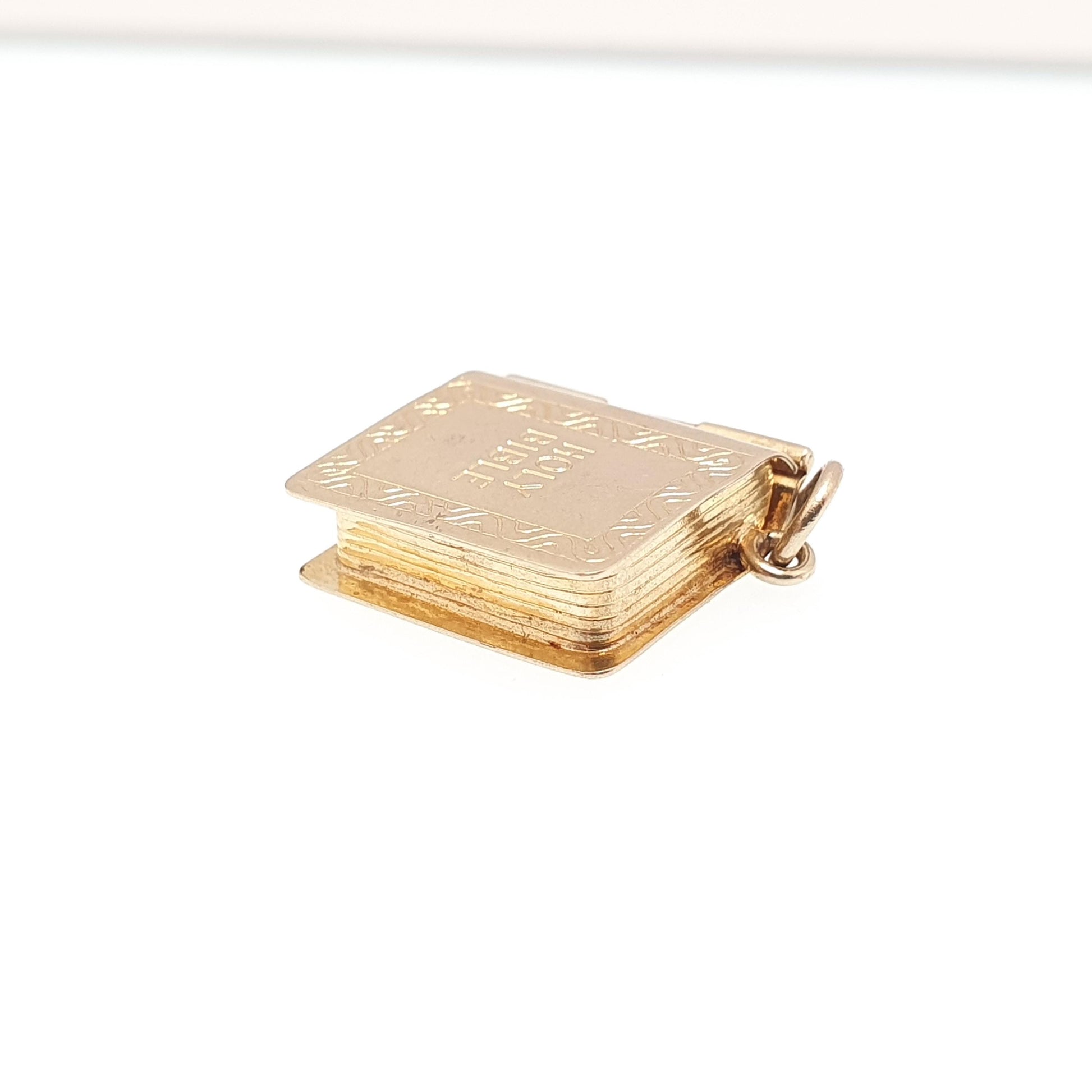 DESCRIPTION: A brilliant quality vintage solid 9ct 375 gold opening bible charm/pendant. The charm opens to reveal it's original paper insert with the Old and New Testament book titles. The item weighs approx. 2.21g and is fully hallmarked for 9ct gold hallmark, dating to 1971. The size dimensions are in the latter photos.