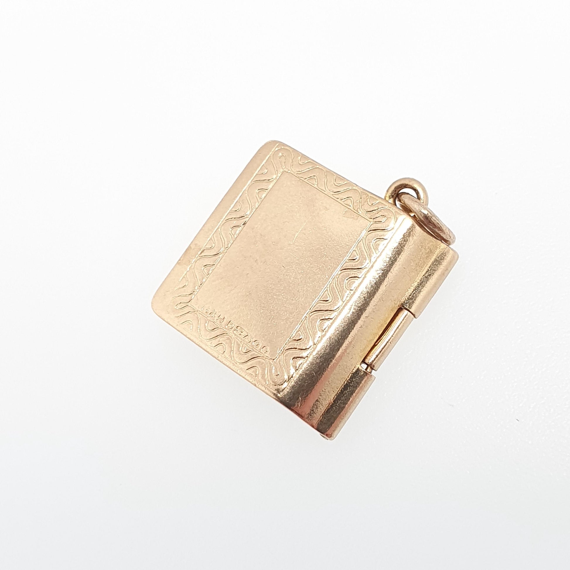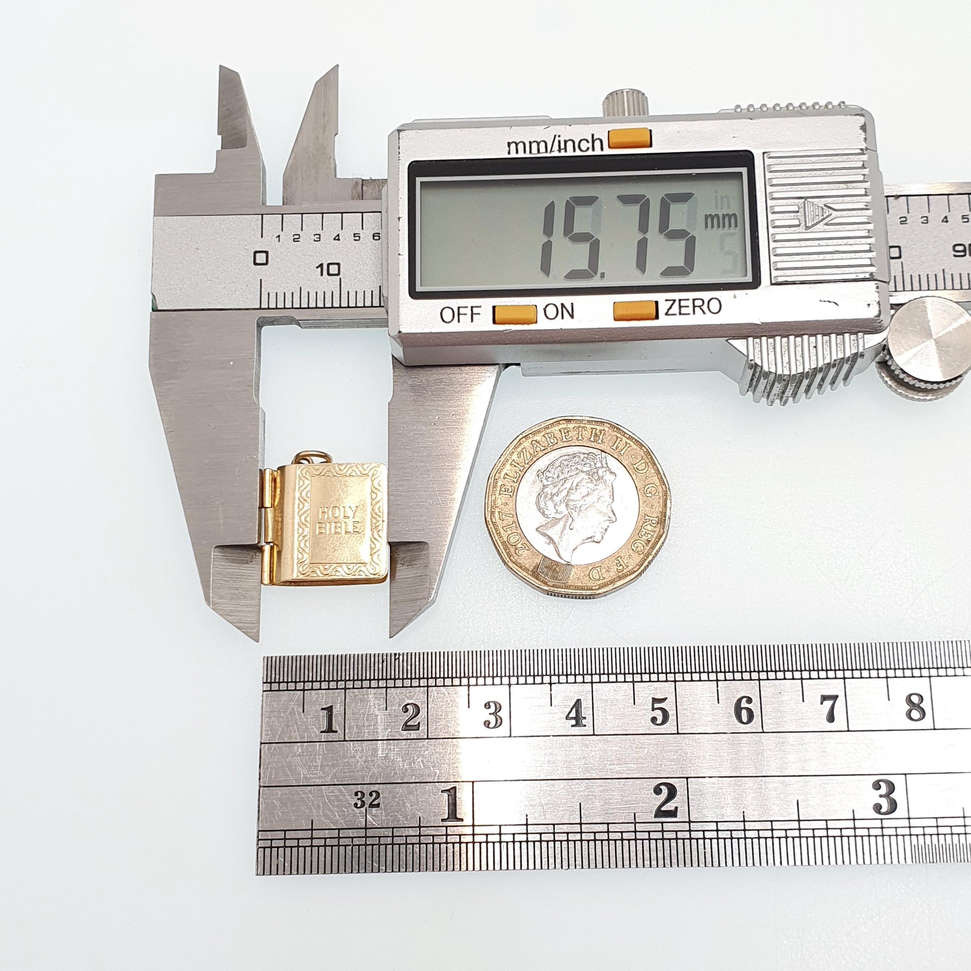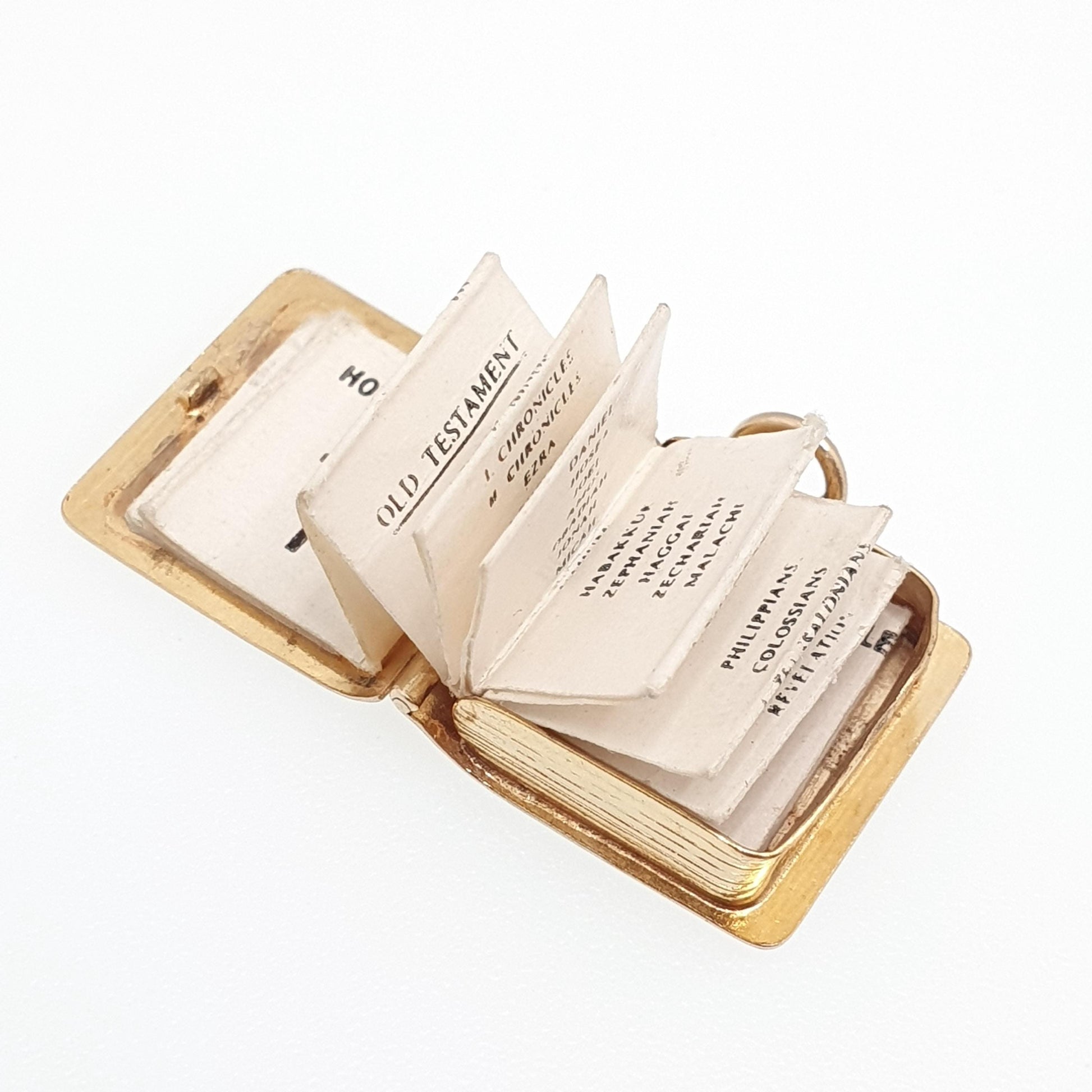 DESCRIPTION: A brilliant quality vintage solid 9ct 375 gold opening bible charm/pendant. The charm opens to reveal it's original paper insert with the Old and New Testament book titles. The item weighs approx. 2.21g and is fully hallmarked for 9ct gold hallmark, dating to 1971. The size dimensions are in the latter photos.