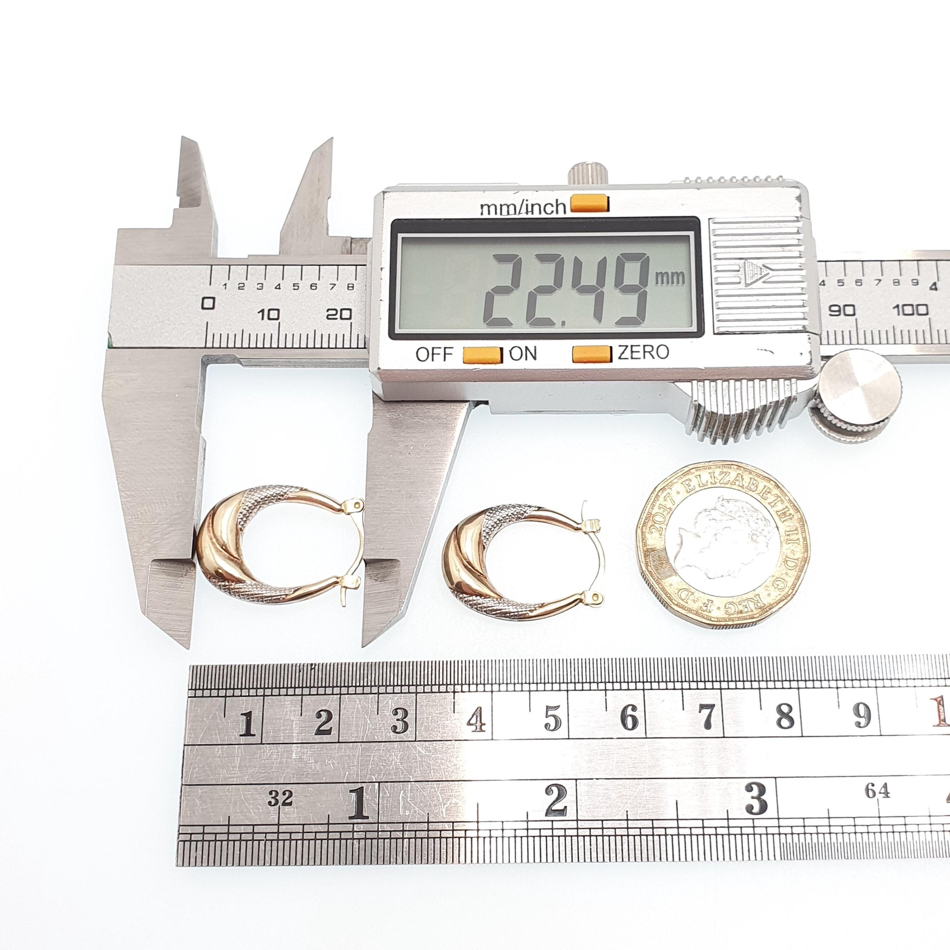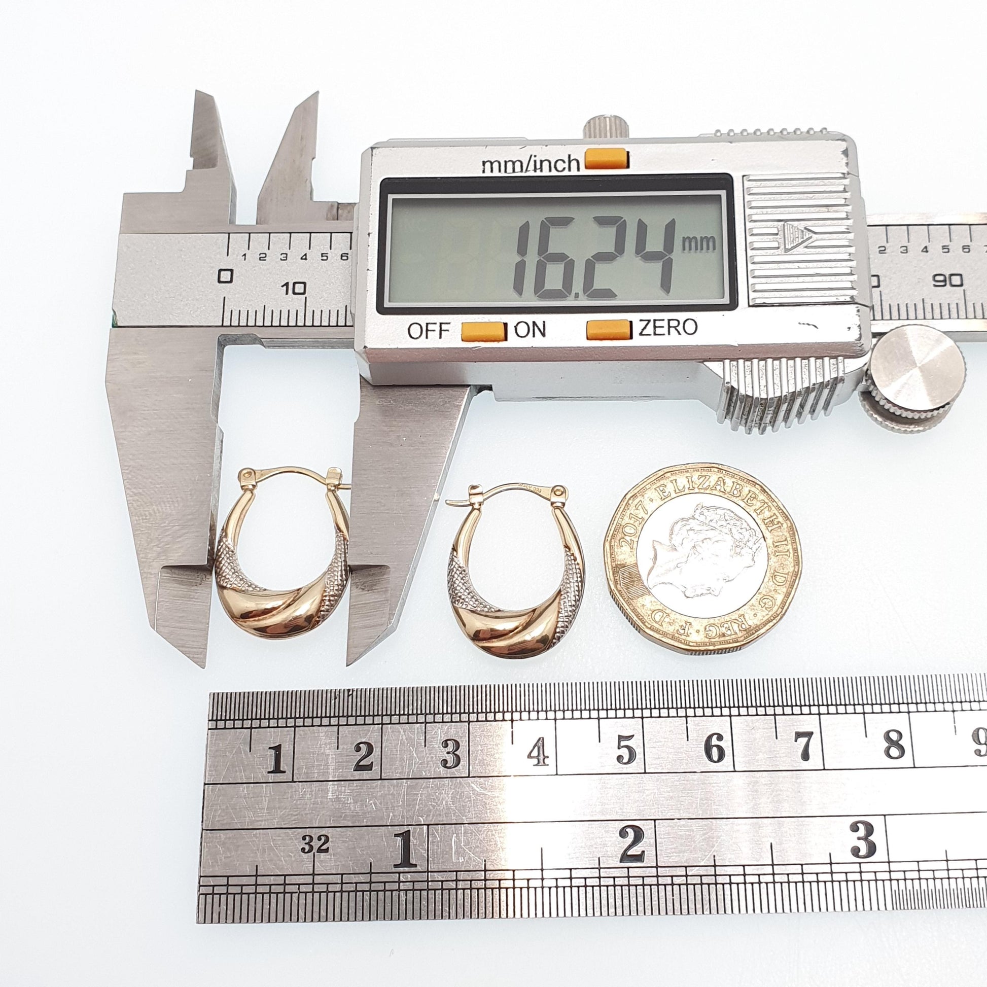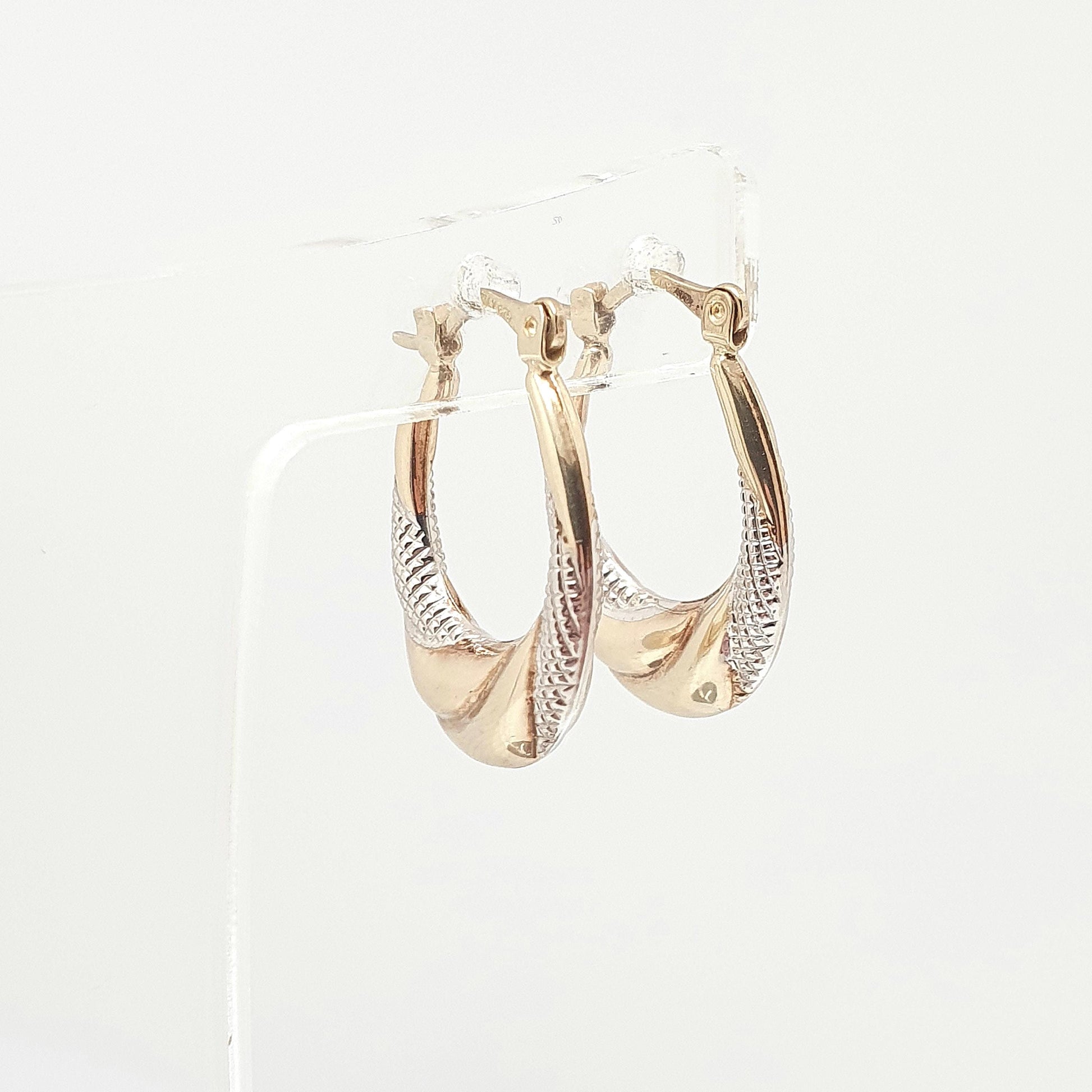 DESCRIPTION: A pair of vintage 9ct white and yellow gold creole hoops earrings. The earrings are stamped "375" and the latches open/close tightly. The total weight is approx. 0.96g and they're hollow in the core. The size dimensions are in the later photos.