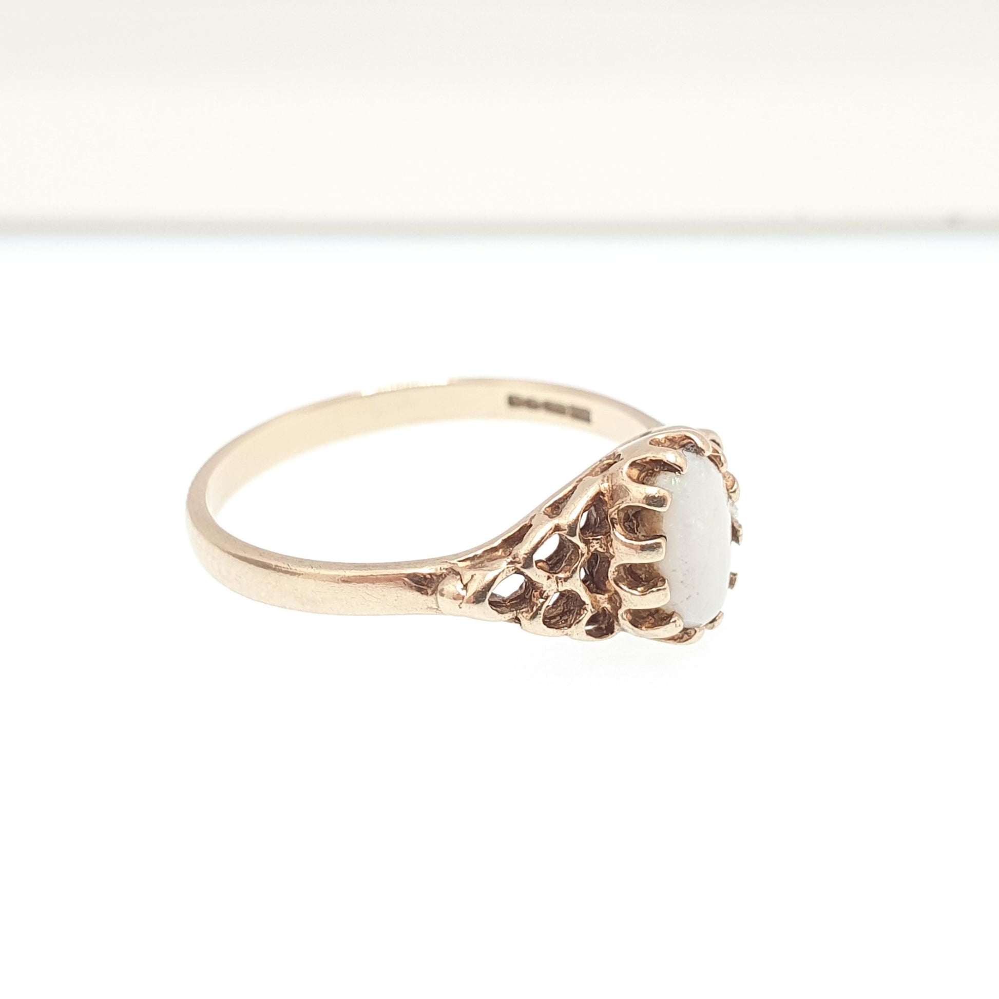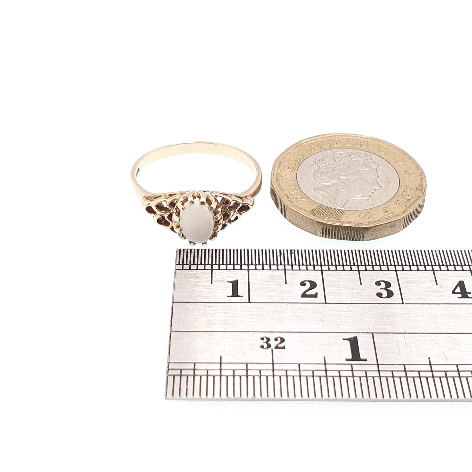 DESCRIPTION: A lovely solid 9ct 375 gold ring, adorned with a white opal gemstone. It sizes at approx. UK P.5 or US 8 and weighs approx. 2.05g. The ring is fully hallmarked for 9ct gold, dating to 2001.