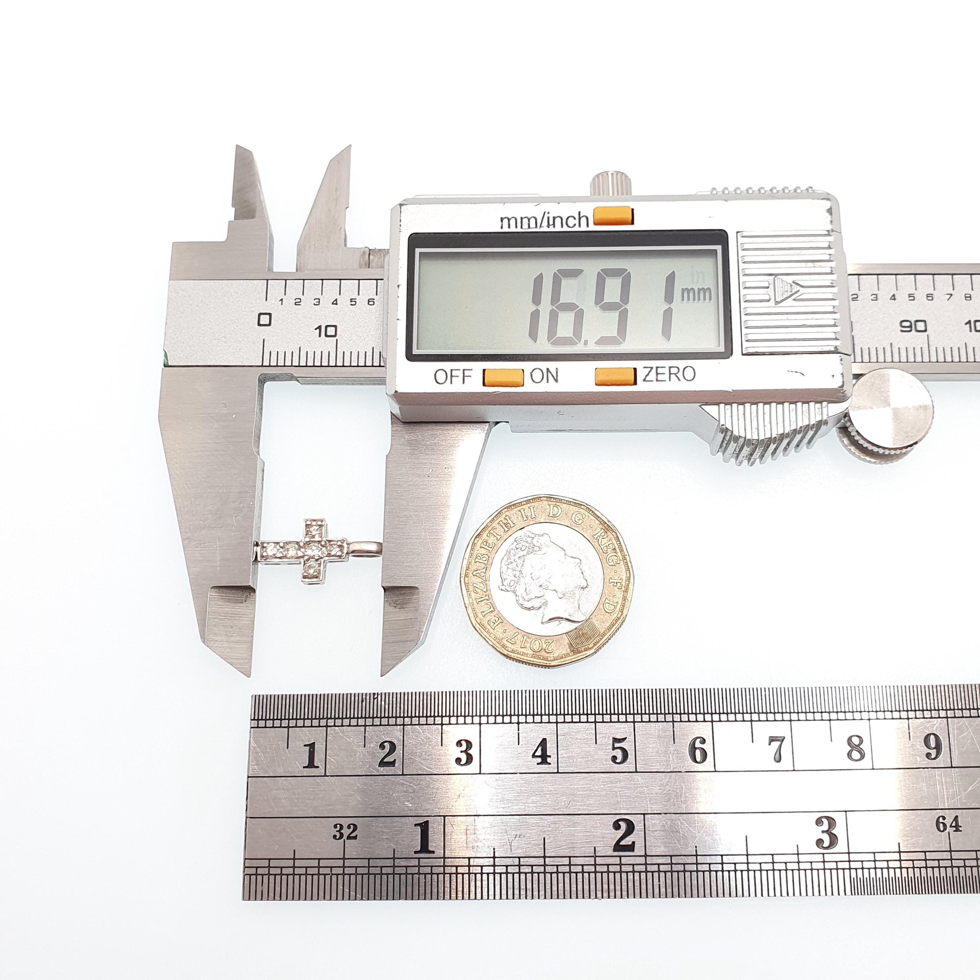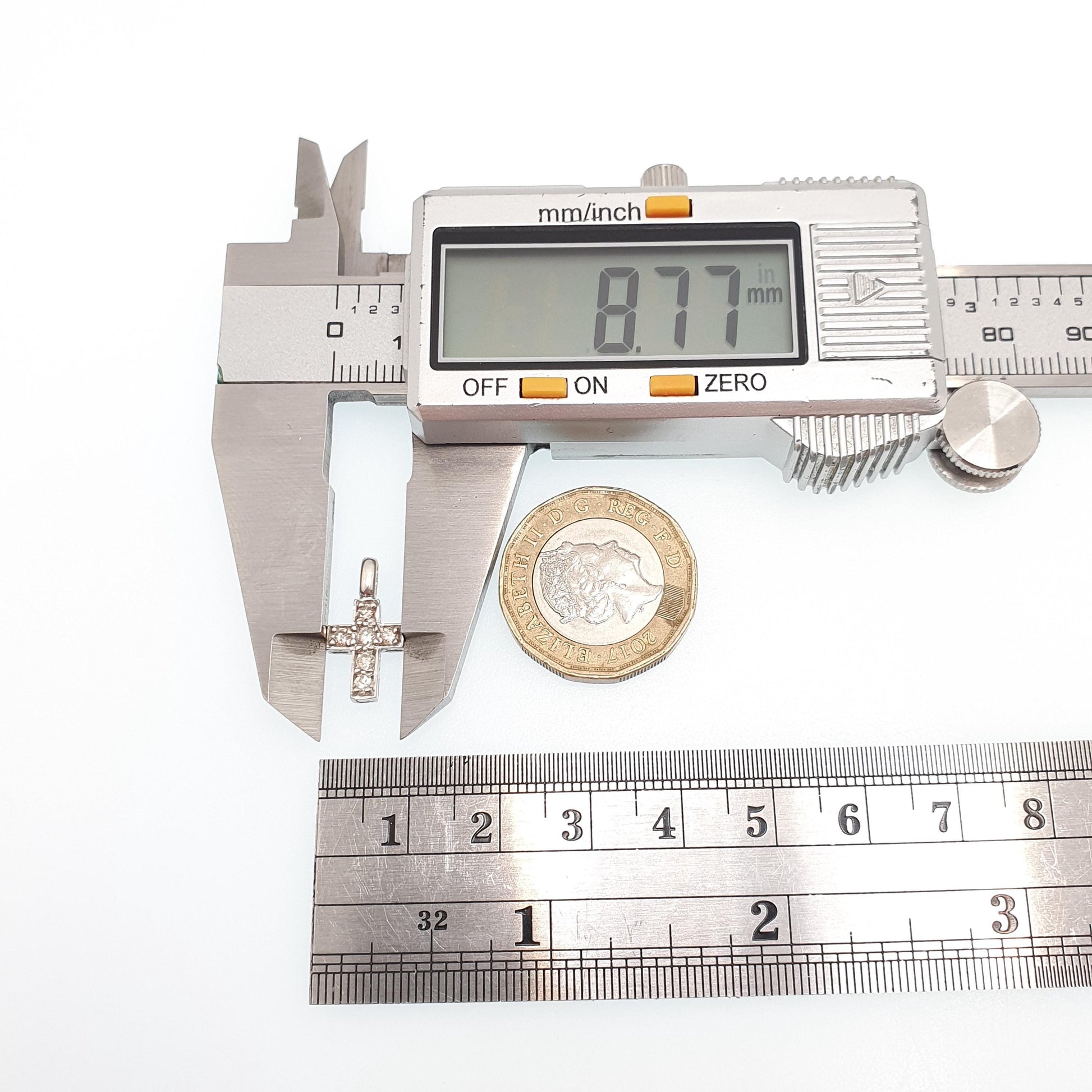 DESCRIPTION: A beautiful solid 9ct 375 white gold crucifix pendant, adorned with a genuine natural diamonds (100% tested). The pendant weight approx. 0.90g and the size dimensions are in the latter photos. It's hallmarked for 9ct gold.