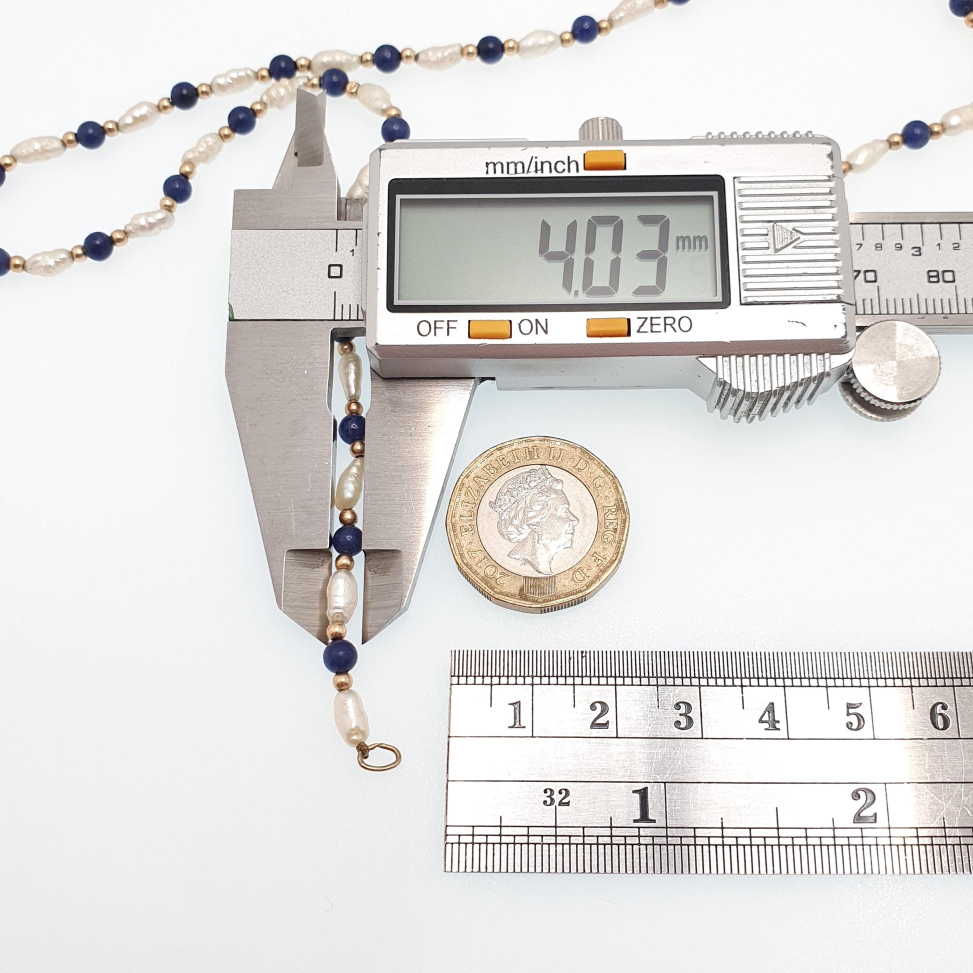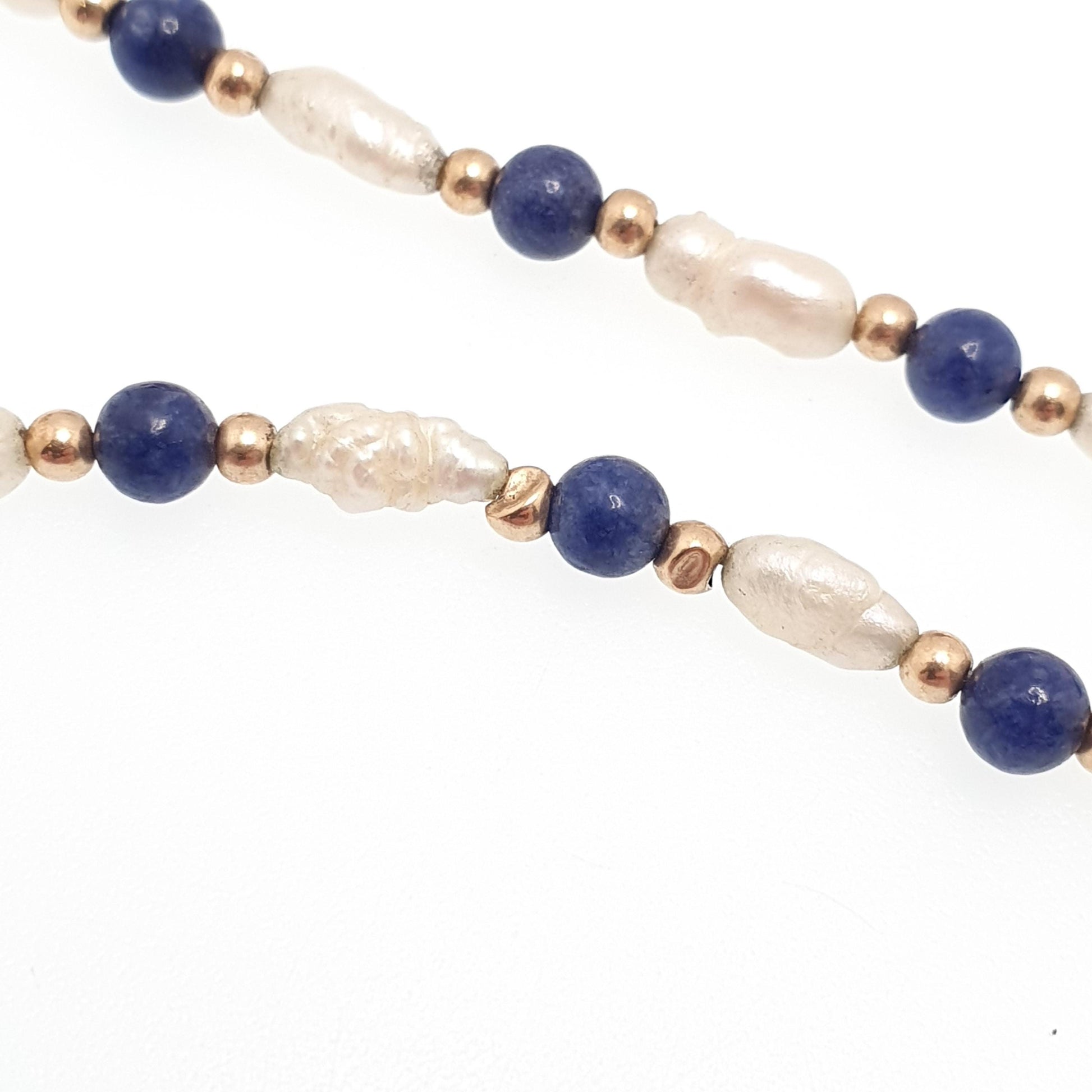 DESCRIPTION: An absolutely stunning vintage solid 9ct gold lapis lazuli bead and freshwater pearl necklace. The clasp and the gold beads are made from solid 9ct gold. The necklace is stamped "9ct". It measures approx. 40cm or 15.7" in length when unfastened and the total weight is approx. 6.21g. Some of the gold beads are a dented and misshapen, see pictures/video.