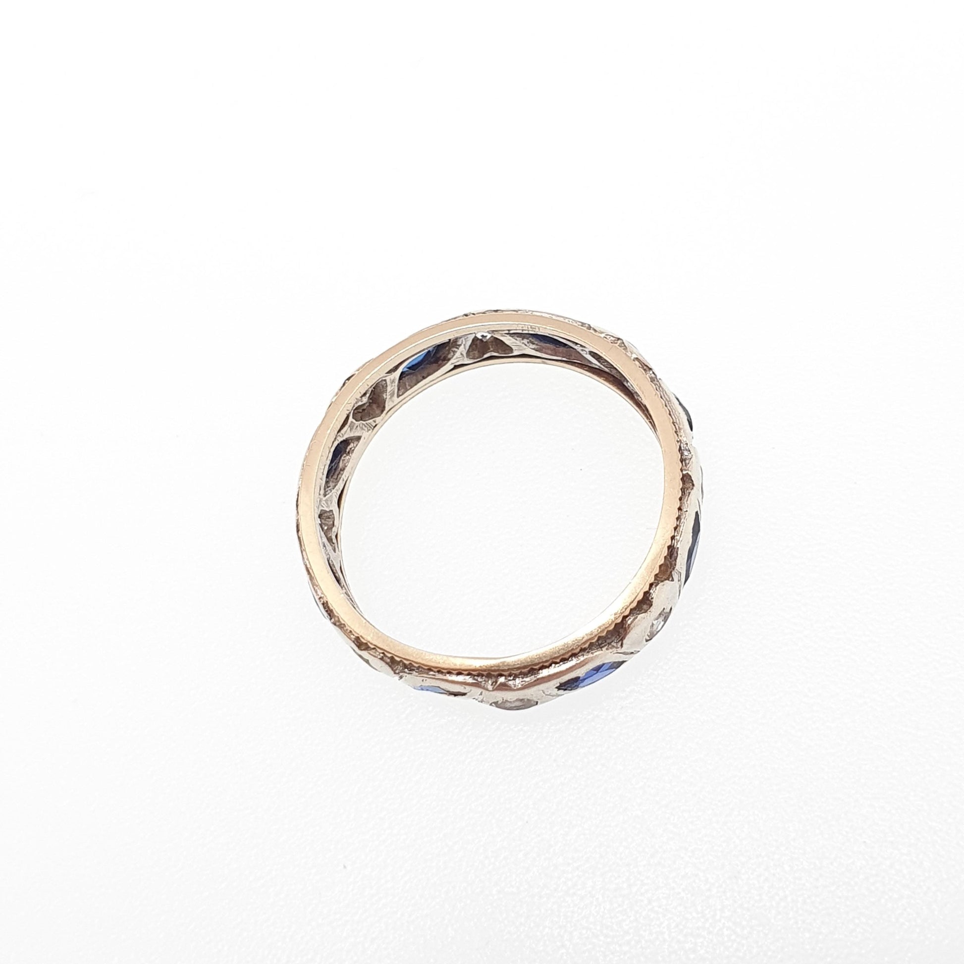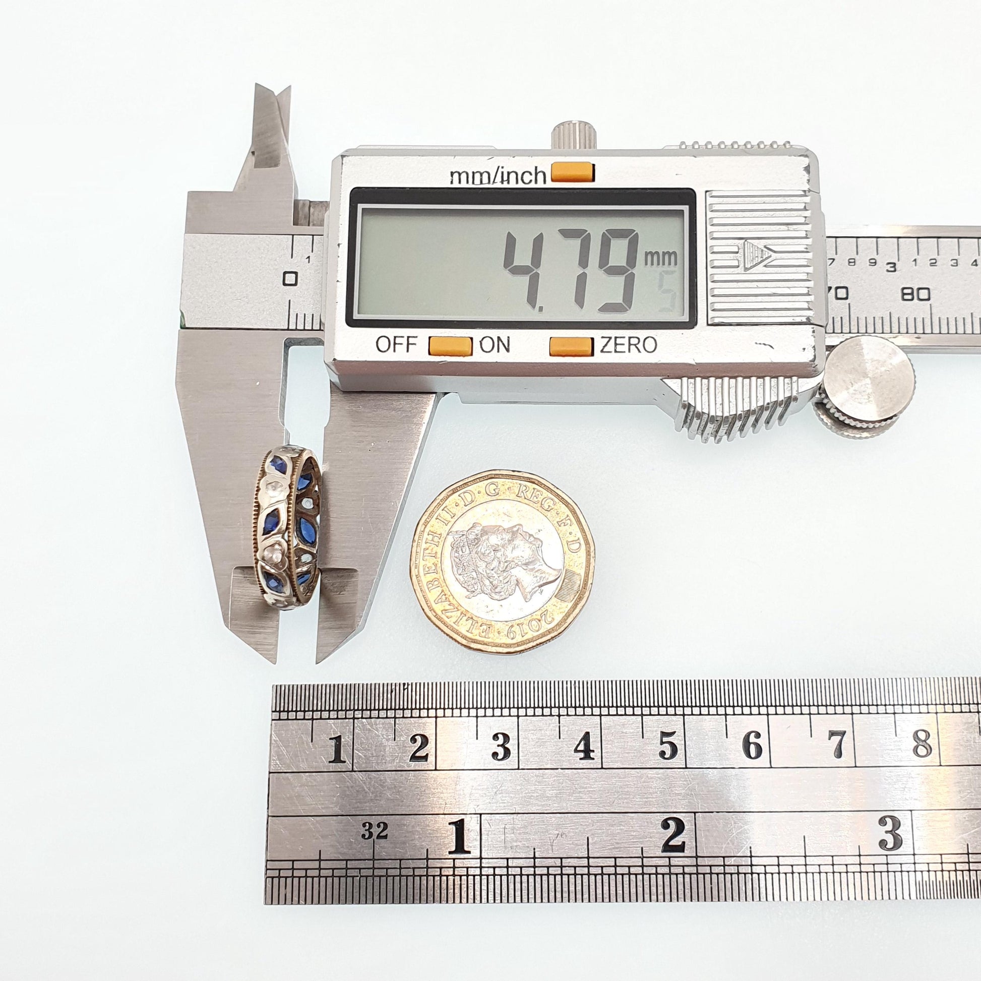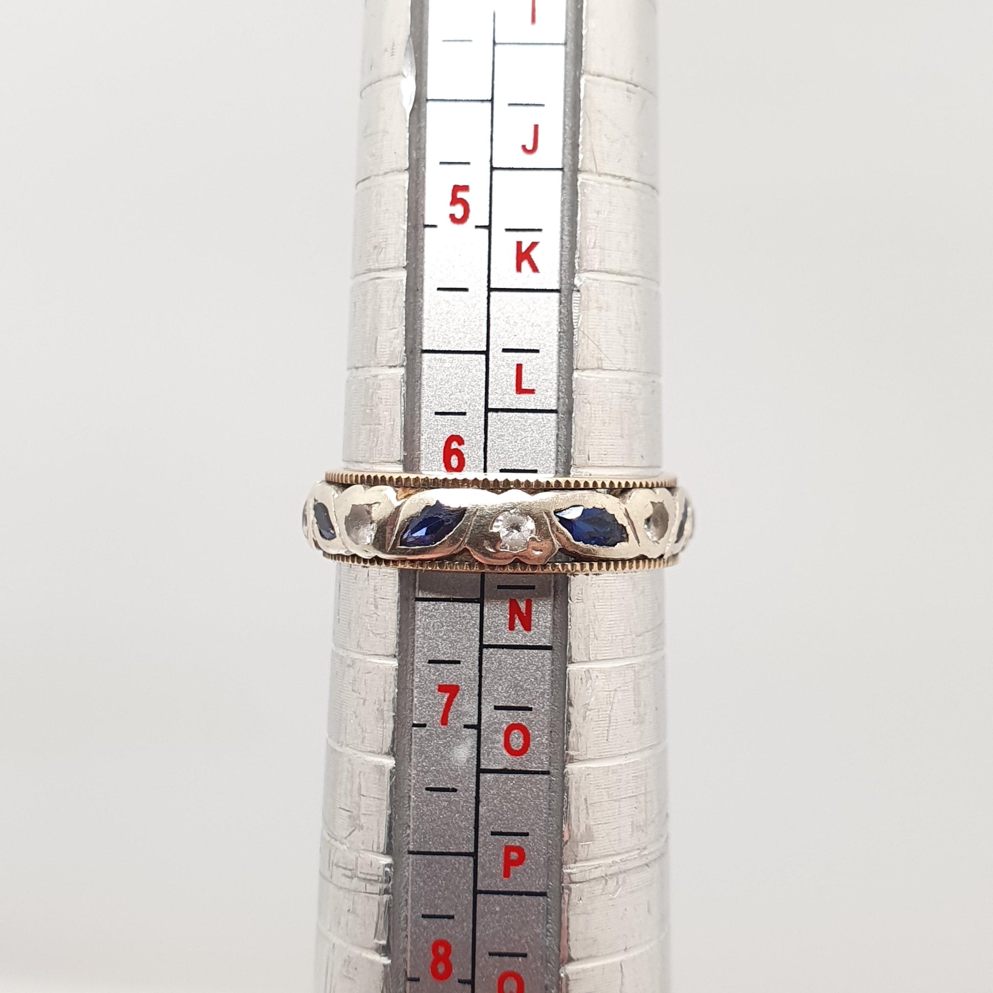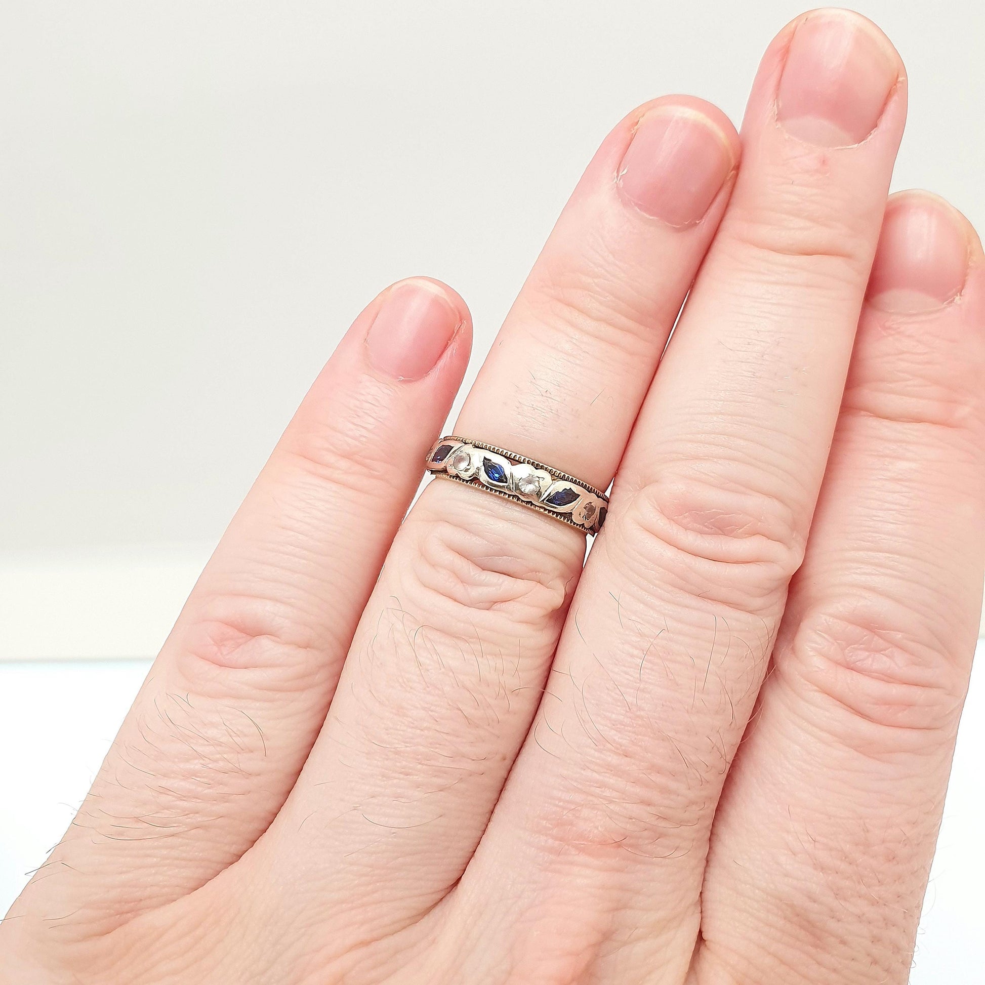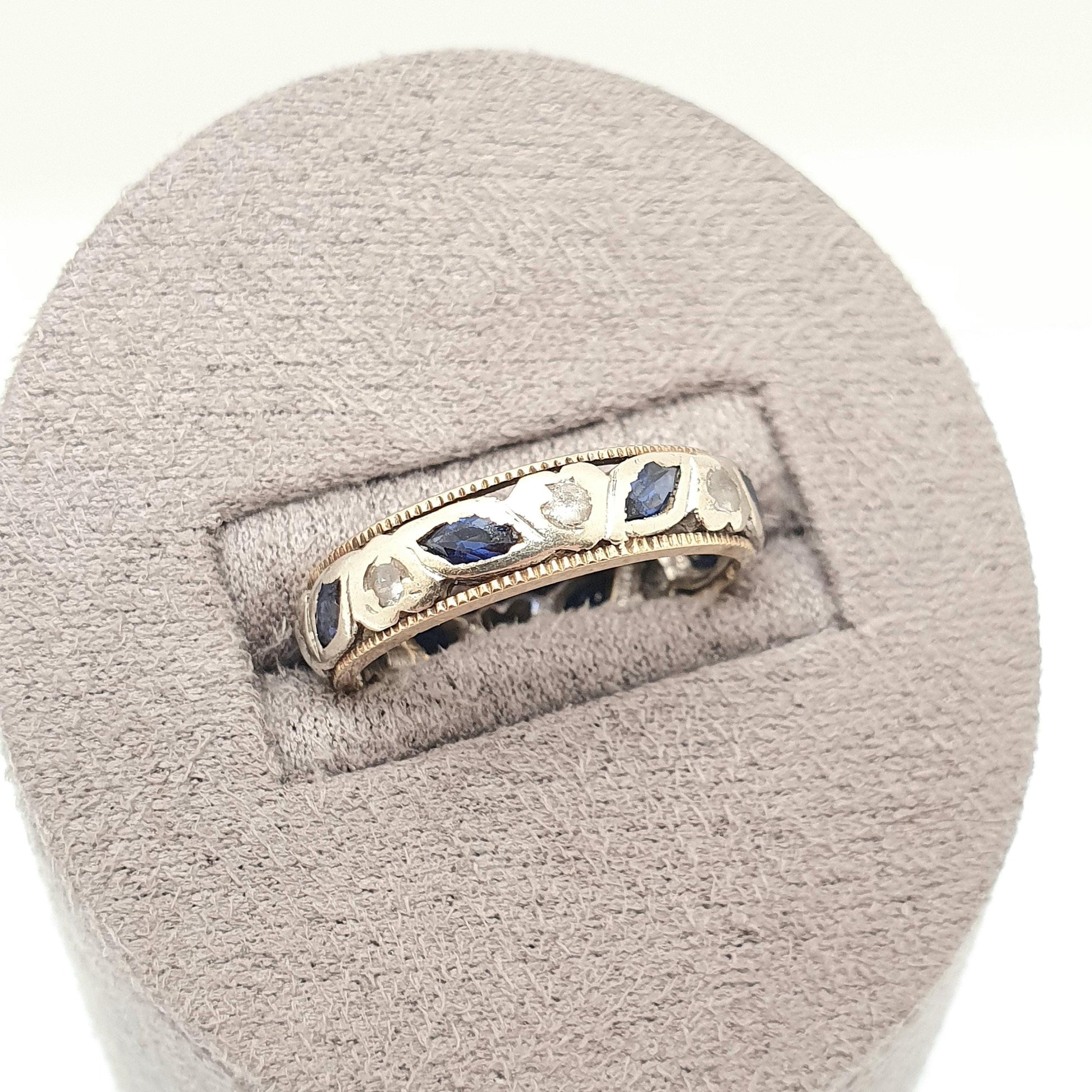 DESCRIPTION: A beautiful vintage solid 9ct 375 gold full eternity ring, adorned with blue sapphires and white spinels. The sapphires are marquise cut which is very rare for a ring of this style. All of metal on this ring is 9ct 375 gold, not gold and silver like some eternity rings. The ring is also hallmarked for 9ct gold, dating to 1990. It sizes at approx. UK M or US 6.25 and weighs approx. 2.53g. PLEASE NOTE: Some of the white spinel gemstones have rubbed and matted on the face, see pictures/video.