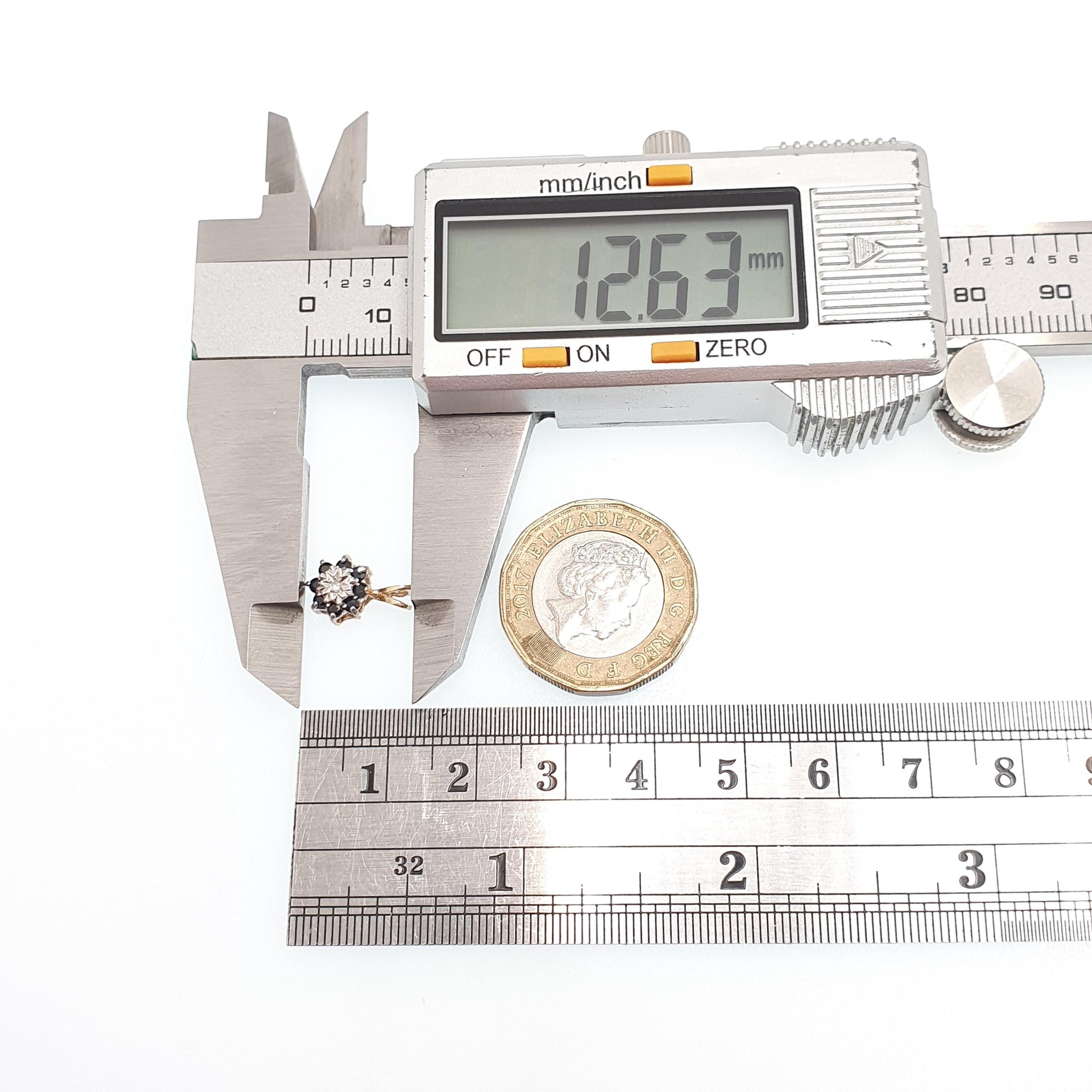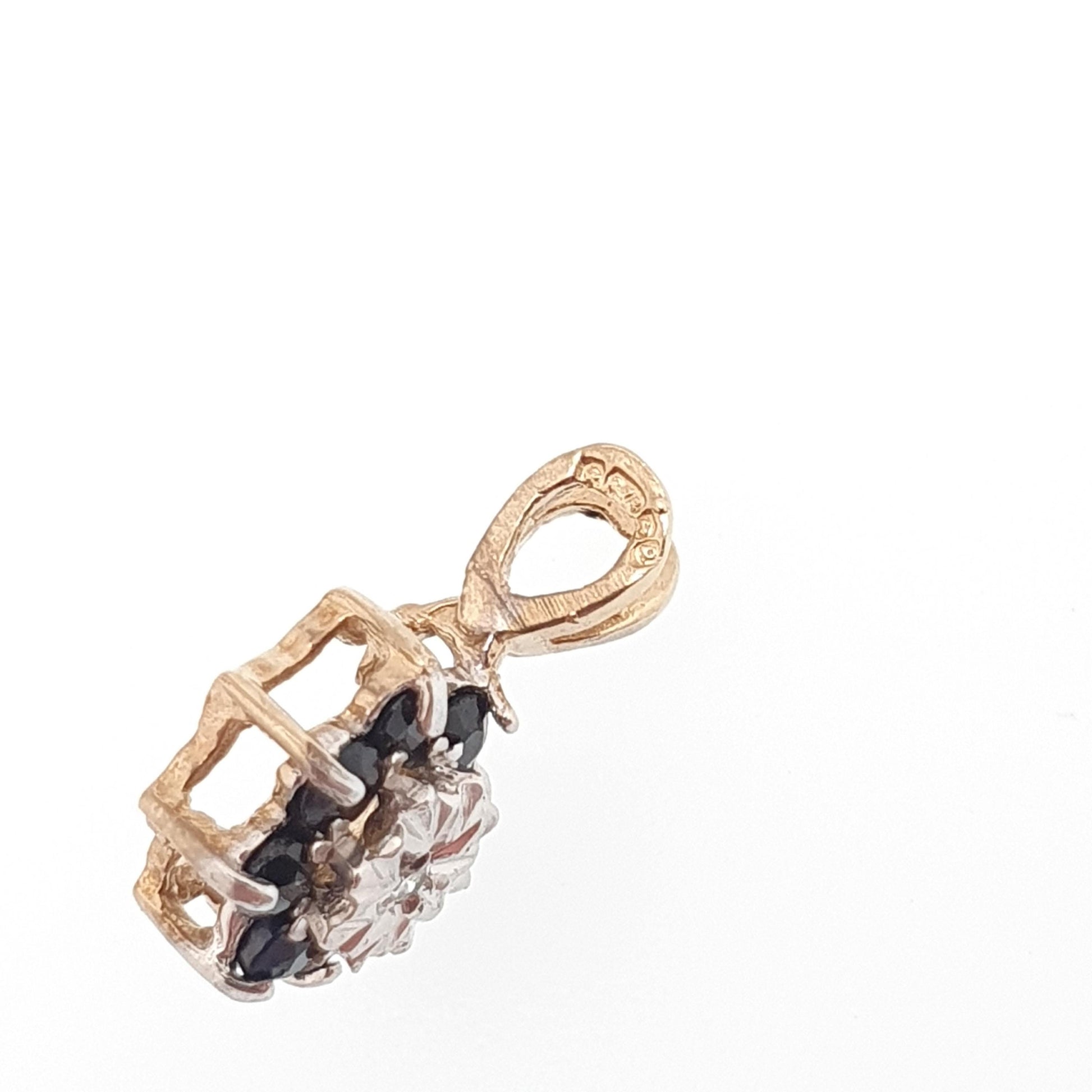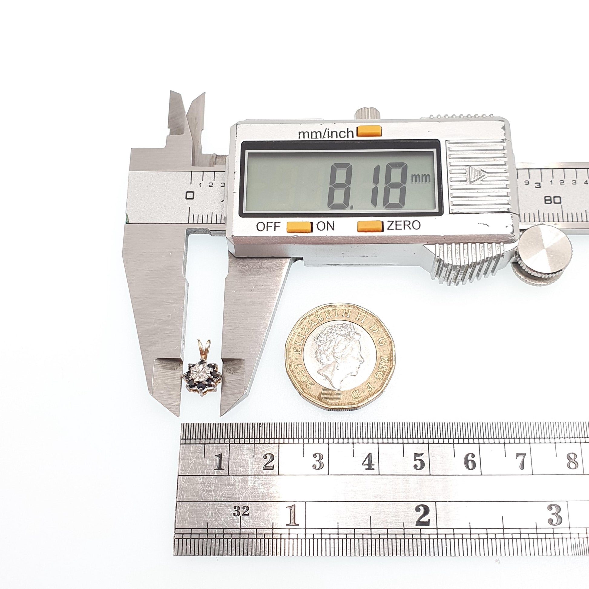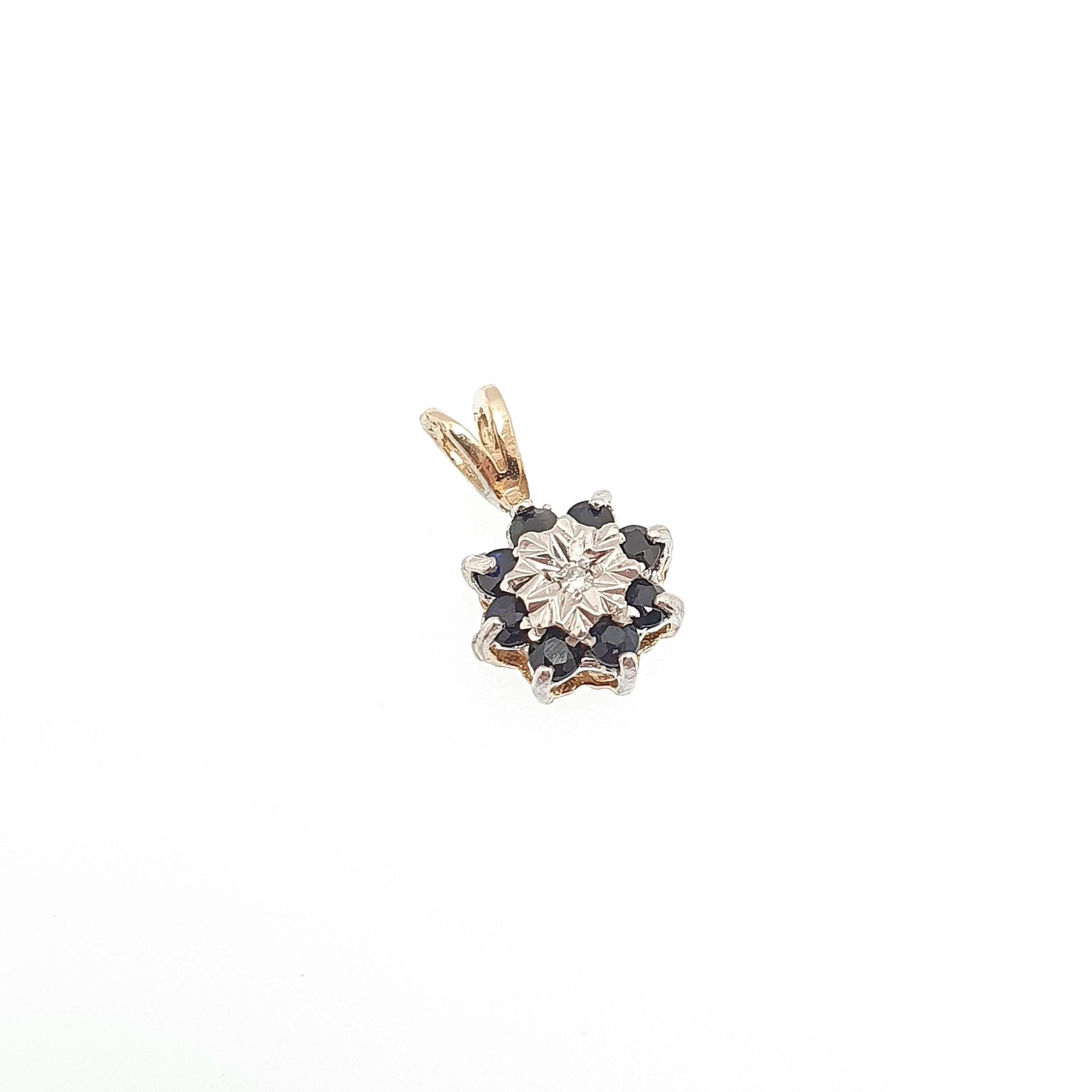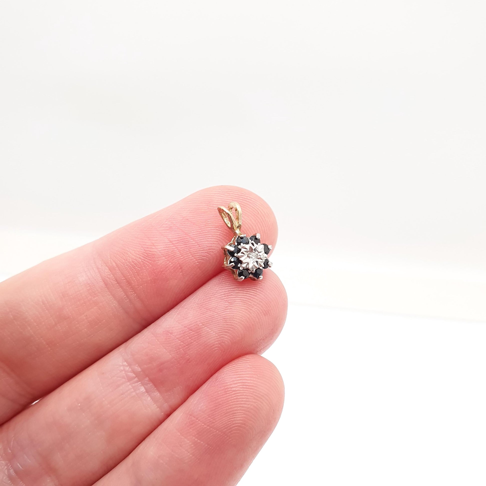 DESCRIPTION: A petite and elegant vintage solid 9ct gold cluster pendant, adorned with sapphires and a central diamond (100% tested). It weighs approx. 0.61g and the size dimensions are in the later photos. The item is hallmarked for 9ct gold, dating to 1990.