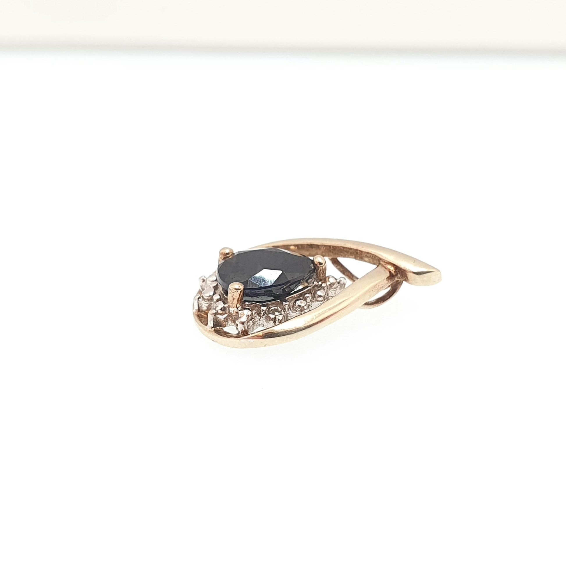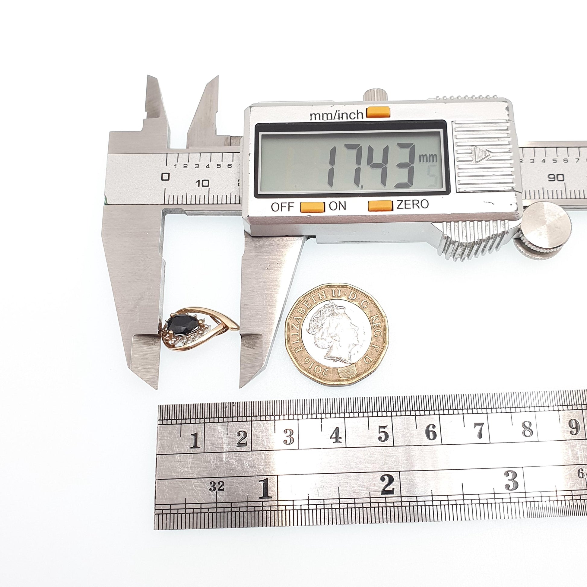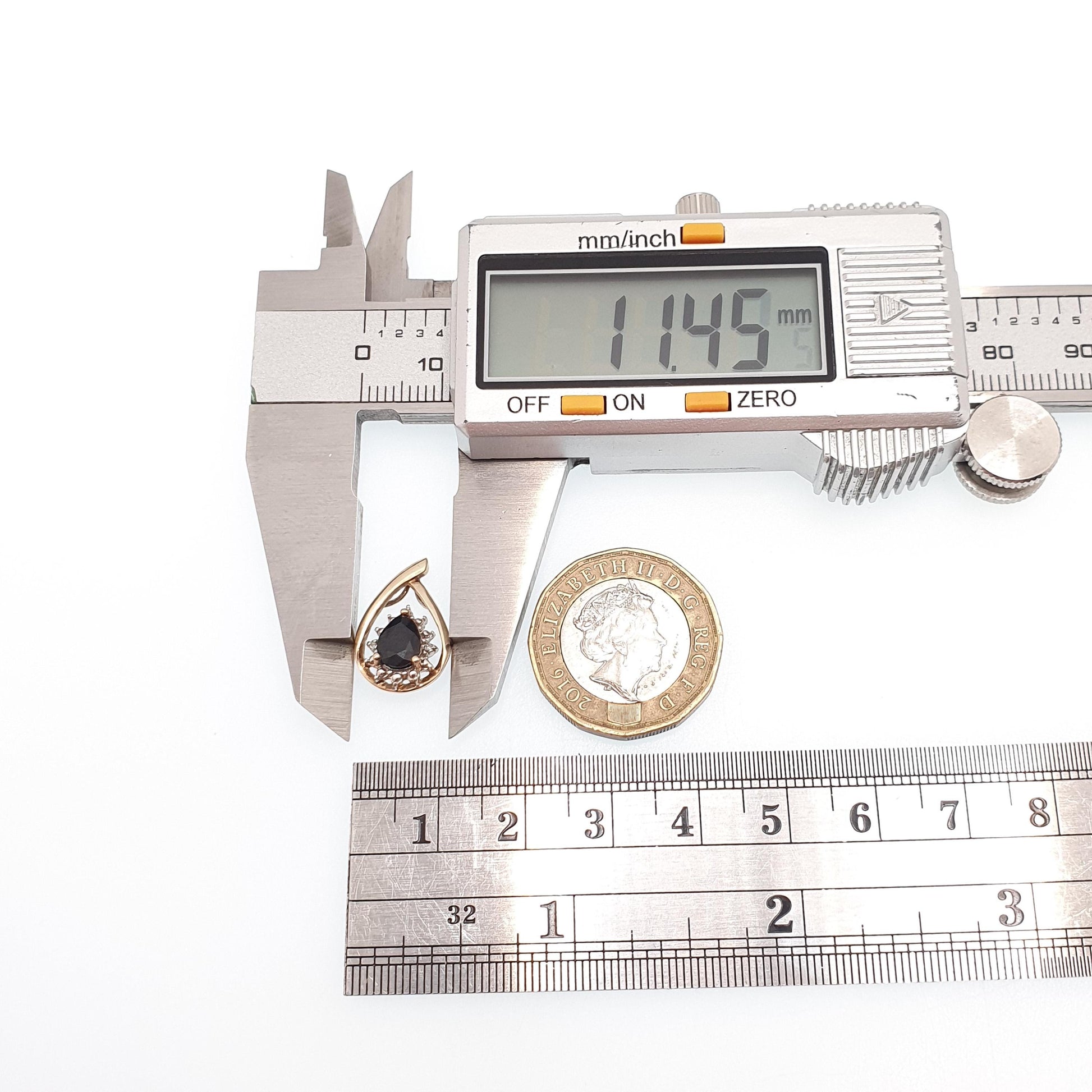DESCRIPTION: An elegant vintage solid 9ct gold pendant, adorned with a pear cut sapphire and 2 diamonds (100% tested) in an illusion set border. It weighs approx. 1.12g and the size dimensions are in the later photos. The item is stamped "375" for 9ct gold.
