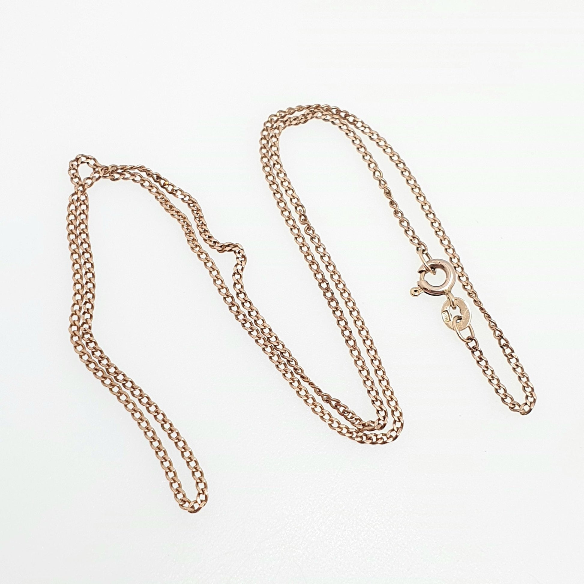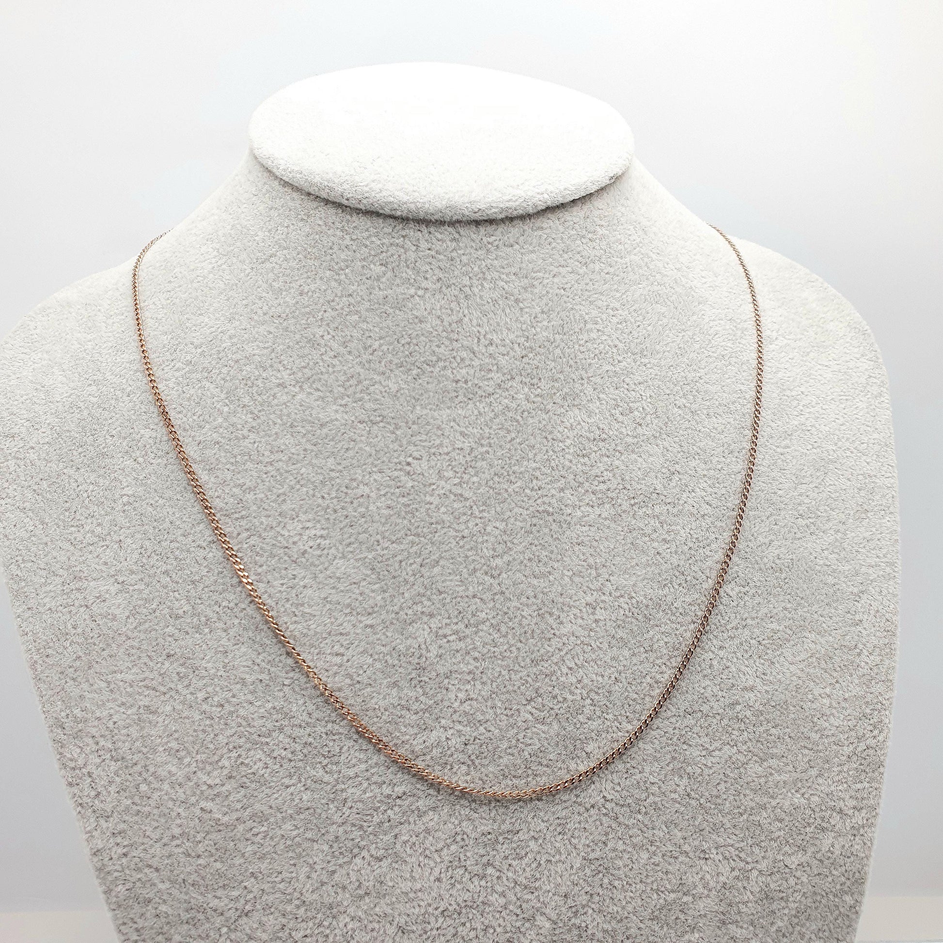 DESCRIPTION: A good quality vintage solid 9ct 375 rose gold chain necklace, with curb links. The chain is hallmarked for 9ct gold, dating to 1977. It measures approx. 48cm or 18.9" in unfastened length, is approx. 1.6mm thick and weighs approx. 2.77g. The rose gold is light in colour, in-between a yellow gold and red gold, similar to antique rose gold (not "red" modern rose gold).