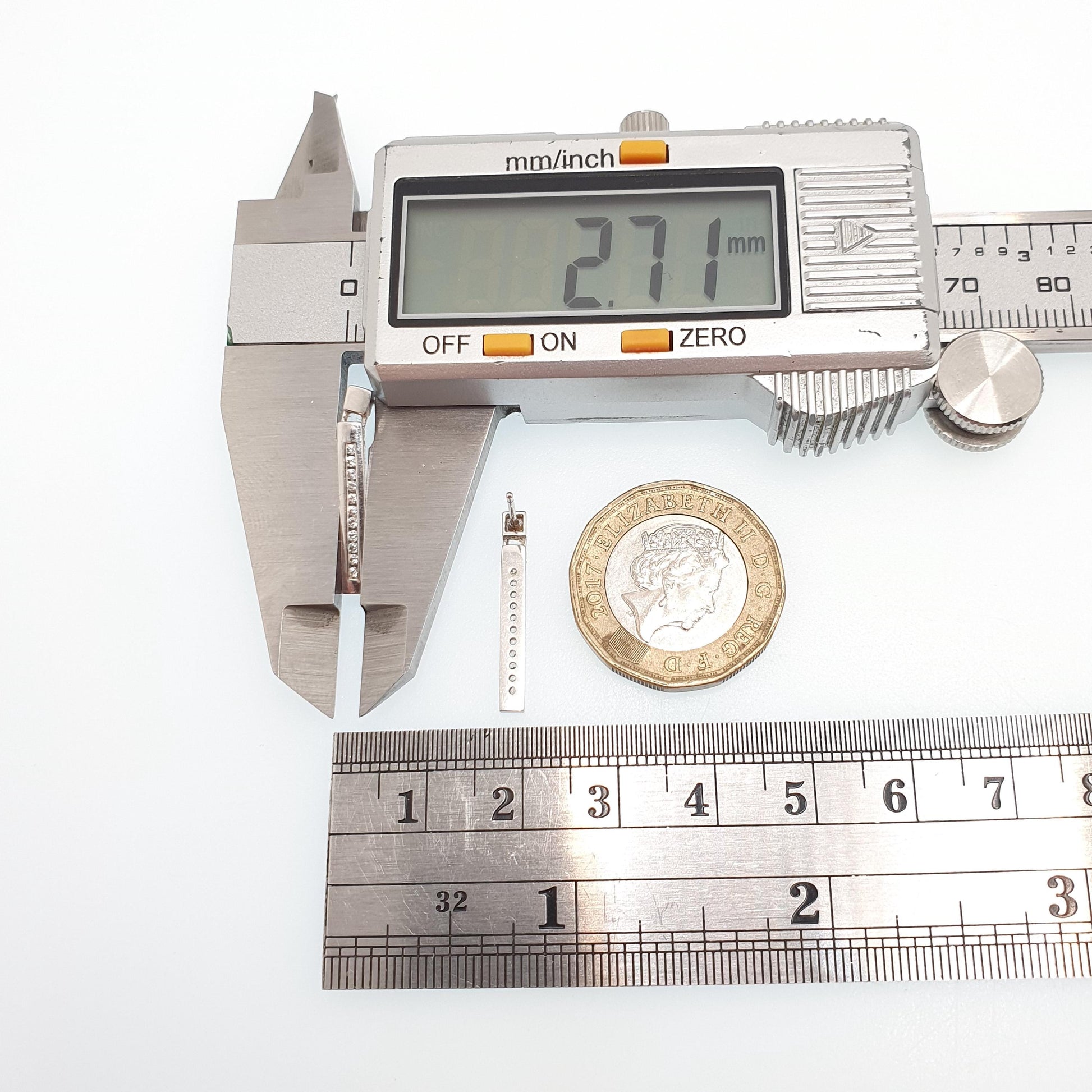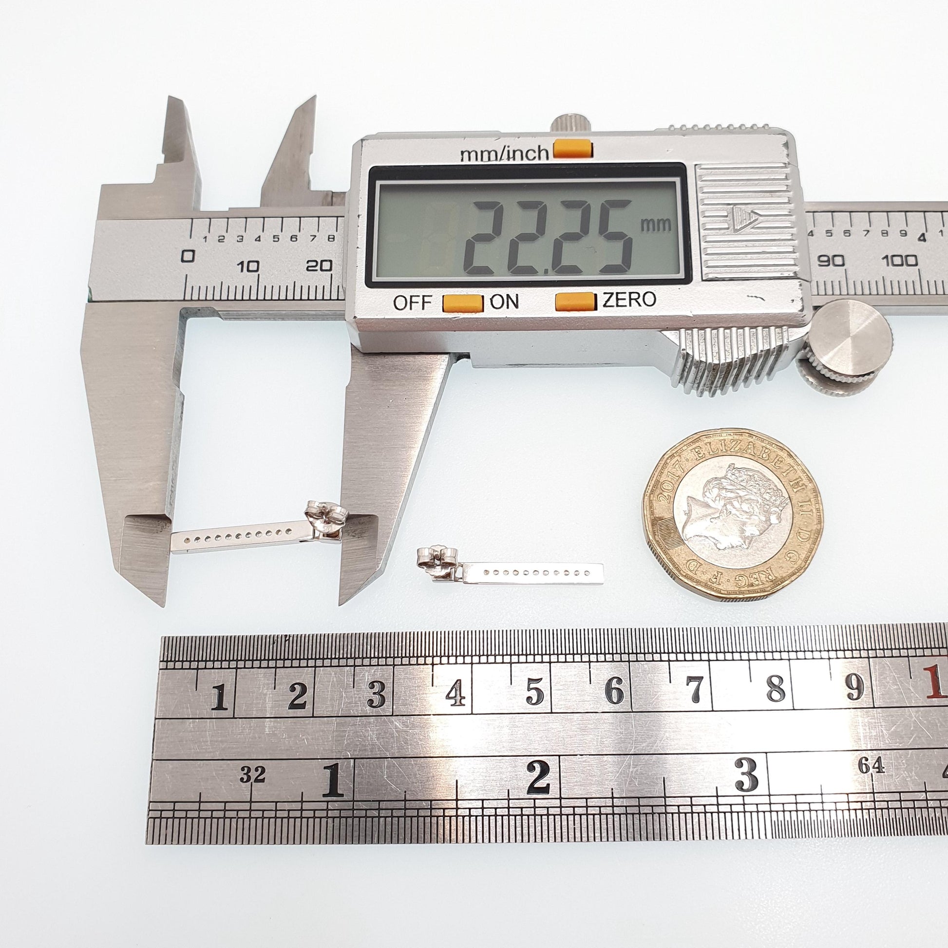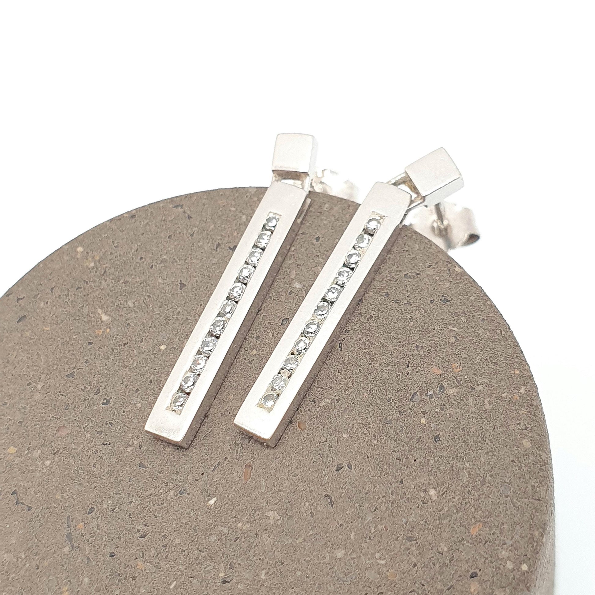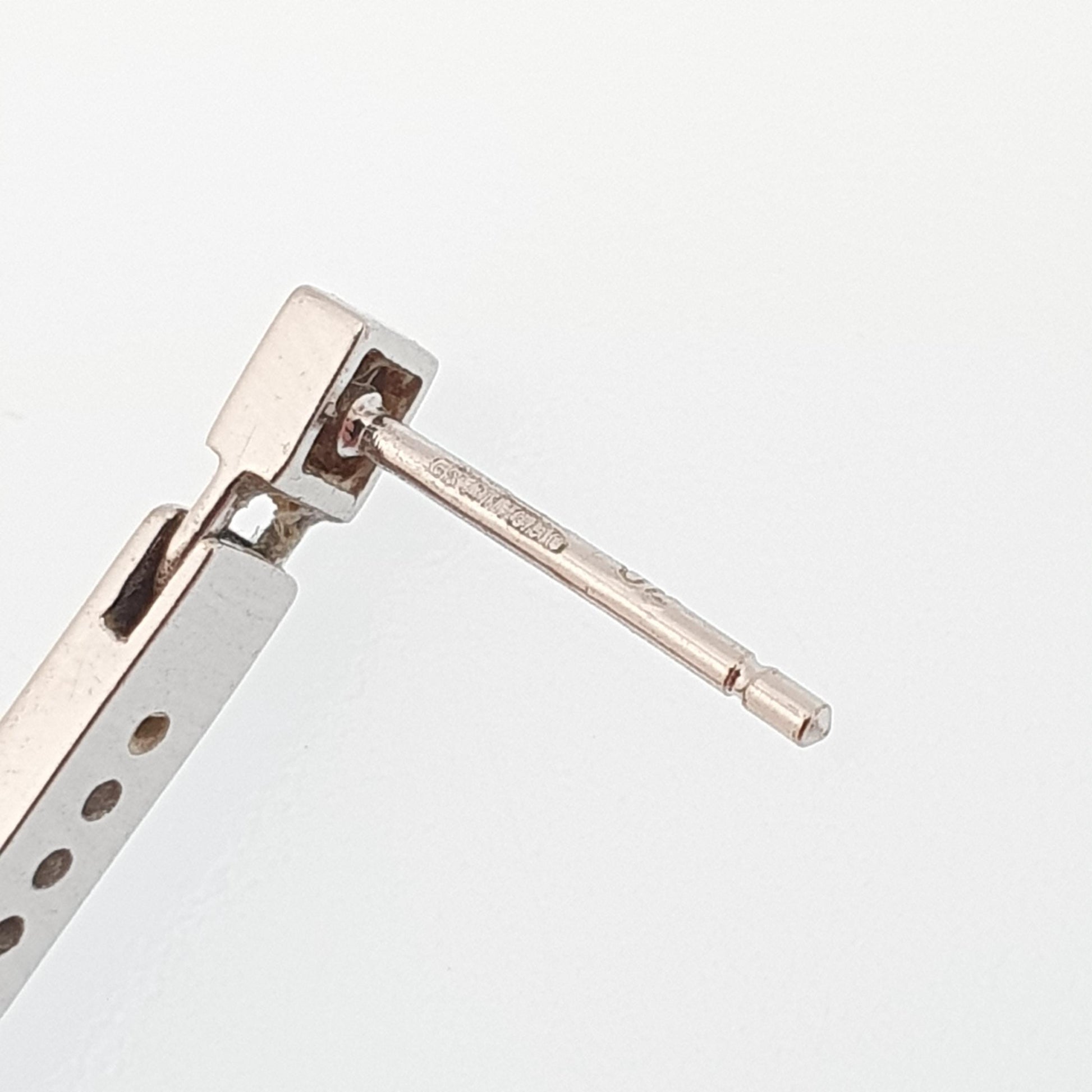 DESCRIPTION: A stunning pair of solid 9ct white gold rectangular bar earrings, adorned with numerous CZ gemstones. The earrings are hallmarked for 9ct gold. The total weight is approx. 1.79g and the size dimensions are in the later photos. One of the backs is a 9ct white gold replacement.
