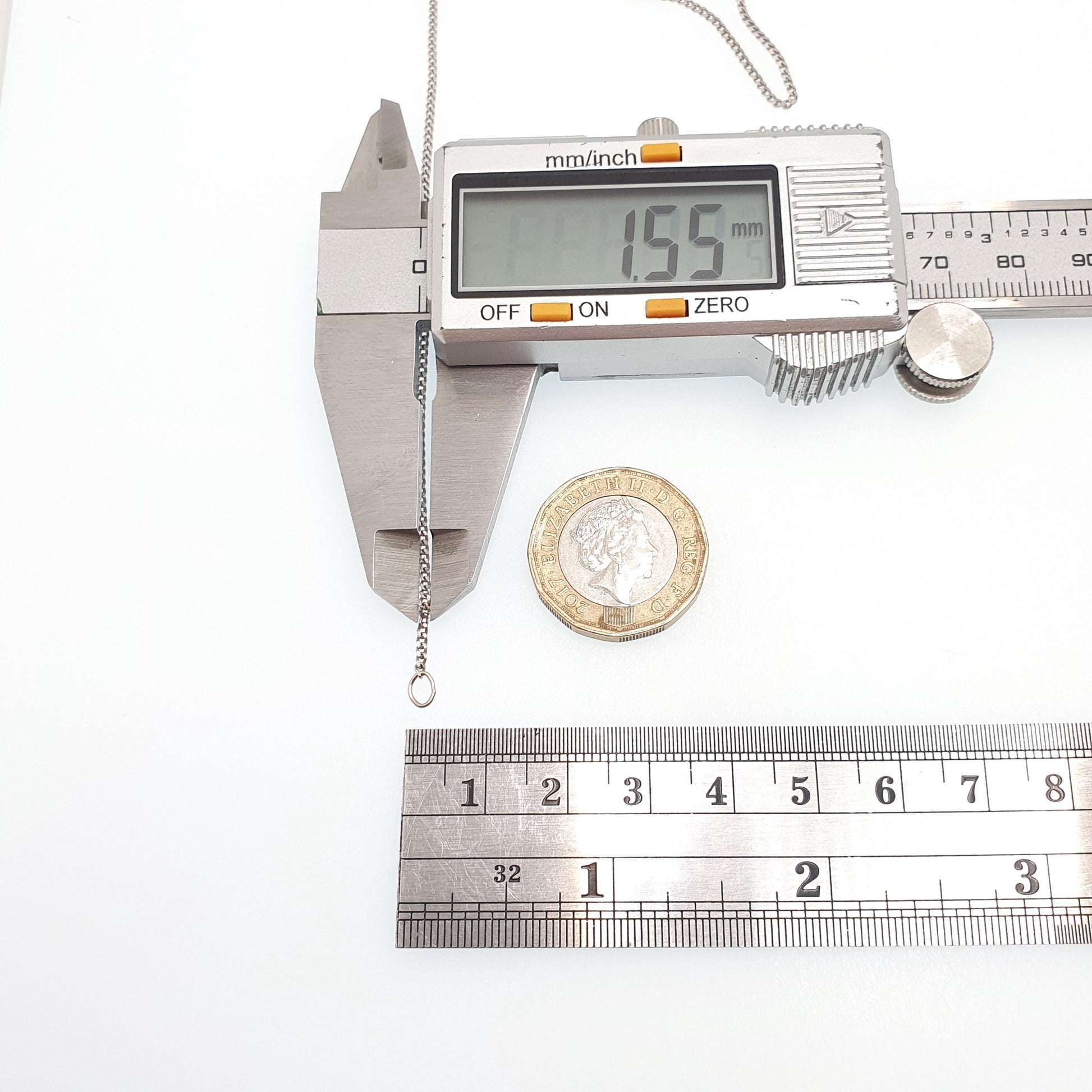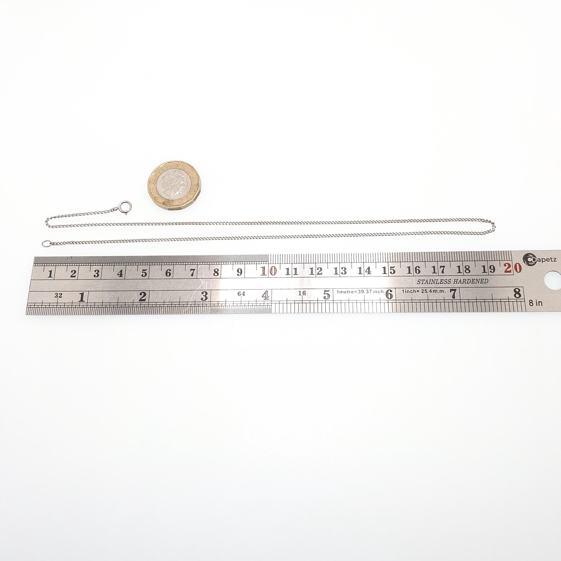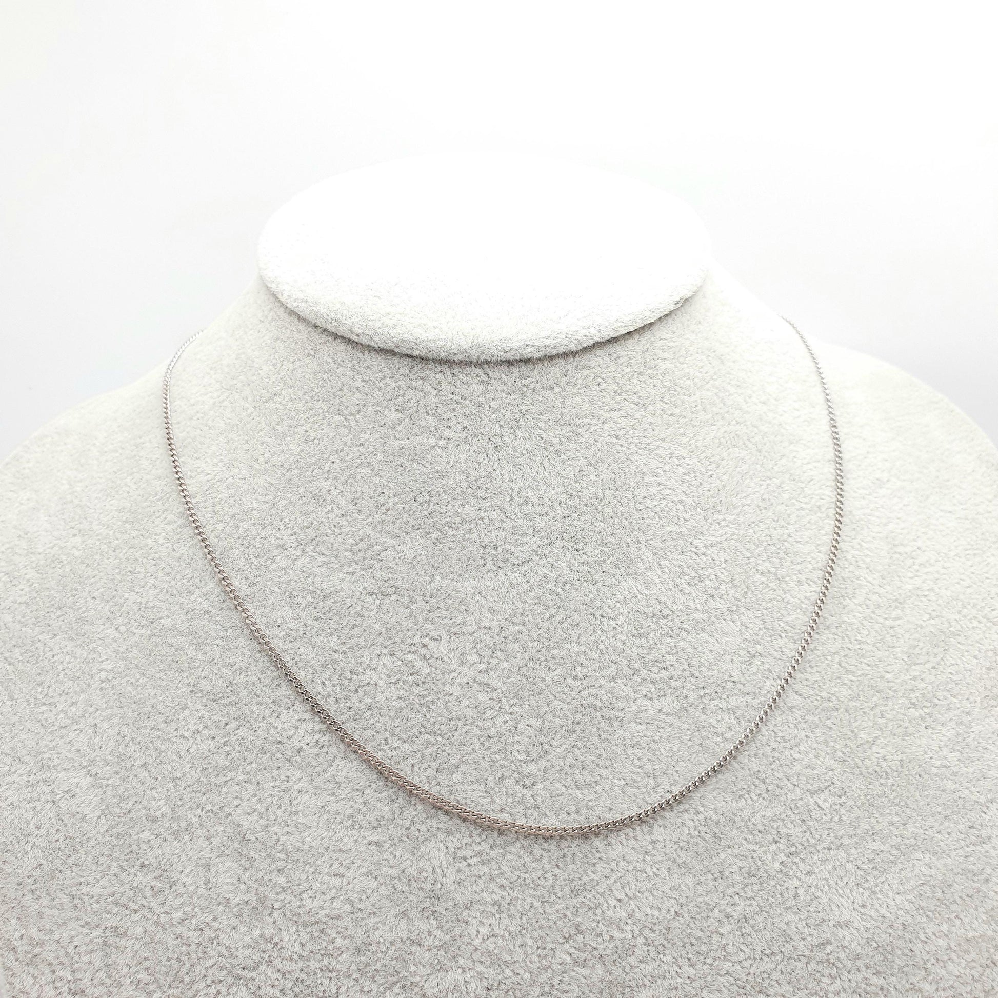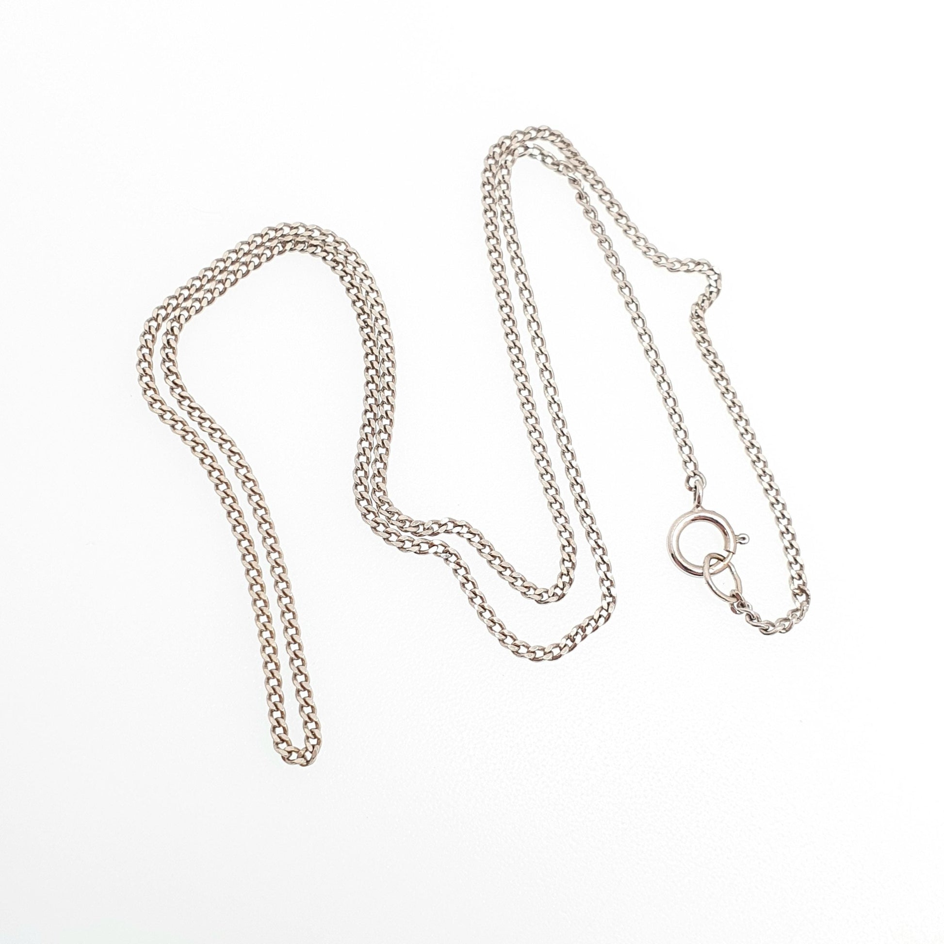 DESCRIPTION: A vintage solid 9ct 375 white gold chain necklace, with curb links. The chain is stamped "375" and also tests for solid 9ct white gold. It measures approx. 42cm or 16.5" in unfastened length, is approx. 1.6mm thick and weighs approx. 2.93g.
