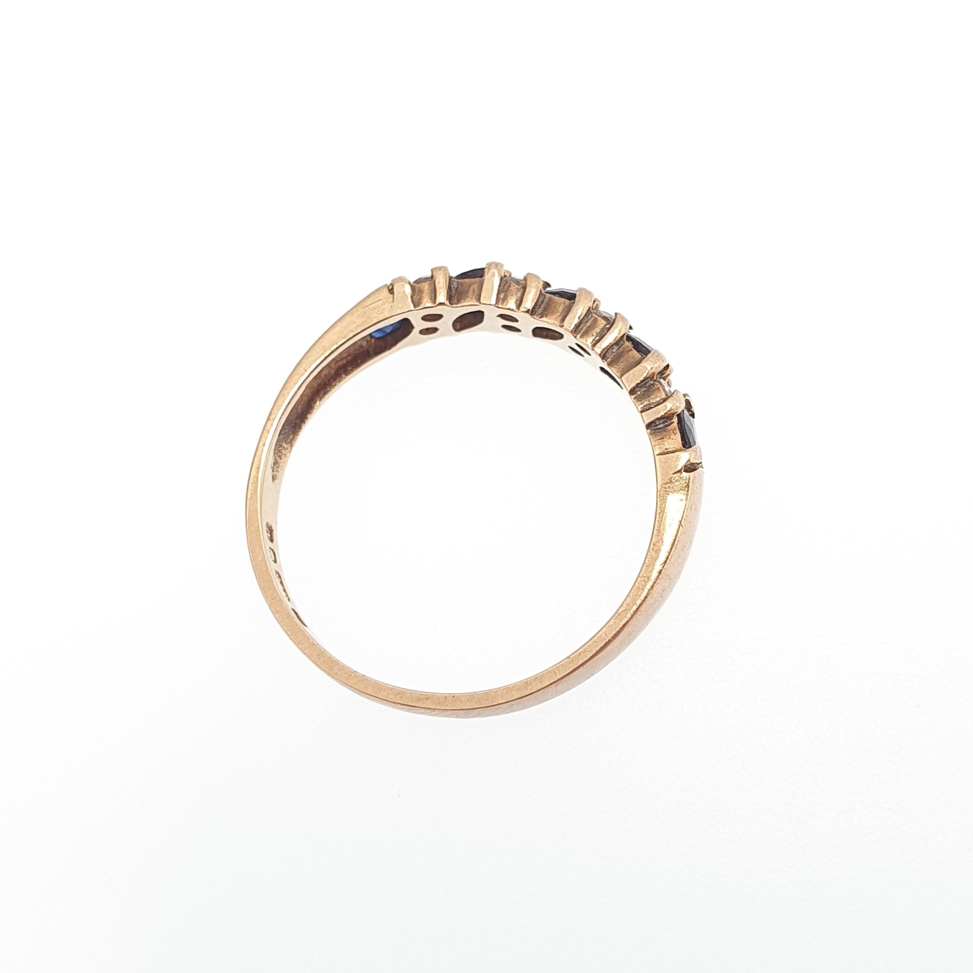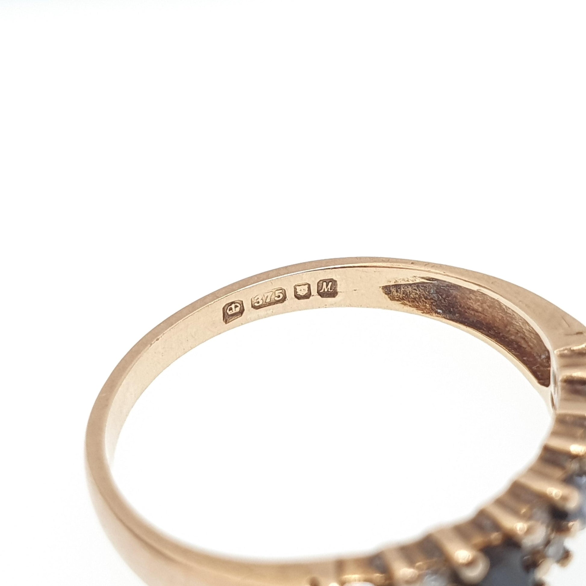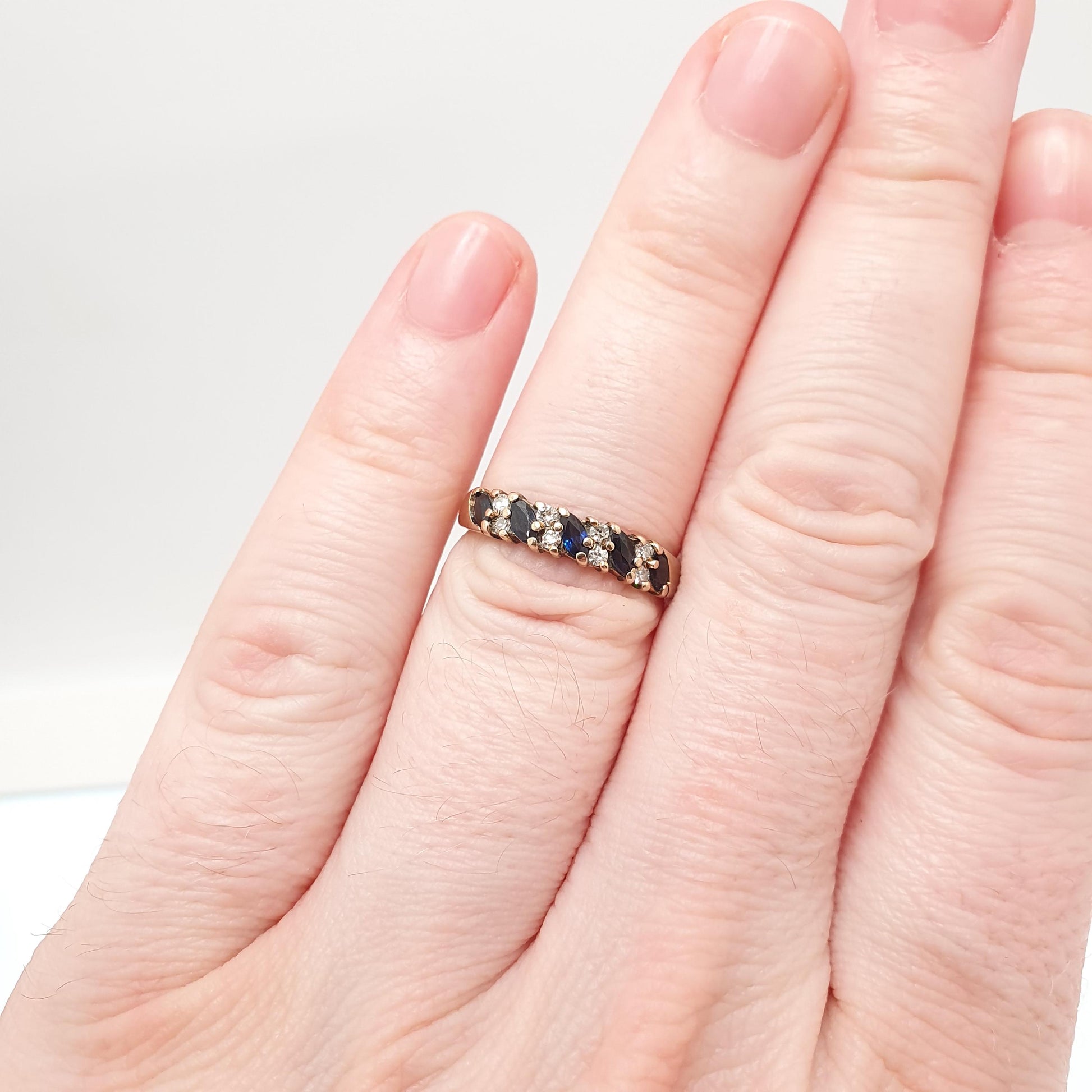 DESCRIPTION: A vintage and elegant solid 9ct 375 gold ring, adorned with numerous sapphires and diamonds (100% tested). It sizes at approx. UK O or US 7 and weighs approx. 1.84g. The ring is hallmarked with British hallmarks, dating to 1986.