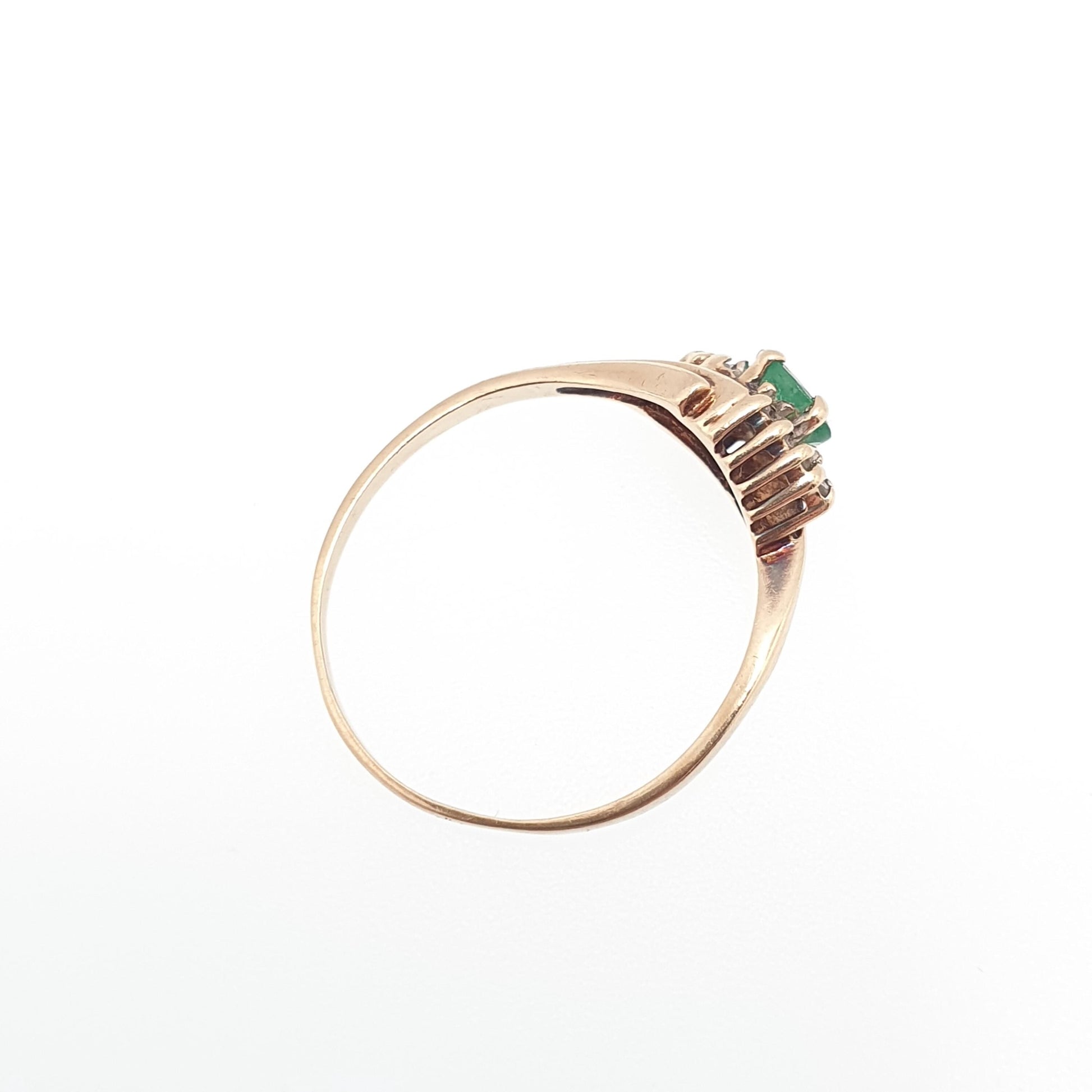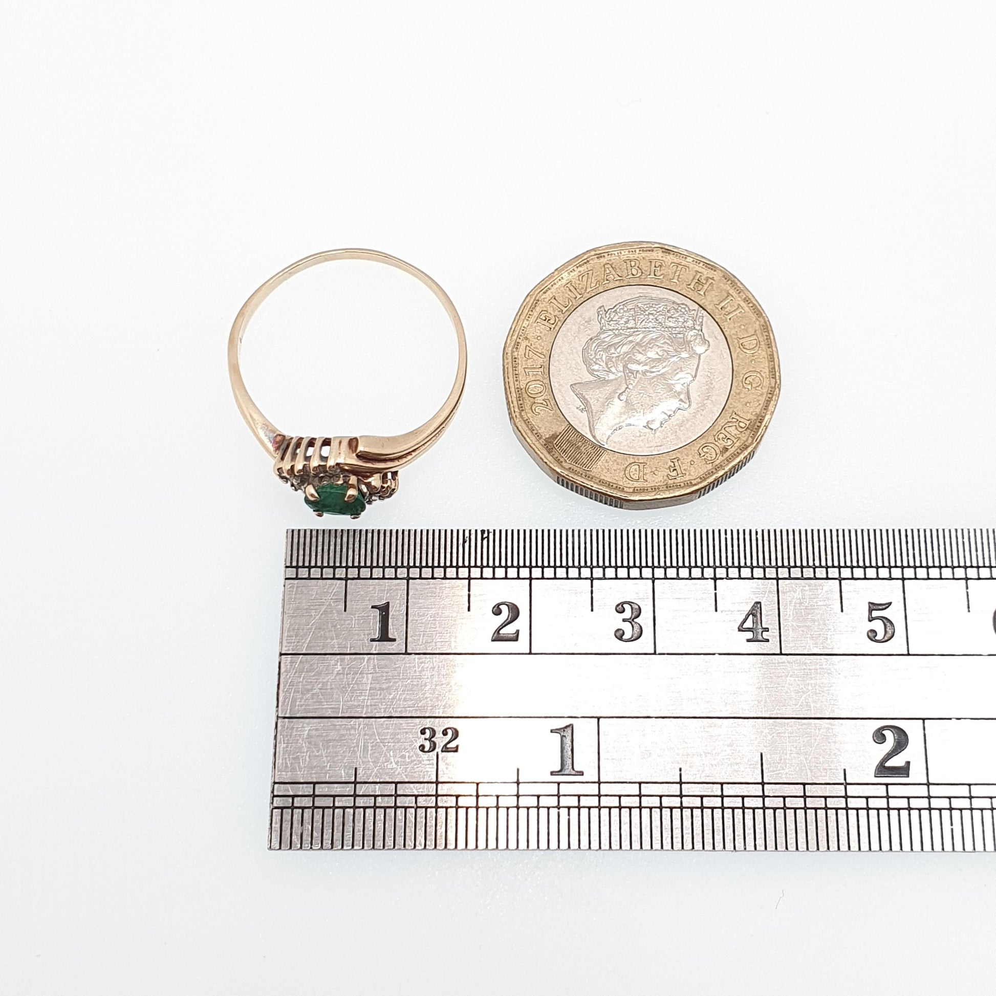 DESCRIPTION: A beautiful vintage solid 9ct gold ring, adorned with a genuine emerald and diamonds (100% tested). It sizes approx. at UK Q.5 or US 8.5 and weighs approx. 1.60g. The item has remnants of 9ct gold British hallmarks, it also tests for 9ct gold.