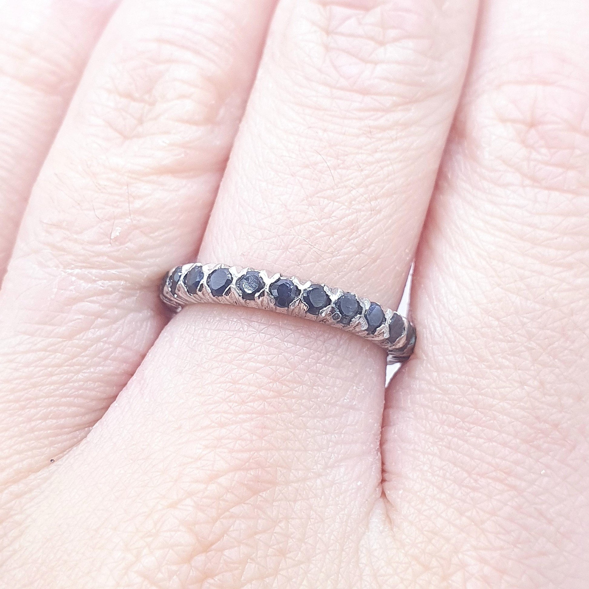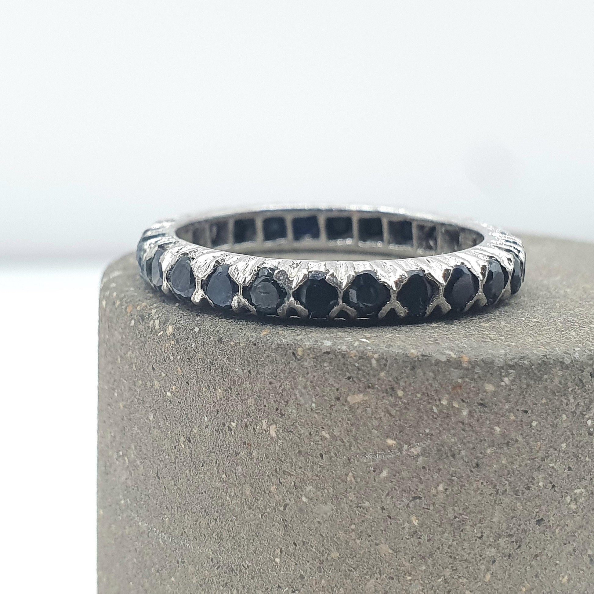 DESCRIPTION: A vintage hand set eternity band ring, adorned with genuine black sapphires (100% tested) made from silver tone base metal. It measures at approx. UK O.5 US 7.25 and weighs approx. 2.41g.