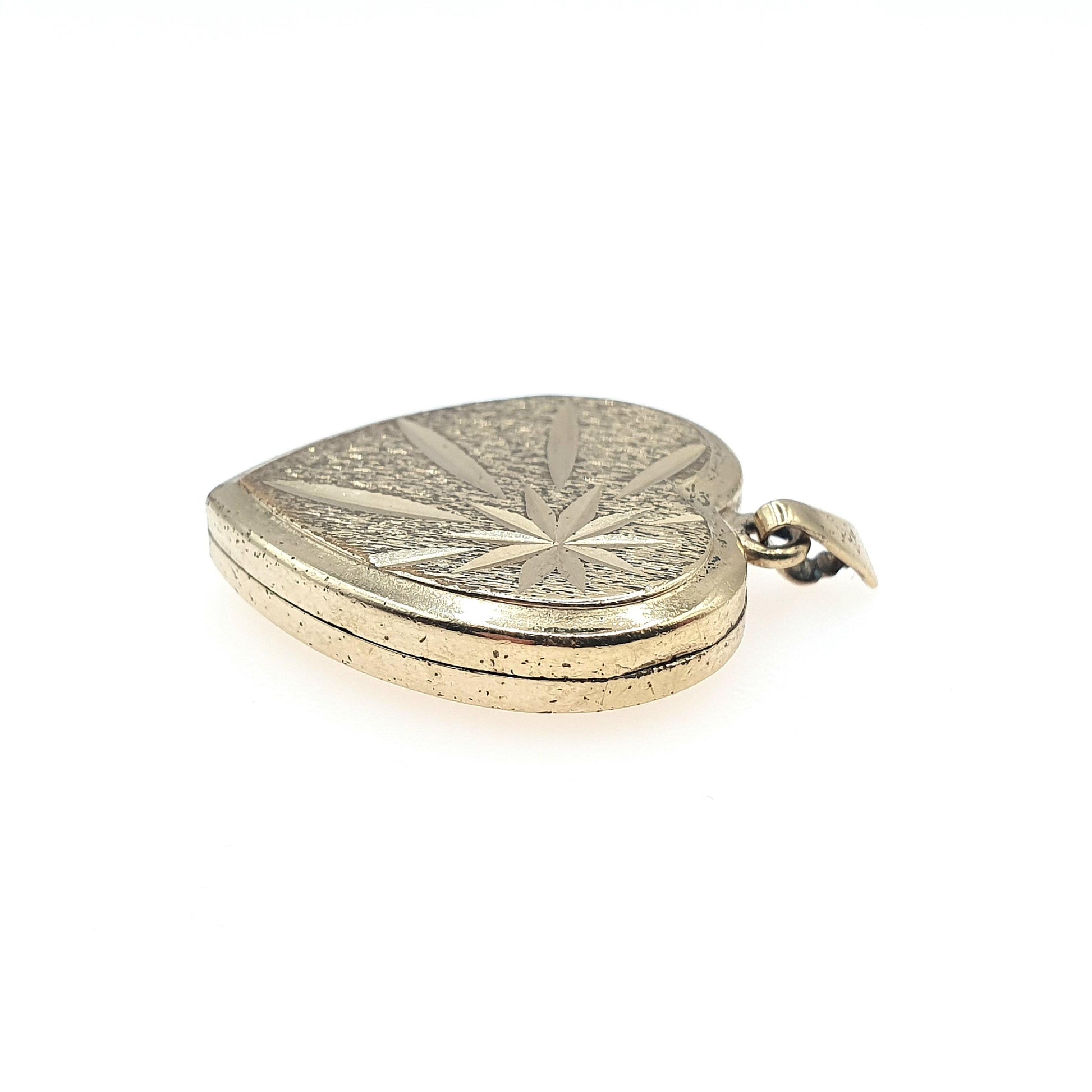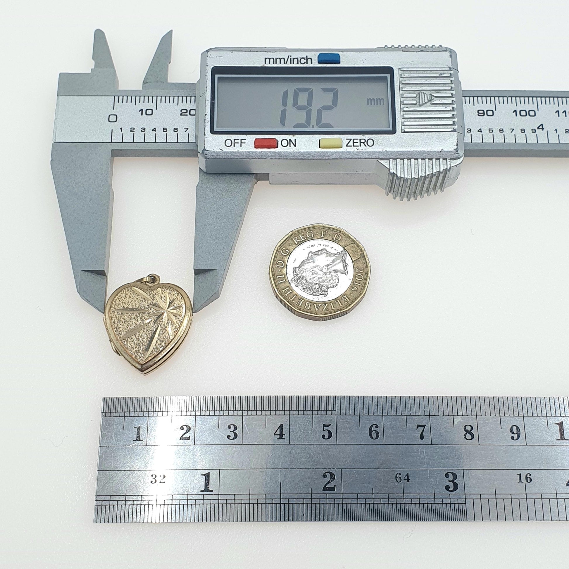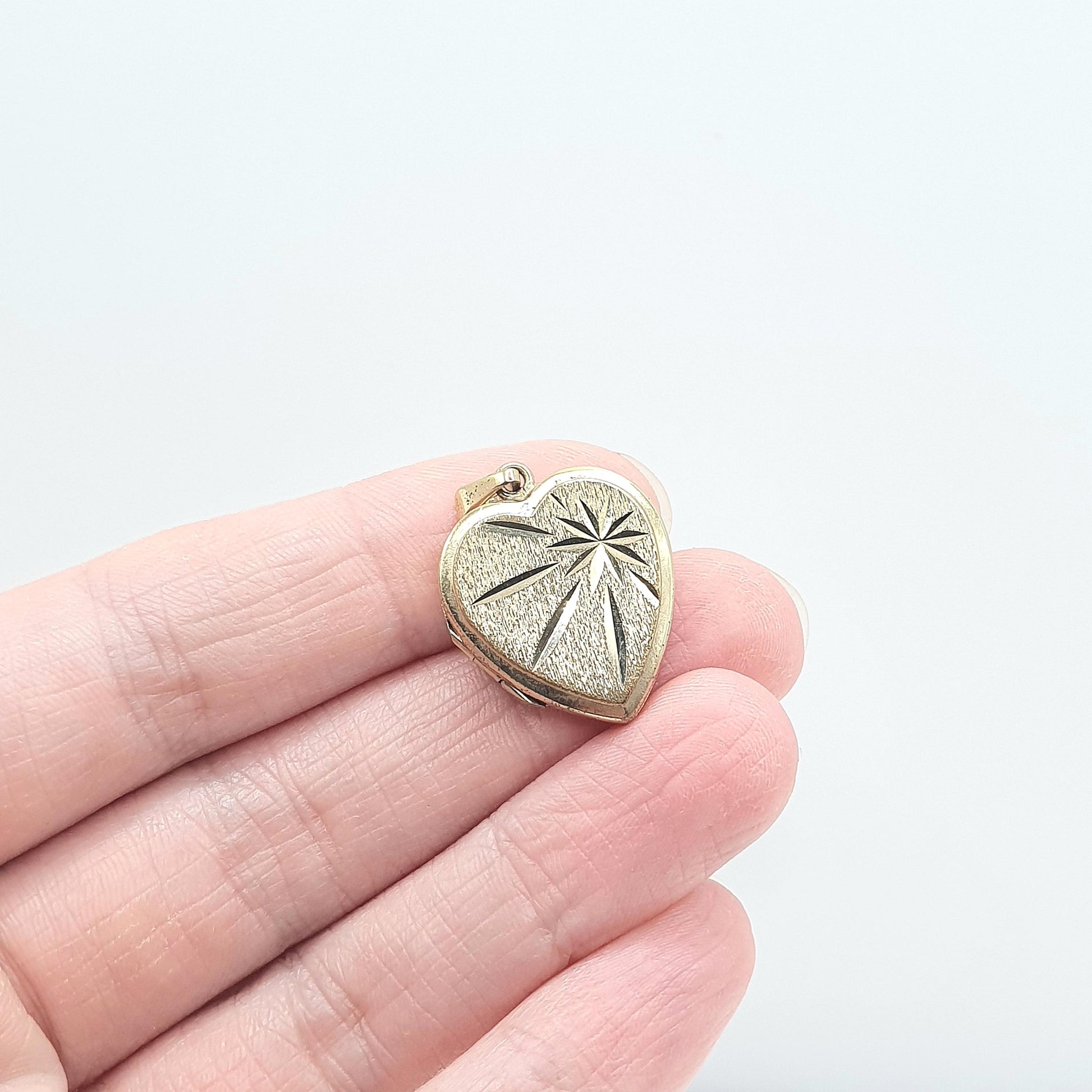 DESCRIPTION: A beautiful vintage rolled gold locket, in a heart shape with engraved details in a starburst design. It opens/closes well and is stamped "ROLLED GOLD". It weighs 3.42g and the size dimensions in the latter photos. PLEASE NOTE: As to be expected with age and use, the rolled gold finish has worn with age and use (see pictures/video), mainly on the rear.