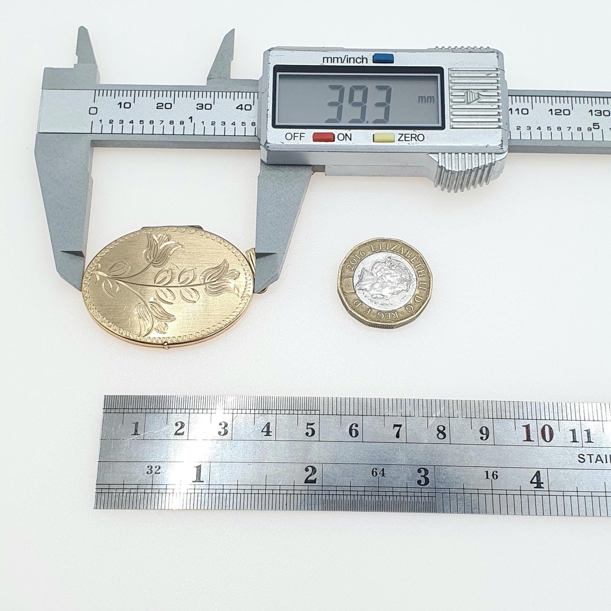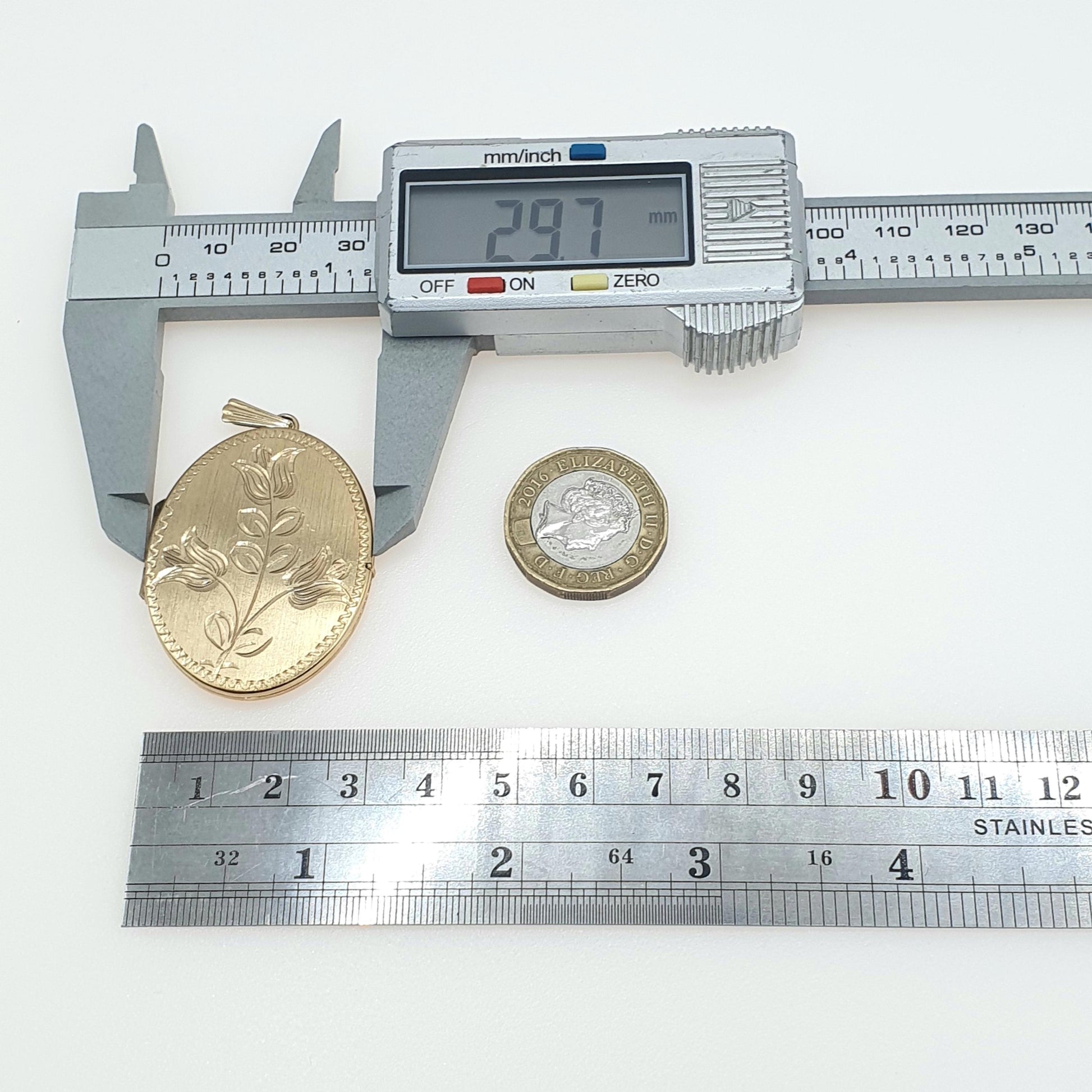 DESCRIPTION: A stunning vintage rolled gold locket, decorated with floral engravings. It weighs approx. 8.15g, opens/closes well and the size dimensions are in the latter photos. As to be expected with the items age, some of the rolled gold finish has worn (see pictures/video).