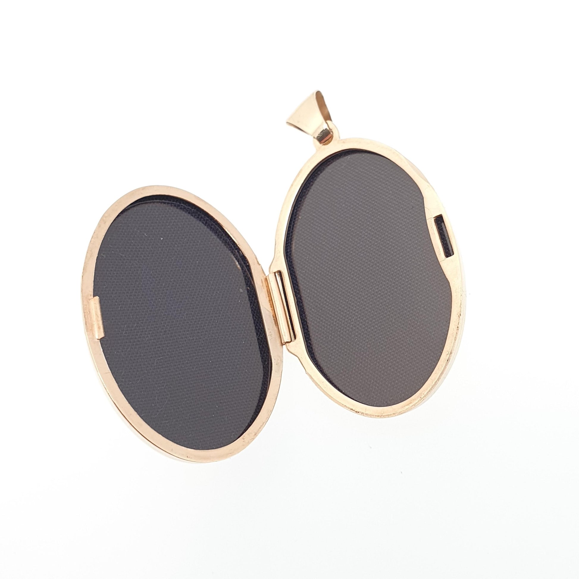 DESCRIPTION: A lovely vintage large solid 9ct 375 gold oval locket, with an engrave face. The locket is made completely of solid 9ct 375 gold, it's not a back and front gold locket, all the metal is solid gold including the hinge and rims. It's hallmarked for 9ct gold, weighs approx. 4.64g and the size dimensions are in the later photos. It opens/closes well and has the original see-thru picture covers for both sides.