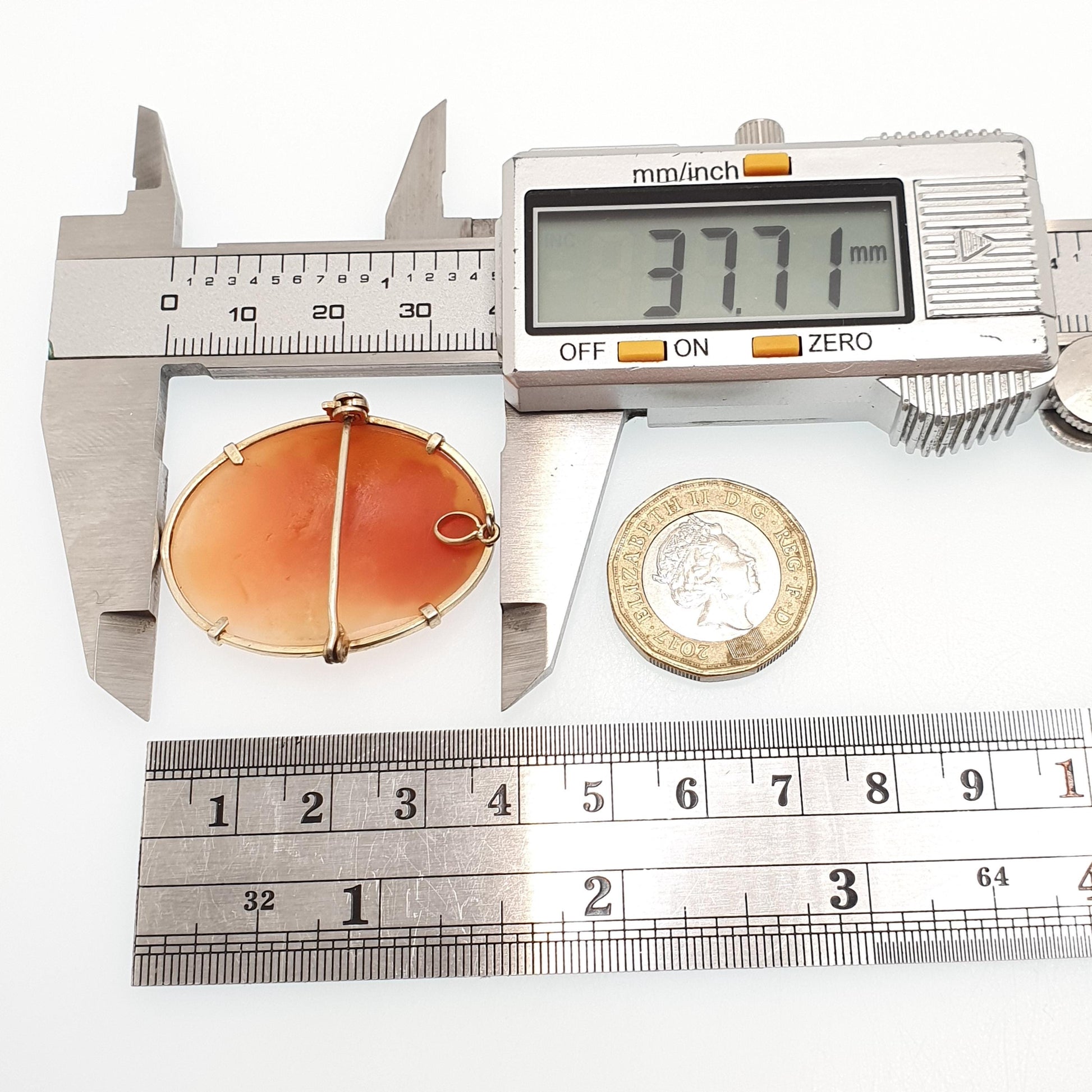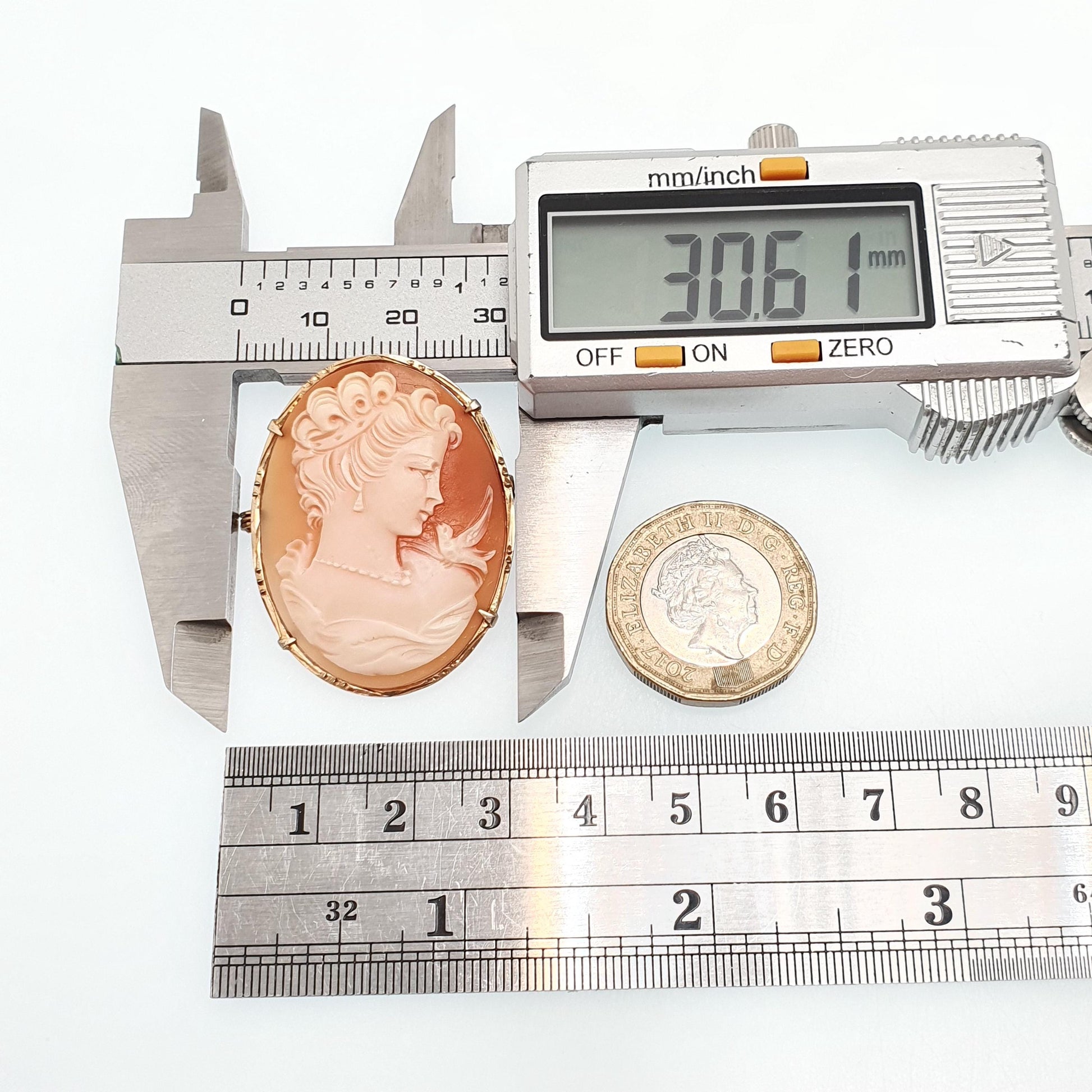 DESCRIPTION: A beautiful vintage solid silver gold vermeil cameo pendant/brooch, depicting a lady with a bird. The cameo is crisply detailed and is genuine hand carved shell. The frame is stamped "800" for silver and the item weighs 6.16g. The size dimensions are in the later photos.