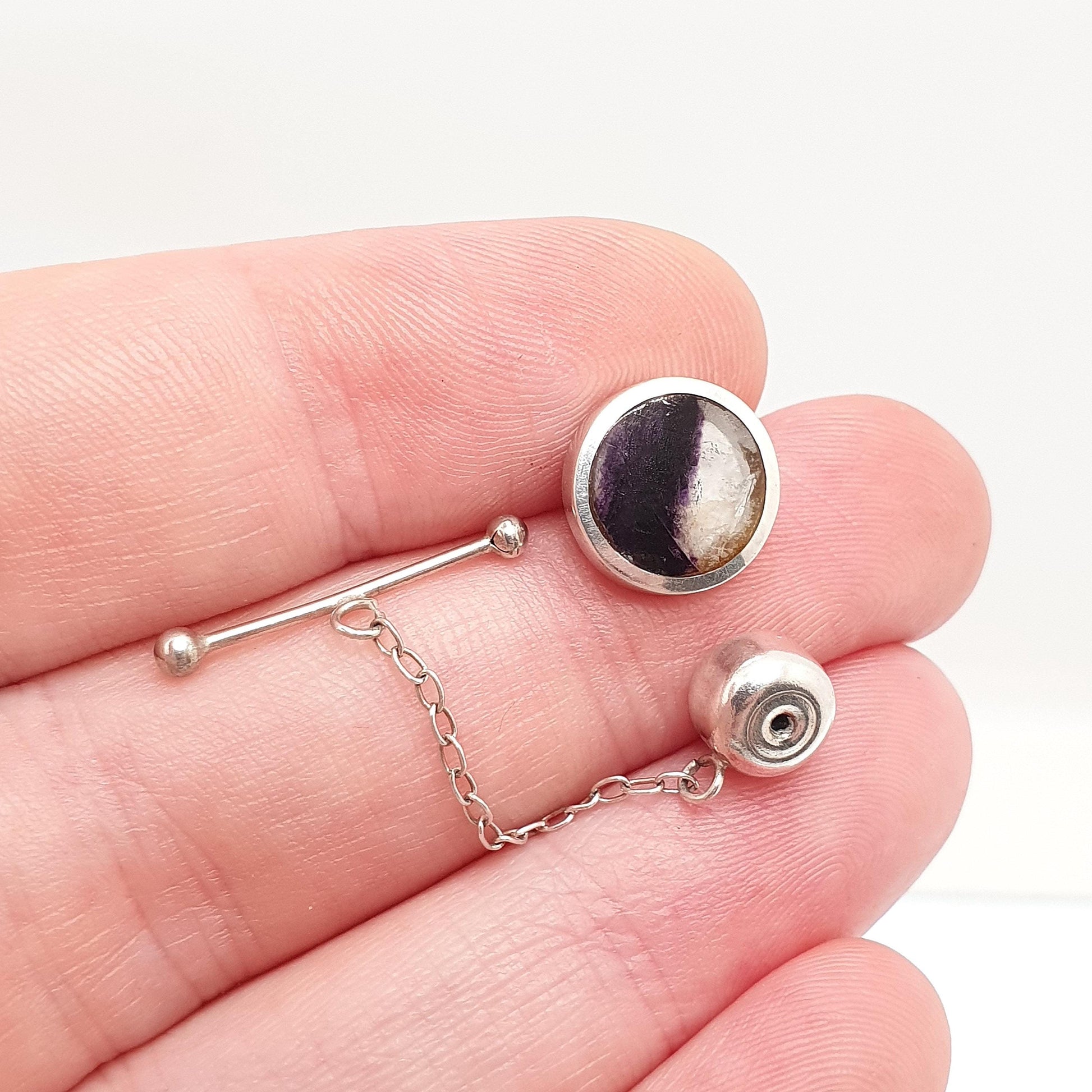 DESCRIPTION: A lovely vintage genuine blue john solid silver lapel pin. The item weighs approx. 2/57g and the size dimensions are in the later photos. It's stamped "SILVER" and the pin attaches securely.