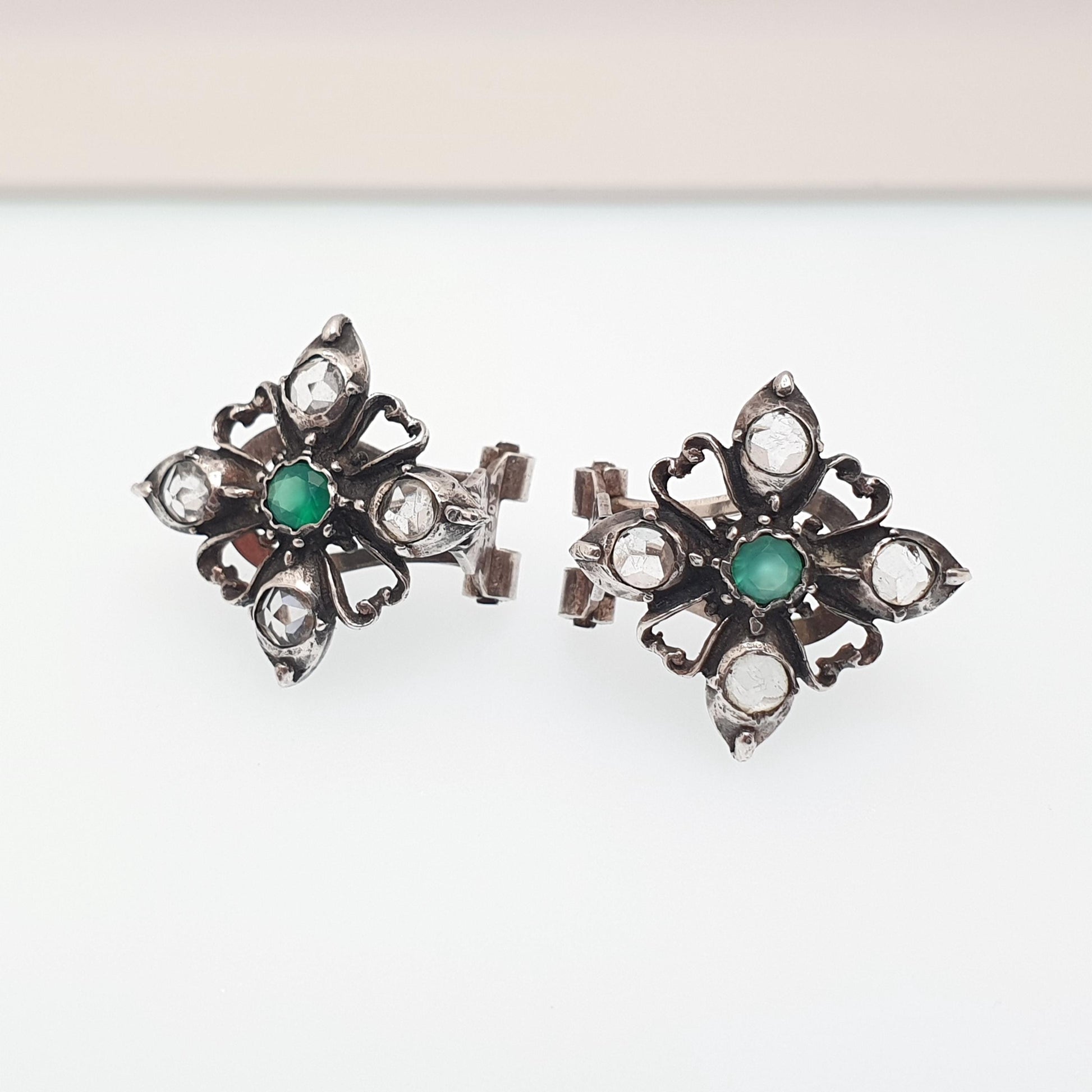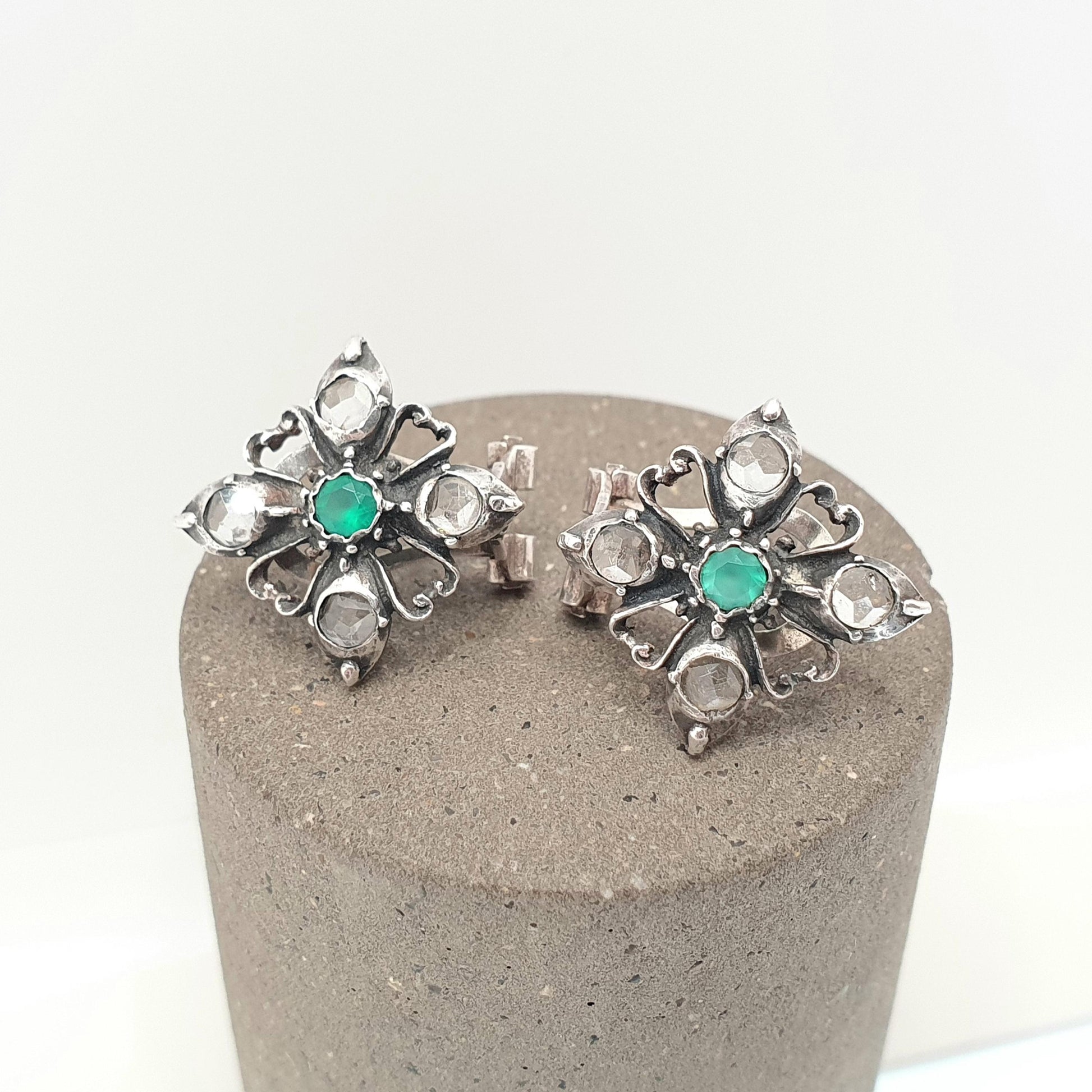 Vintage Solid Silver Emerald Earrings White Spinel Gemstone ART-JOY Stud Victorian Style Spanish Handmade Jewellery Jewelry