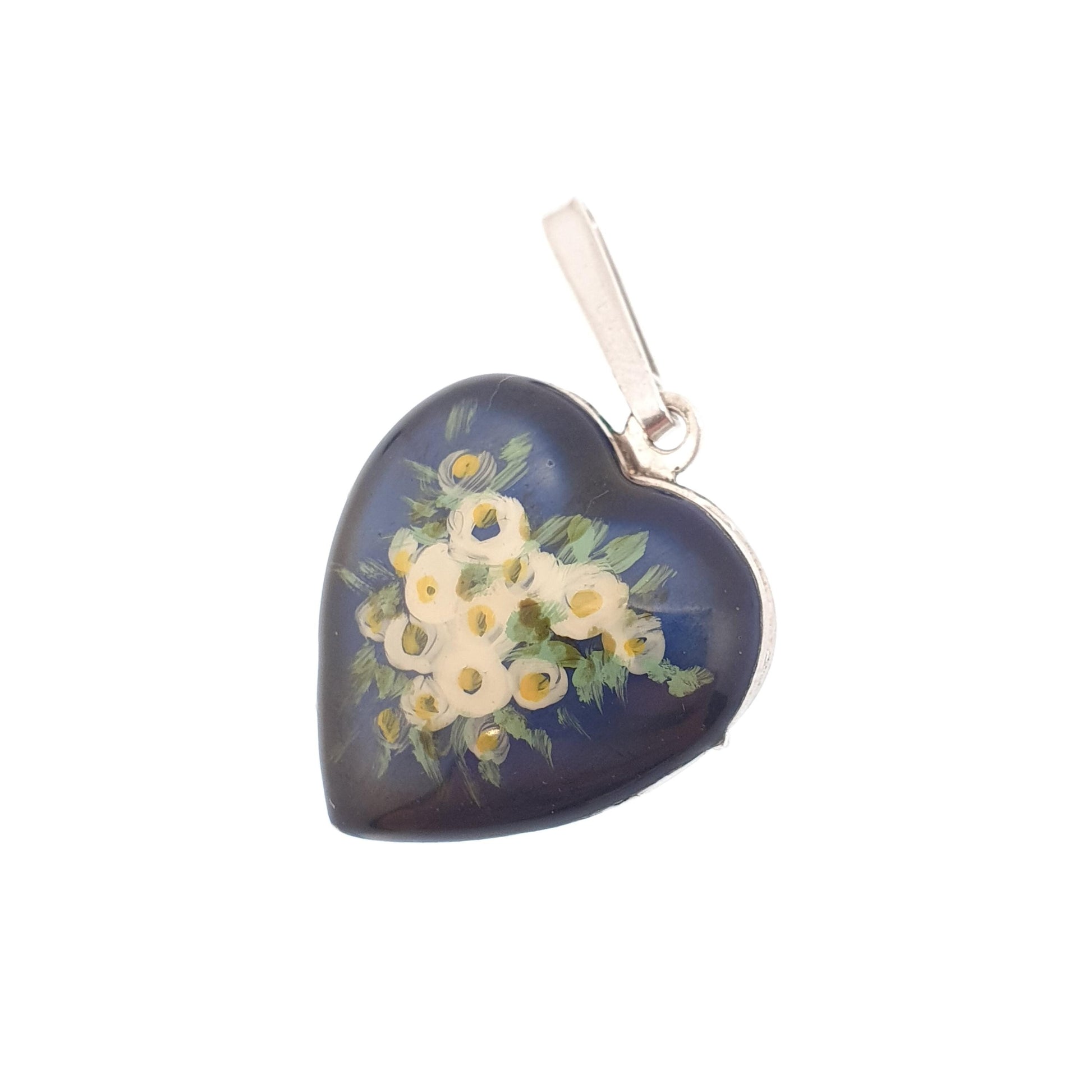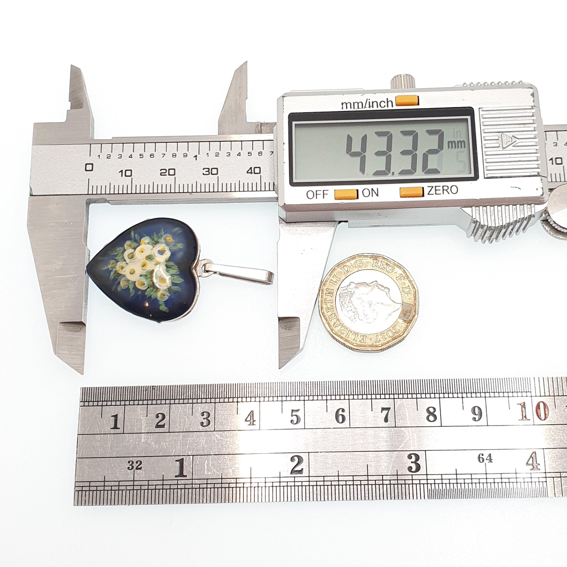 Vintage Solid Silver Enamel Heart Locket Hand Painted Navy Dark Blue Flowers Pendant Photo Picture Solid 925 Jewelry Jewellery