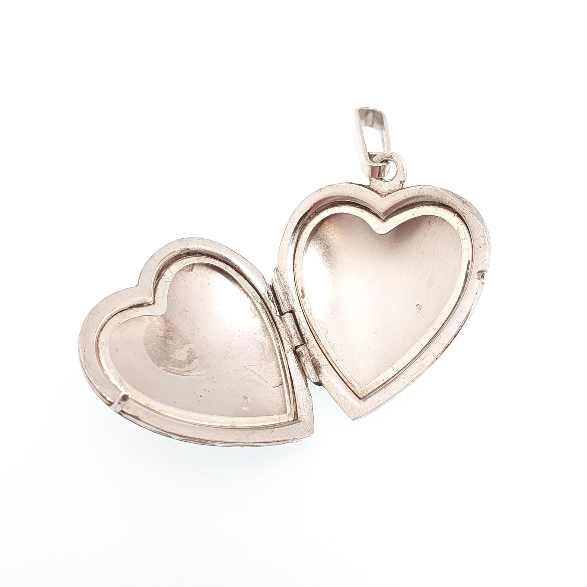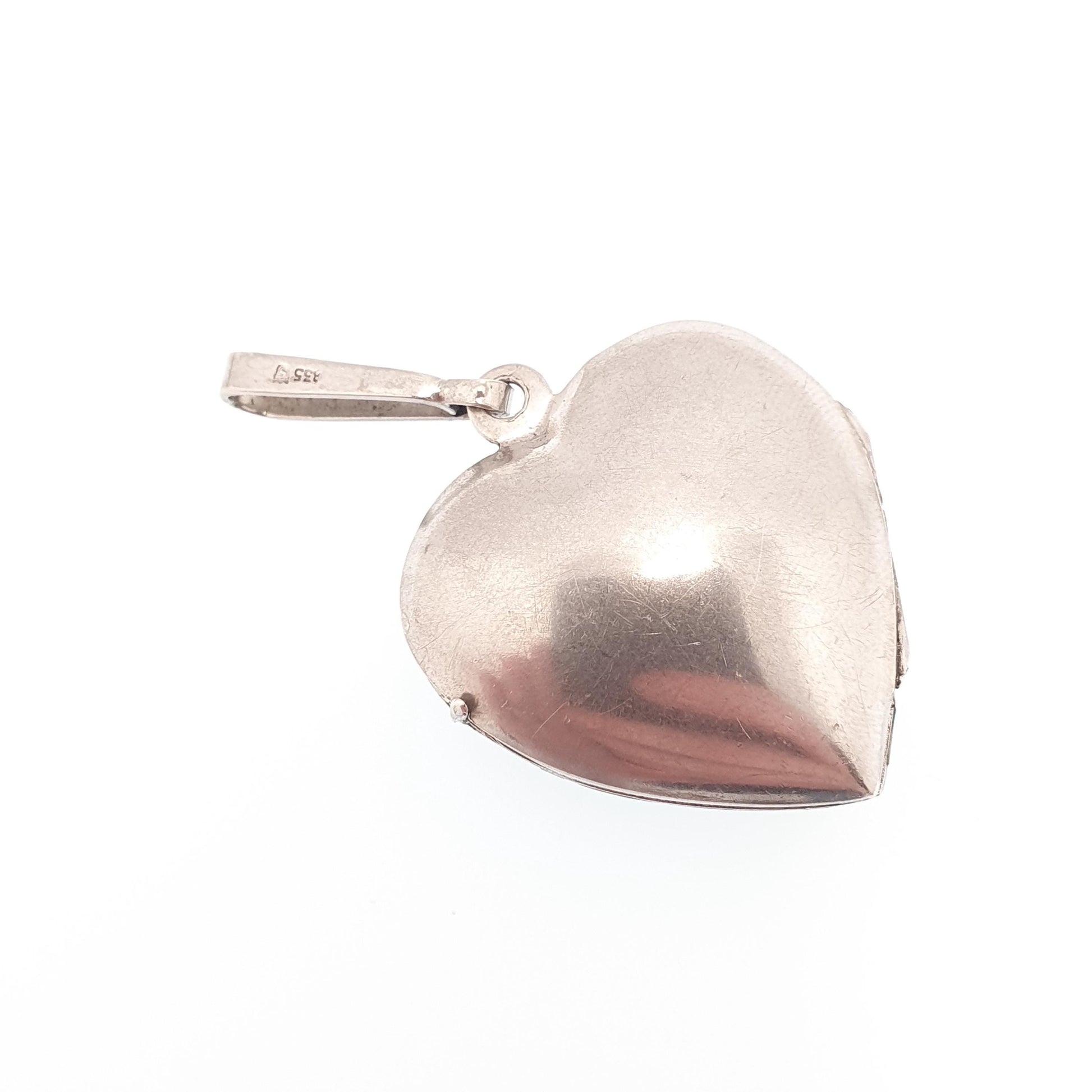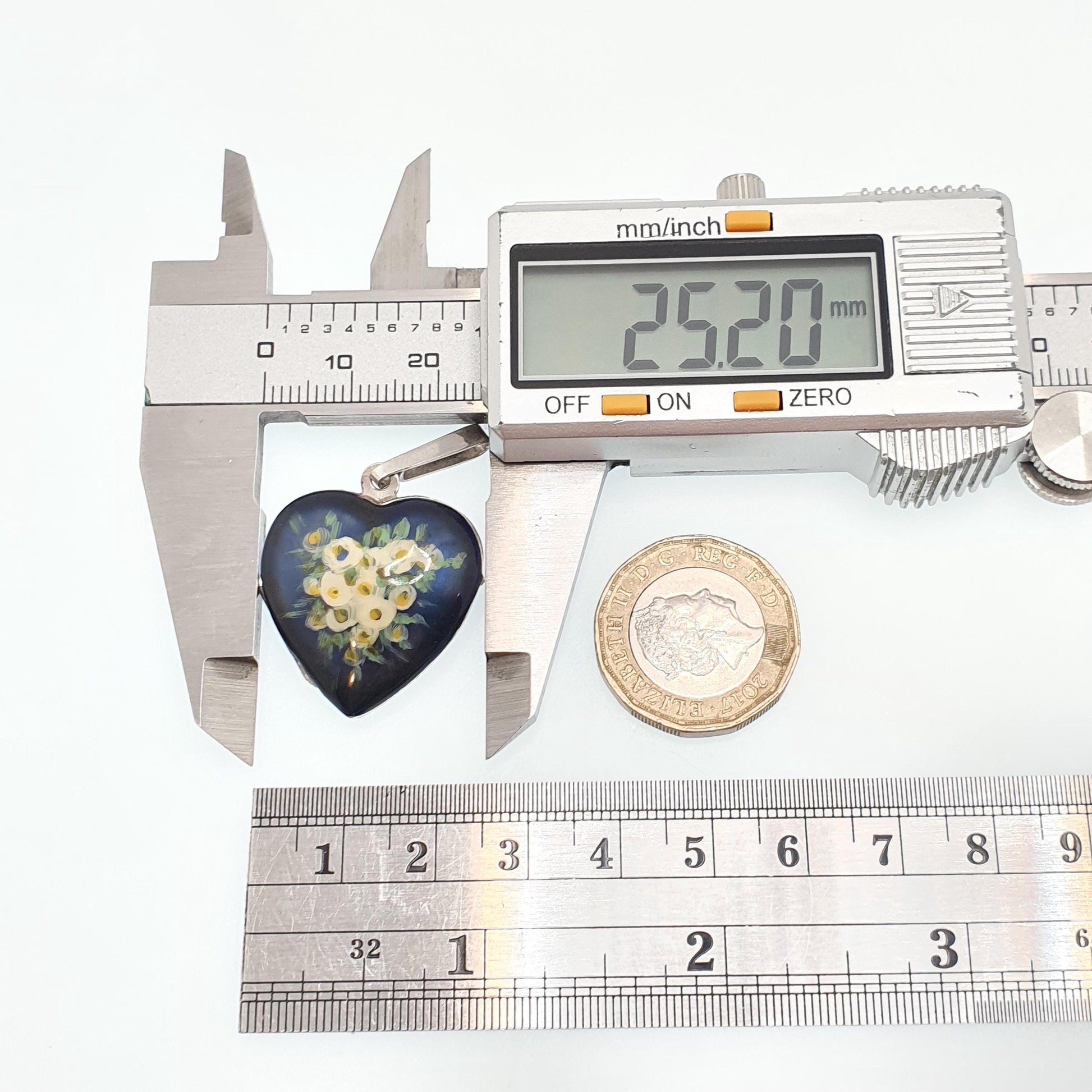 DESCRIPTION: A beautiful and well crafted vintage sterling silver heart locket, adorned with a gorgeous hand painted enamel front. The locket is stamped "835" for silver and opens/closes well. It has the picture retaining shims for both sides. The enamel is in good condition with no major missing sections, it has some minor wear near the point of the heart. The item weighs approx. 8.43g and the size dimensions are in the later photos.